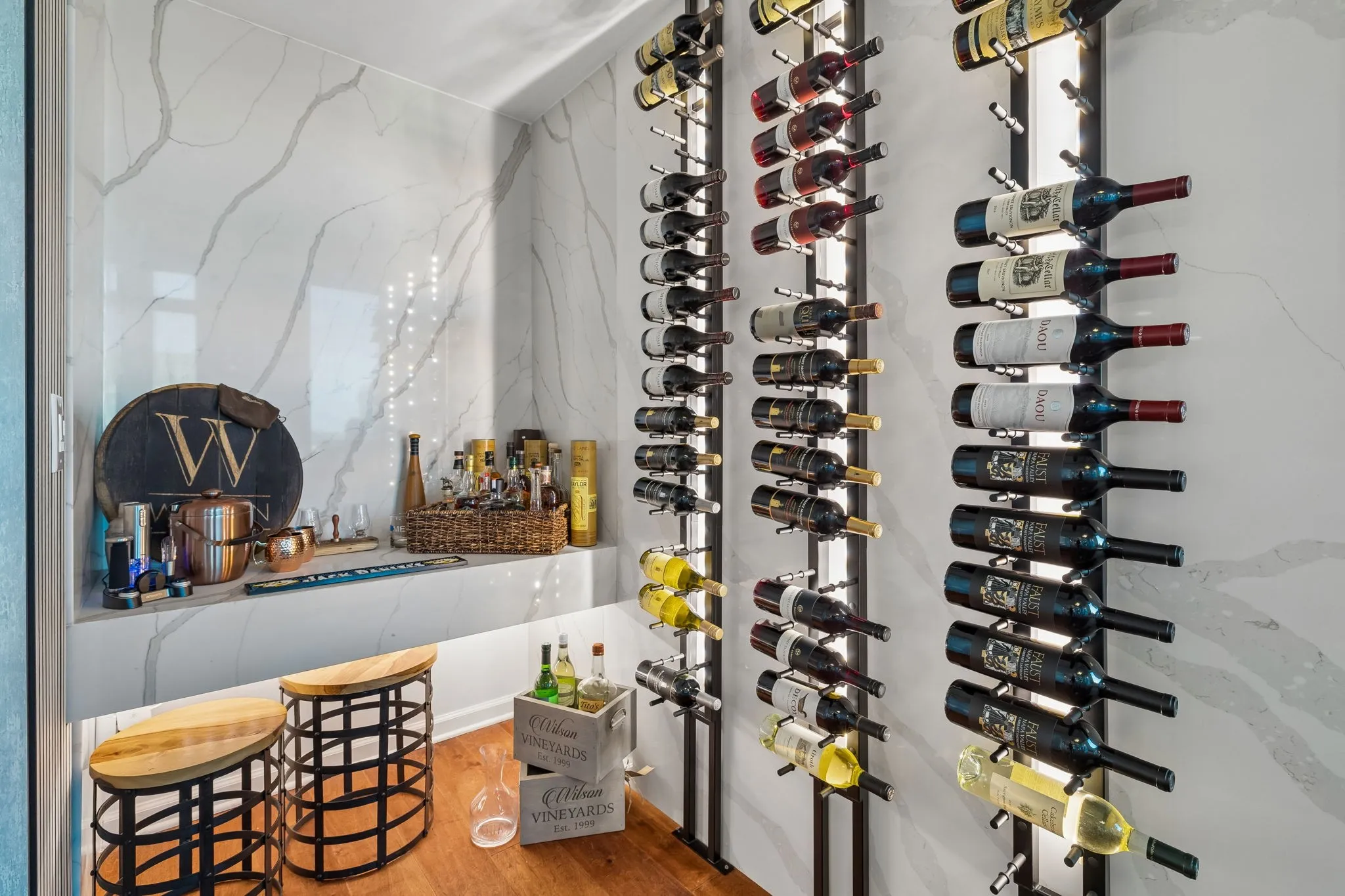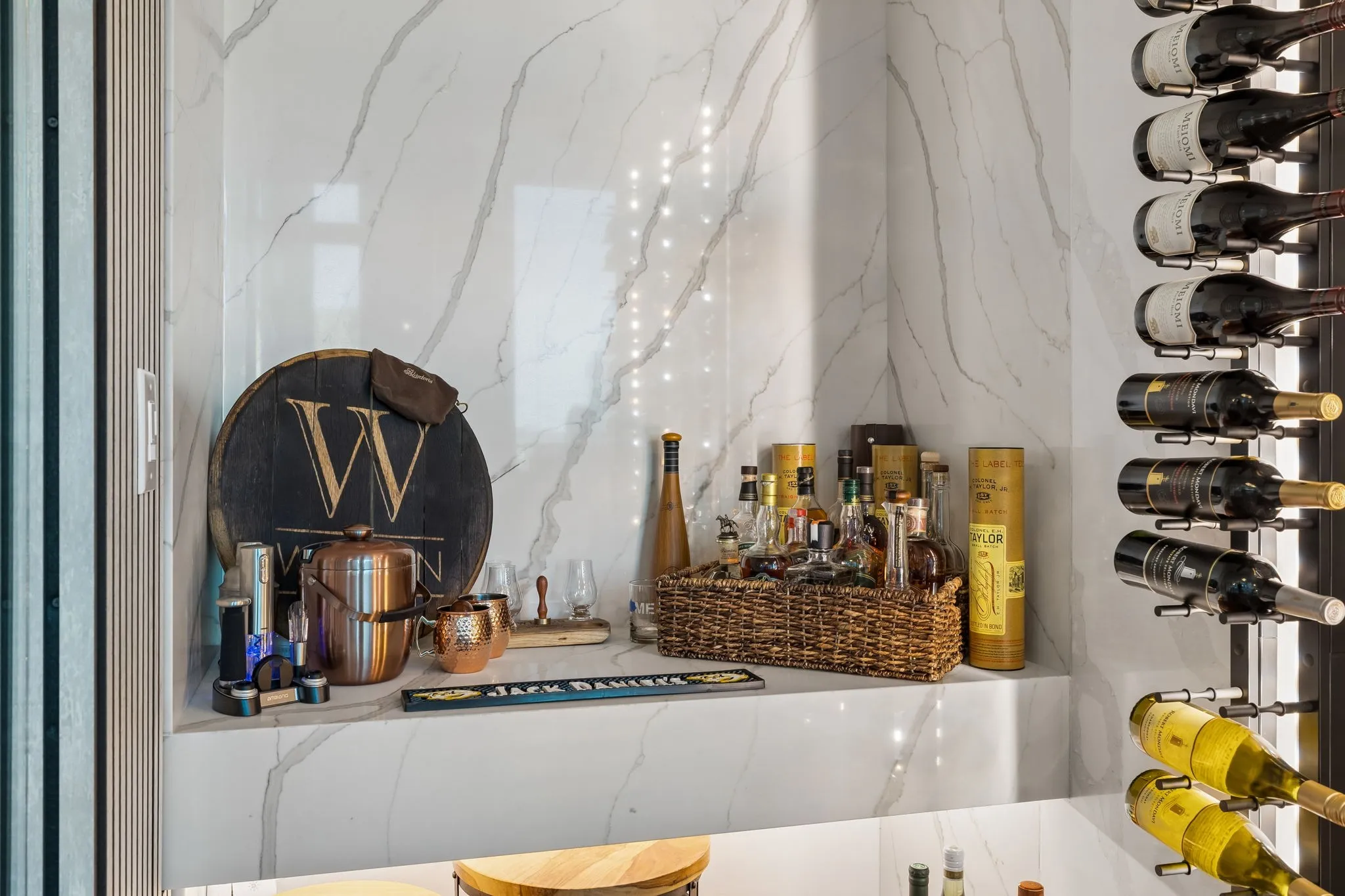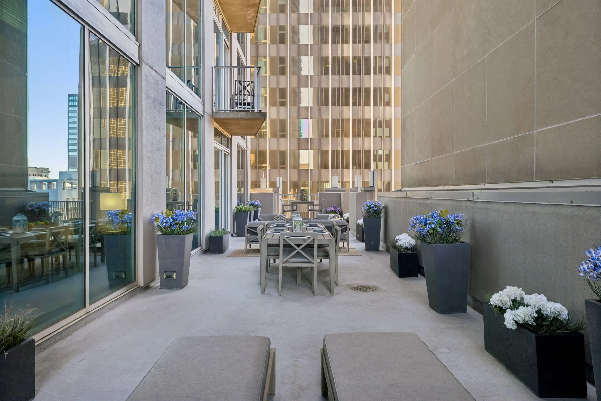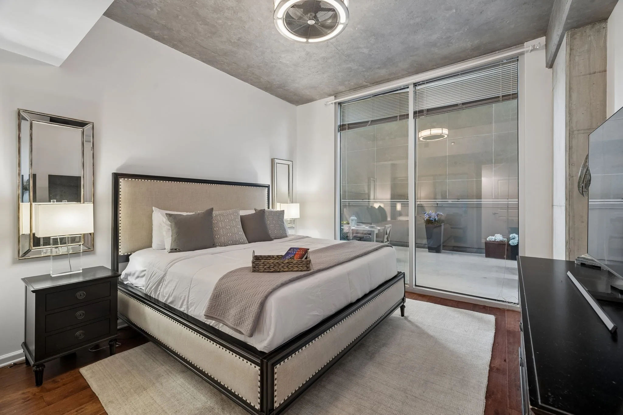 Inside, 10-ft ceilings and floor-to-ceiling windows flood the space with natural light, highlighting the warm, inviting tones throughout. The completely renovated kitchen features granite countertops and high-end stainless steel appliances, flowing seamlessly into a spacious living area designed for both relaxing and entertaining. Enjoy multiple conversation areas, an elegant glass-enclosed wine room, and a generous dining space—all complemented by breathtaking views of the city and Printer’s Alley.