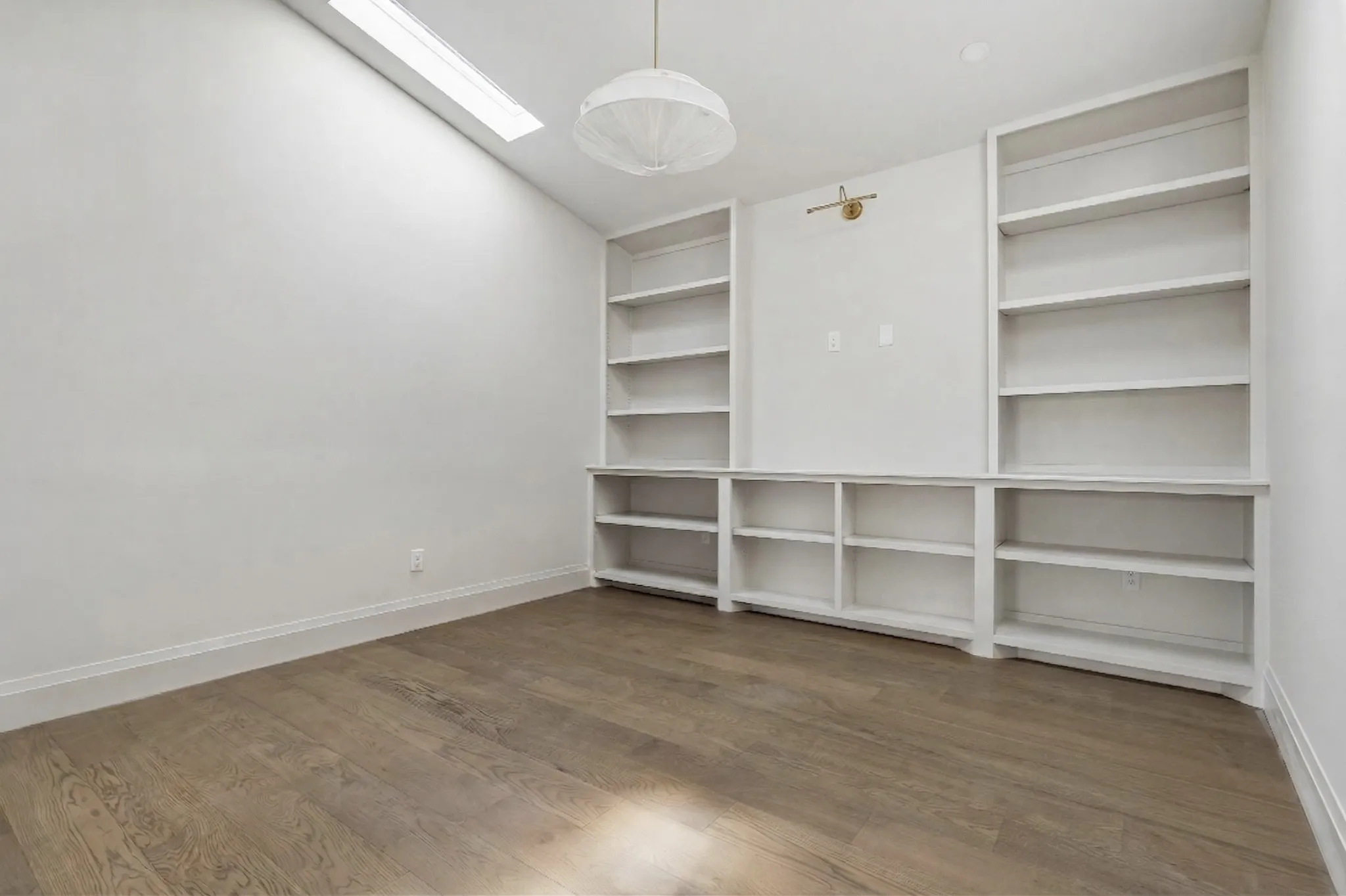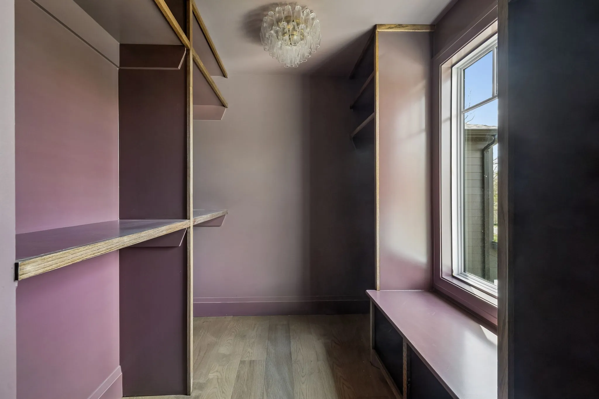 Upon reaching the upstairs landing, you’ll find an open loft with custom built-ins and skylights among two additional bedrooms. Sunlight pours into the ornately-detailed primary bedroom. Its spa-like bath, inspired by a five-star hotel, showcases imported green marble and botanical tiles in perfect contrast with the blush tone of the heated floors. The glamorous closet is trimmed with oak, chic lighting, and a rich mauve paint.