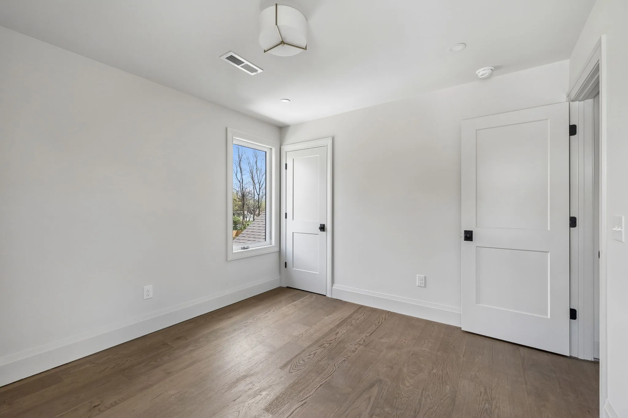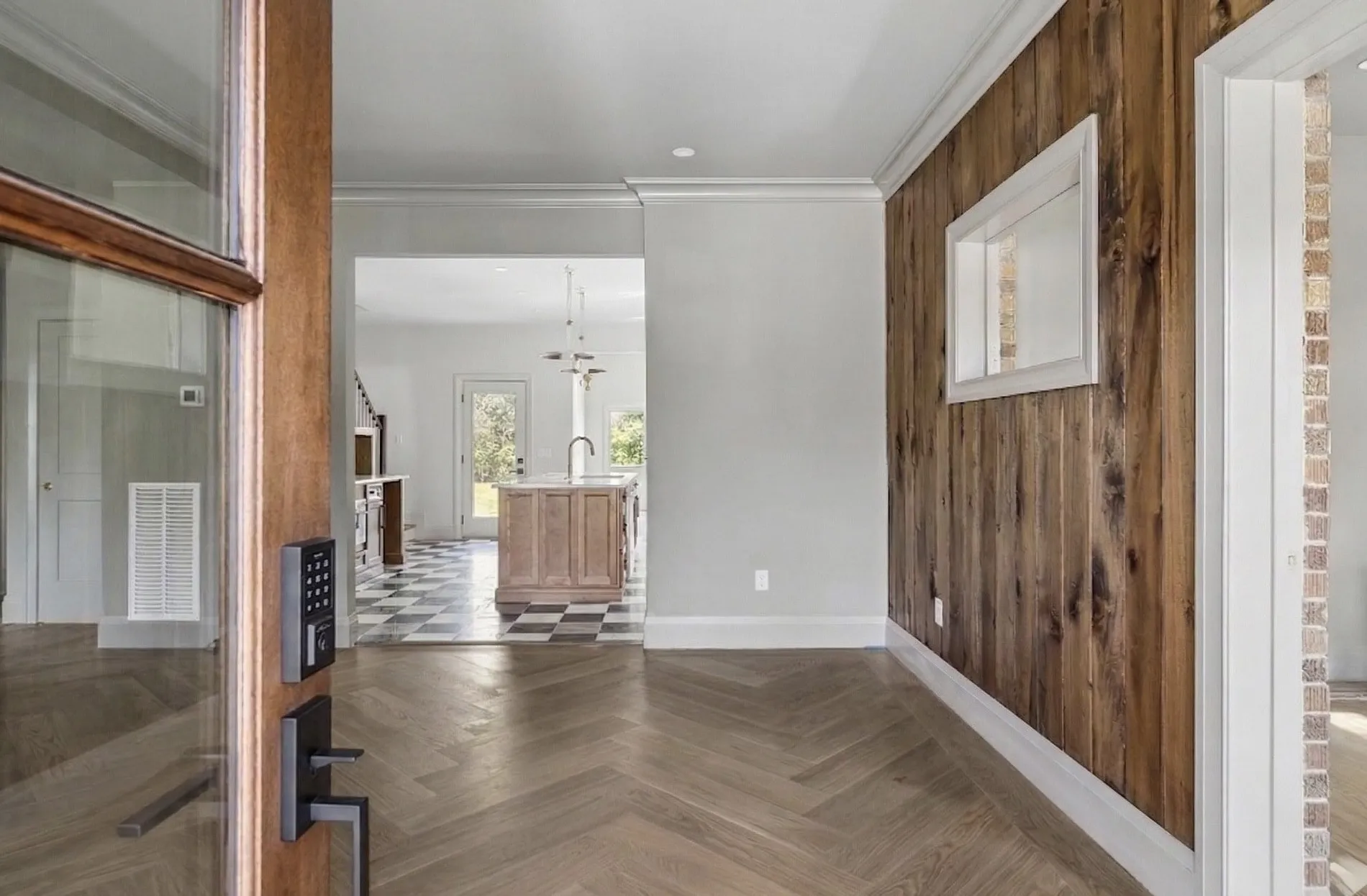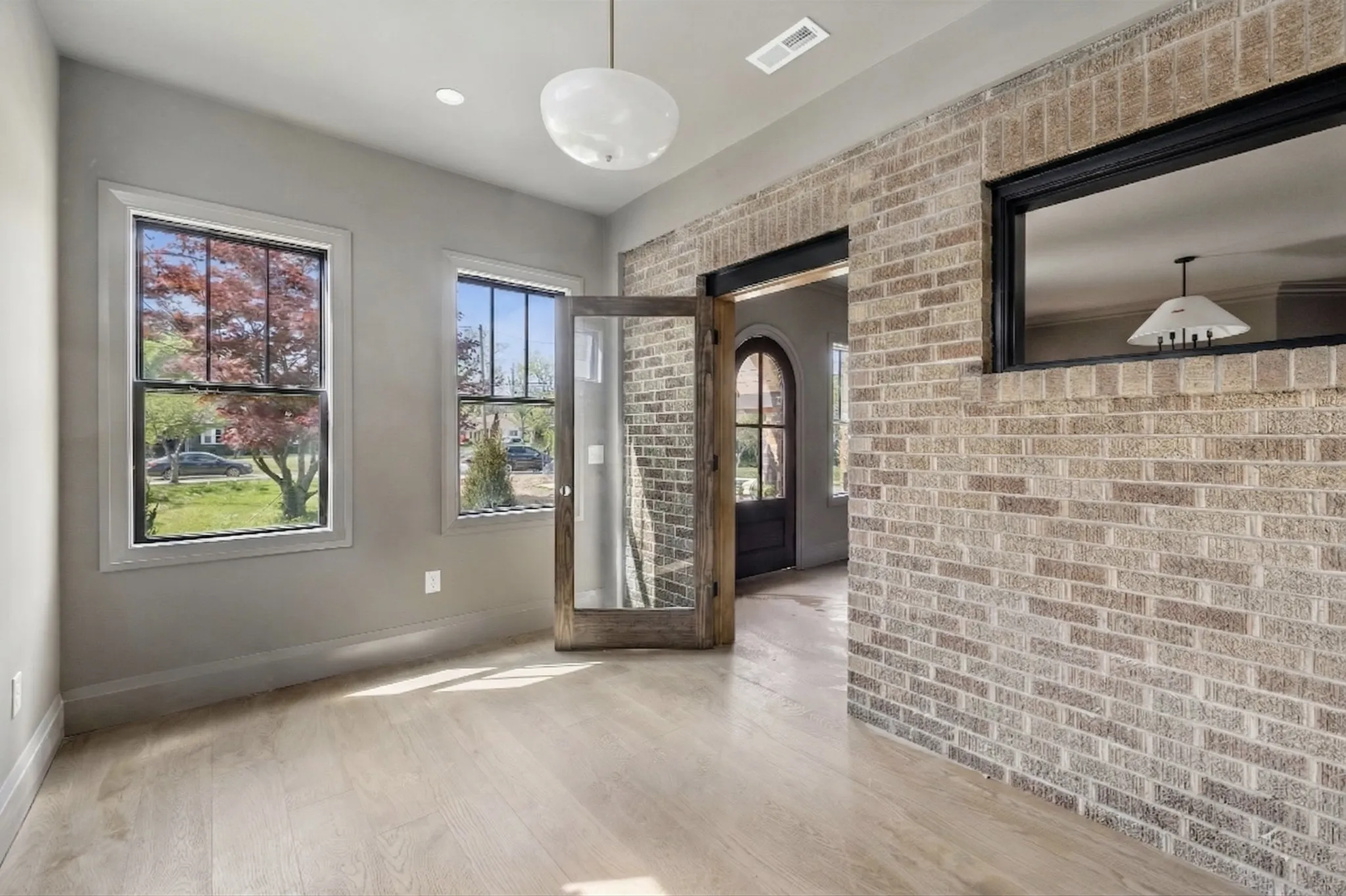 When crossing the threshold of the custom, arched mahogany door into the parlor, it’s clear that this historic home is one-of-a-kind. Tongue and groove poplar, an original accent window, and stone fireplace complement the herringbone wood flooring. Tucked off the entry, the former porch serves as a flexible space, accented with exposed brick and a passthrough window to the parlor.