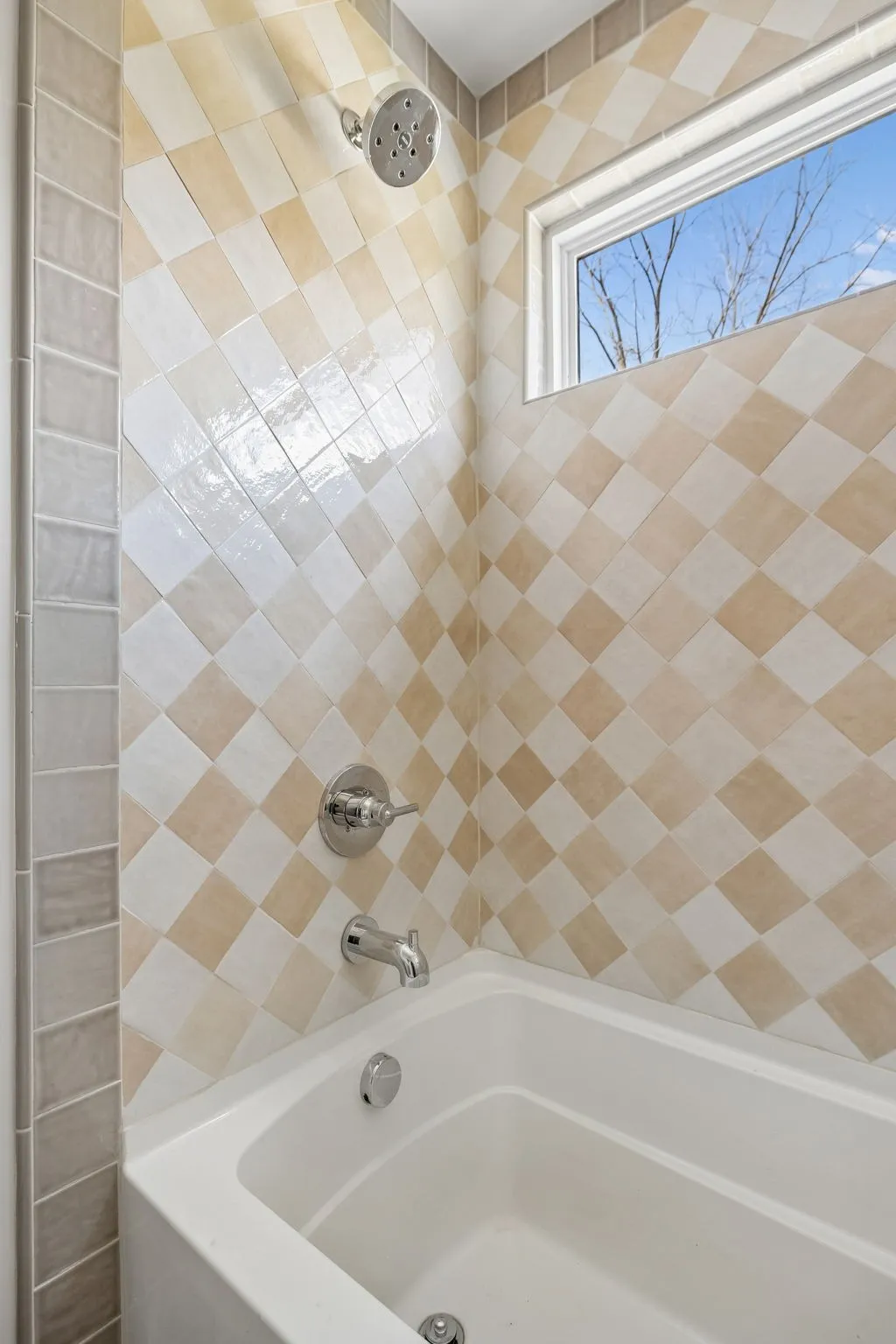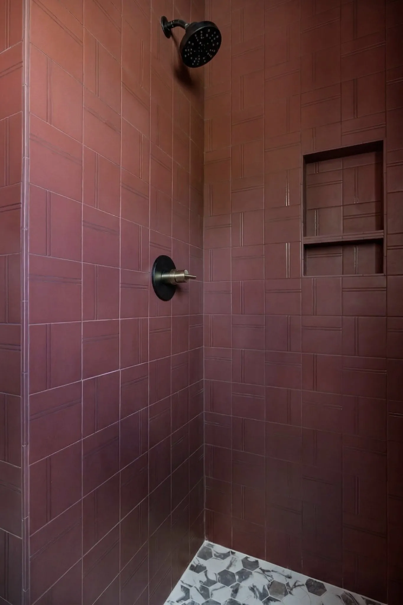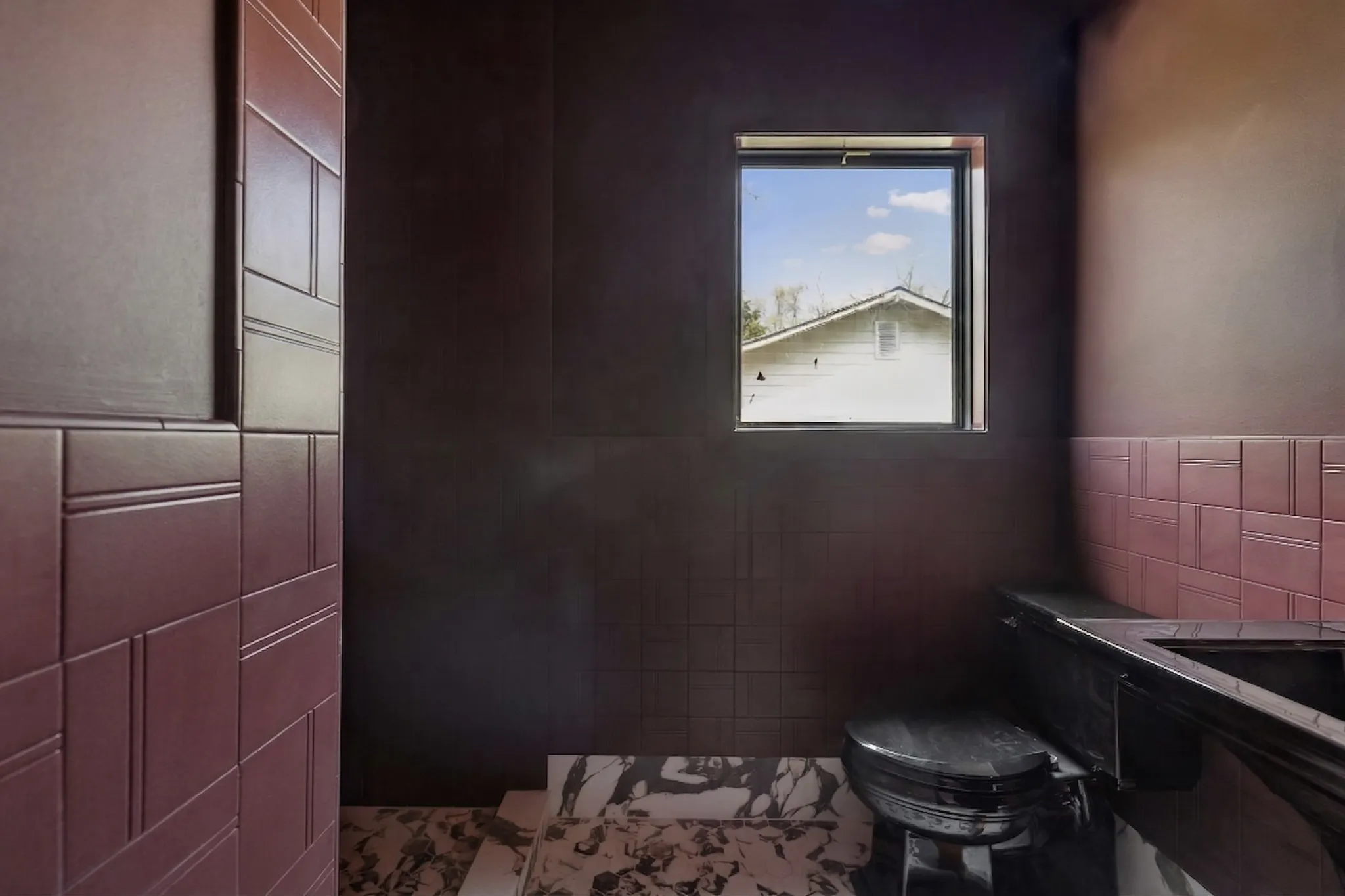 The dining room and hall bath are burgundy-laden showstoppers that are designed to impress. Marble baseboards and wraparound tile wainscot pay homage to vintage baths of the past with a cutting-edge modern style. The kitchen floor is in keeping with the same spirit- a vintage checkerboard with a marble-inspired twist. A warm, golden backsplash tile references the lemon hues of the home’s original kitchen. The cozy adjacent keeping room features oak built-ins, a modern fireplace, and vaulted ceilings.