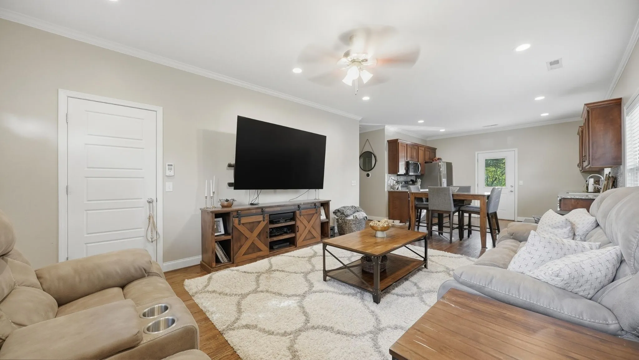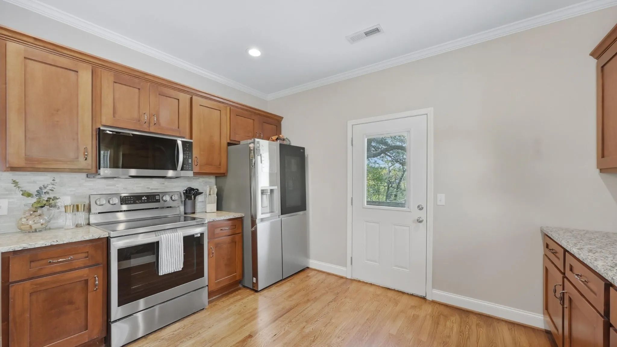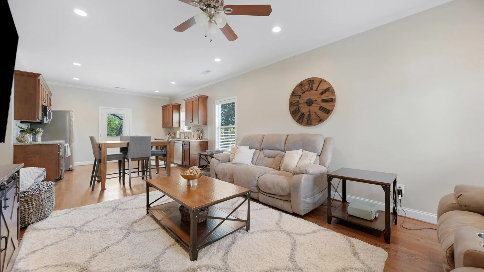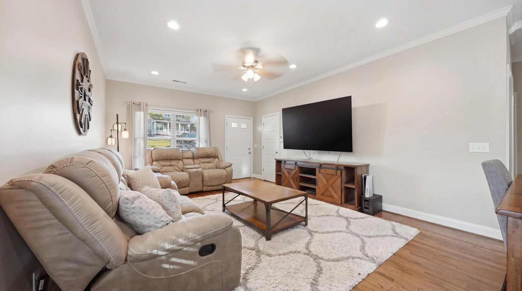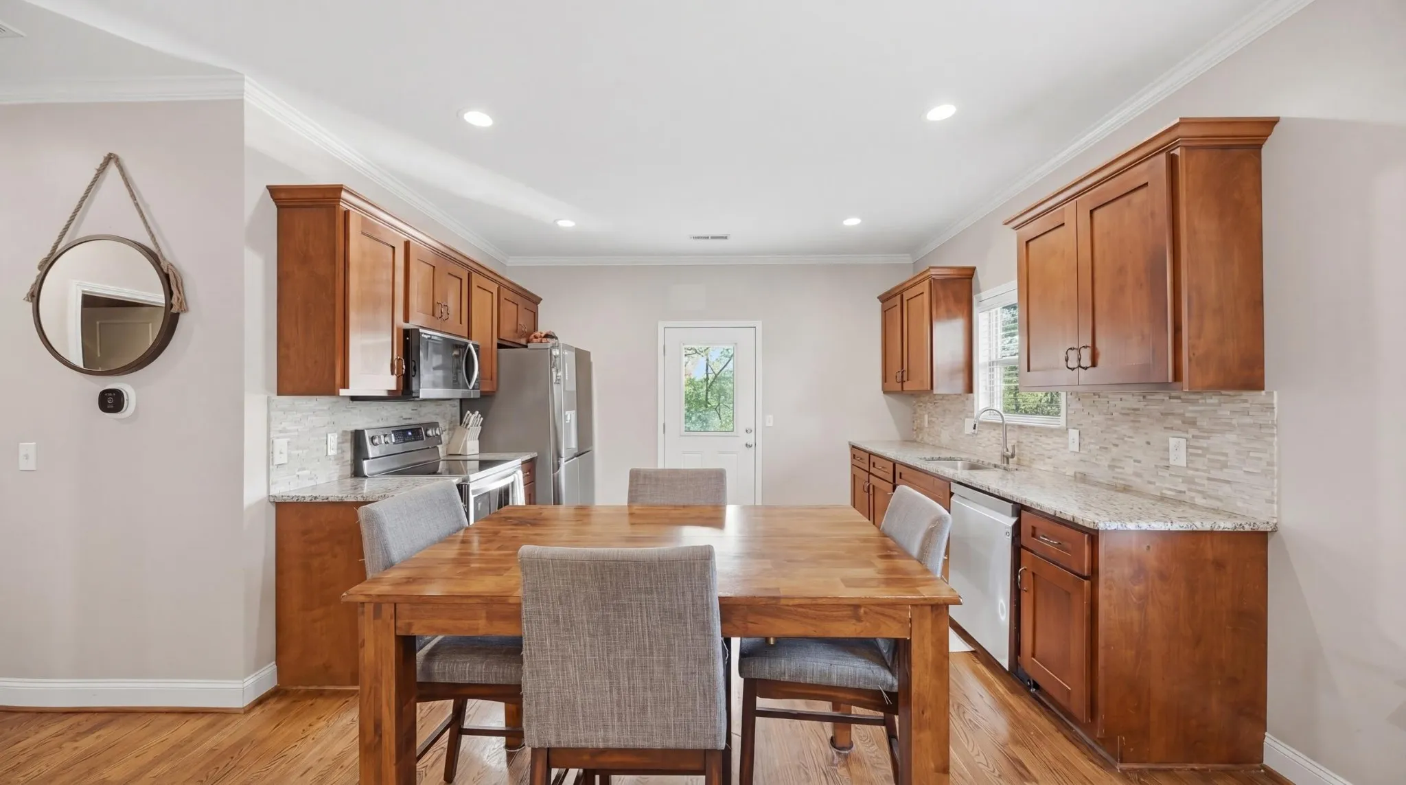 Outside, you’ve got an off-street 2-car parking pad, refreshed landscaping, and a fenced-in backyard. There’s also a deck off the kitchen, so grilling or eating outside is easy and actually gets used.