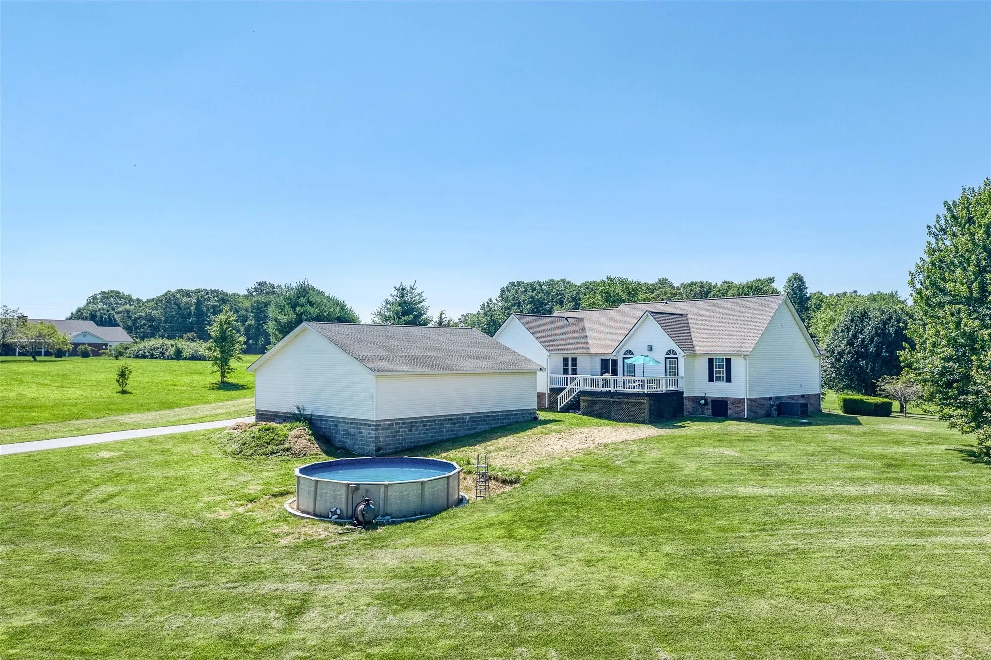 A finished bedroom in the attached garage provides flexible additional space. Added closets and bonus storage areas enhance functionality throughout the home. Outdoors, enjoy summer evenings on the large back deck or cool off in the above-ground pool.