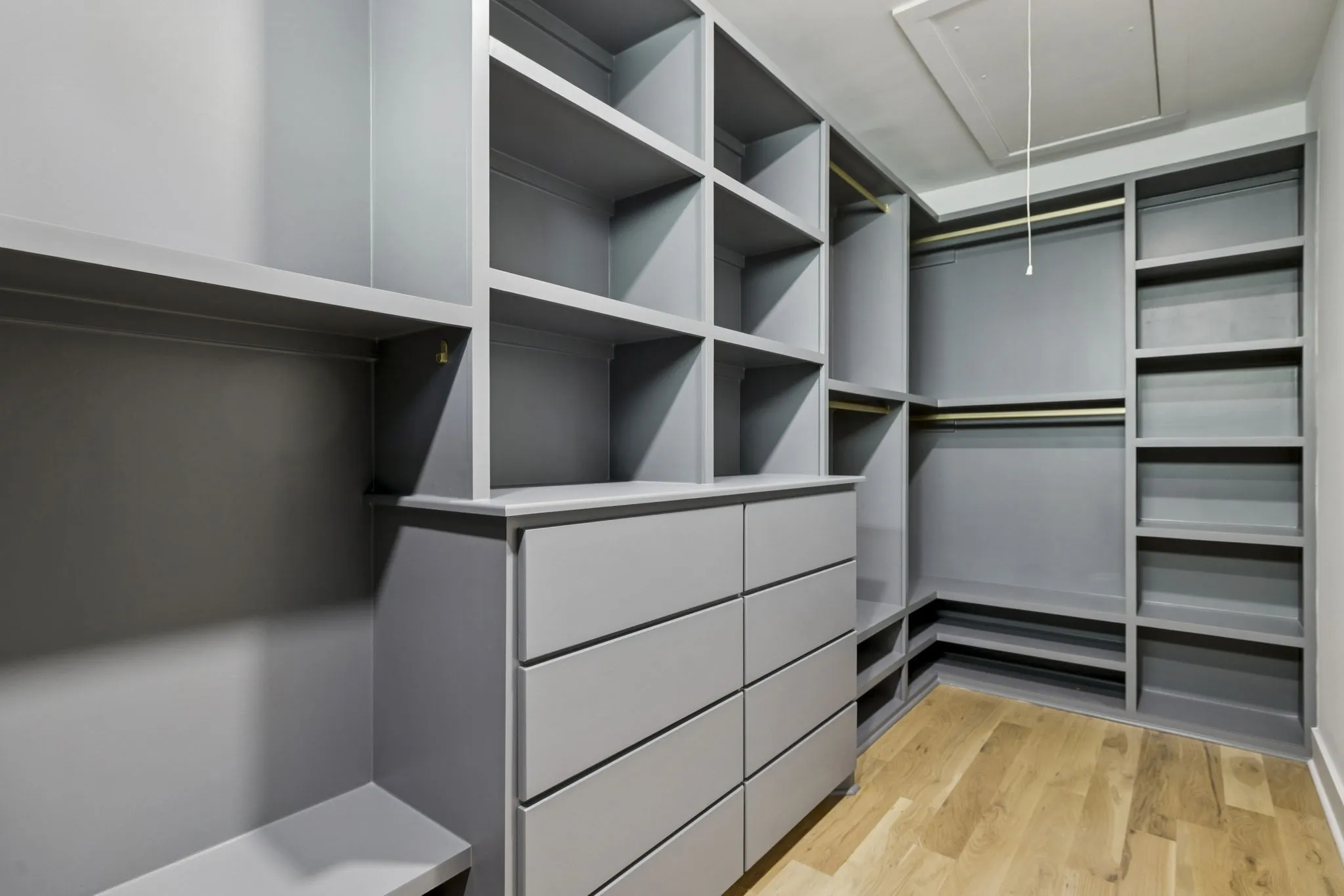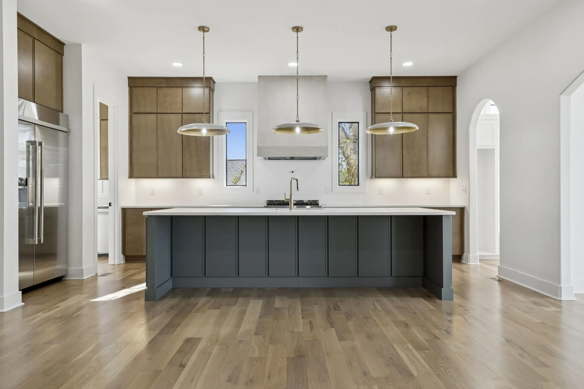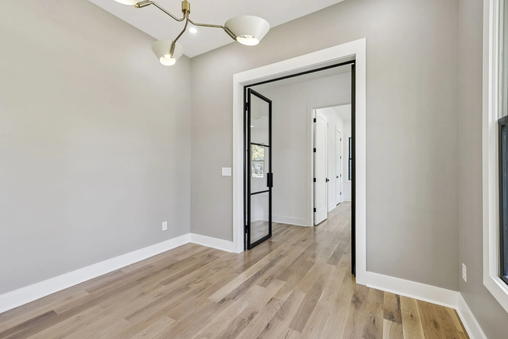 Chef’s kitchen features high-end stainless steel appliances, scullery, and separate dining room with wet bar. The formal office is framed by elegant steel doors, and custom-built closets provide abundant storage throughout. The primary suite includes a soaking tub and refined finishes.