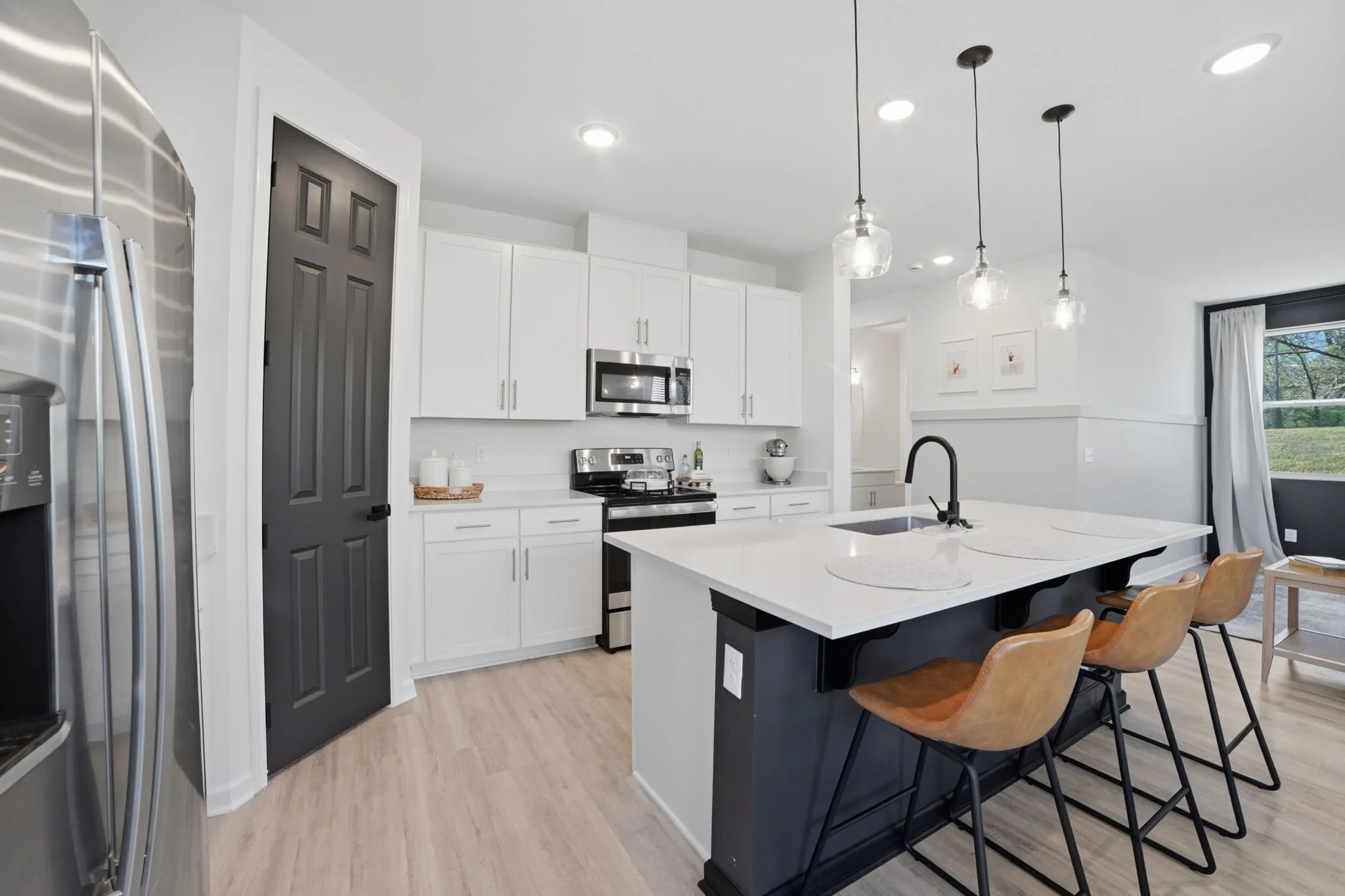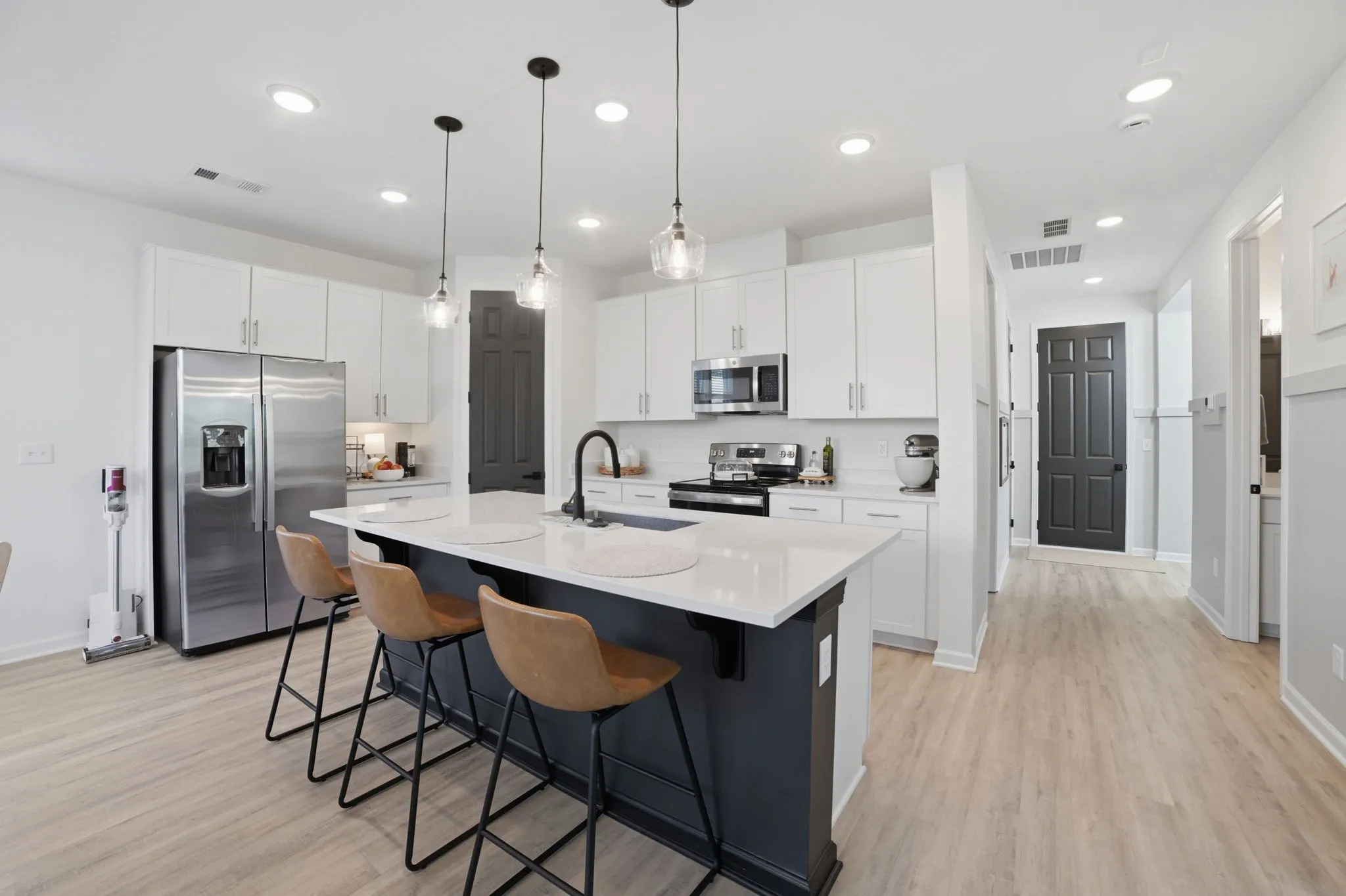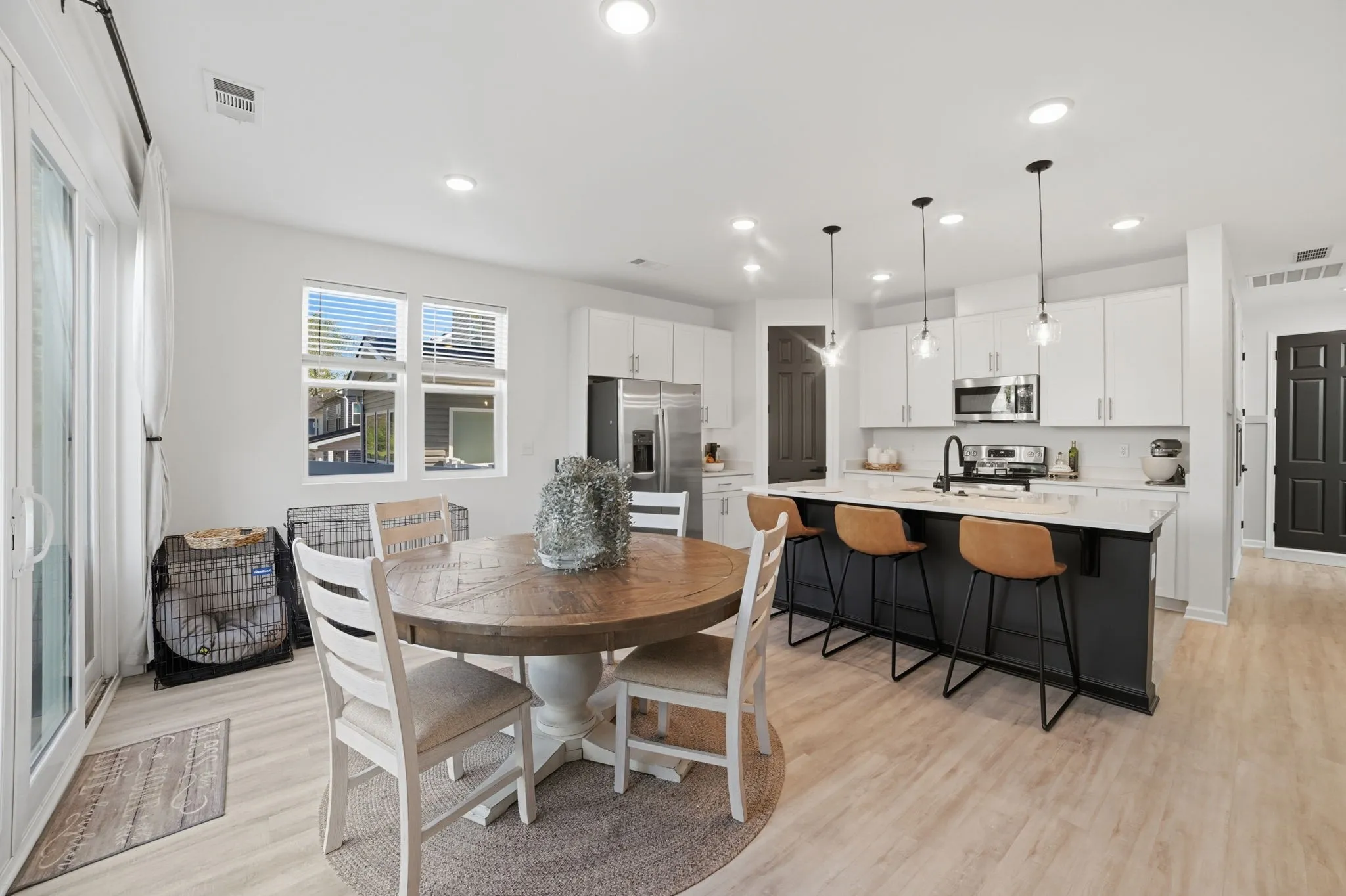 Welcome home to 121 Timber Crest Trail in White Bluff, a 4BR/3BA home in a great location with approximately 2,000 square feet of thoughtfully designed living space. The floor plan is flexible, featuring a main-level bedroom and full bath for easy living, plus a primary suite and two additional bedrooms and two more full baths upstairs, and an upstairs laundry room. An open foyer with a drop zone leads into a bright, open living/dining/kitchen area centered around a large island with seating, while a walk-in pantry provides extra storage and convenience. A two-car garage with shelving rounds out the practical side of this home. The low-maintenance yard includes a small rear patio ideal for grilling or relaxing outdoors.