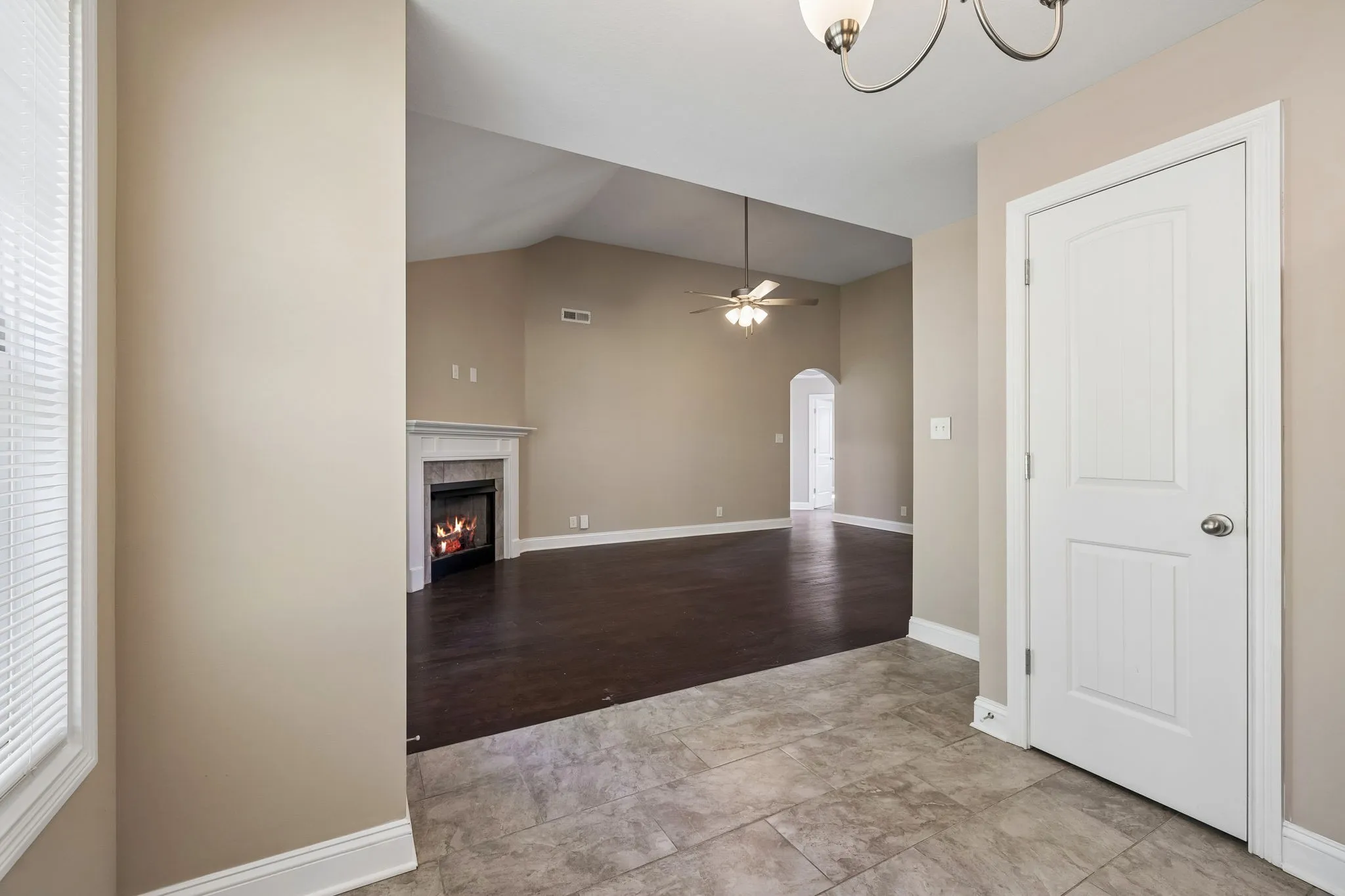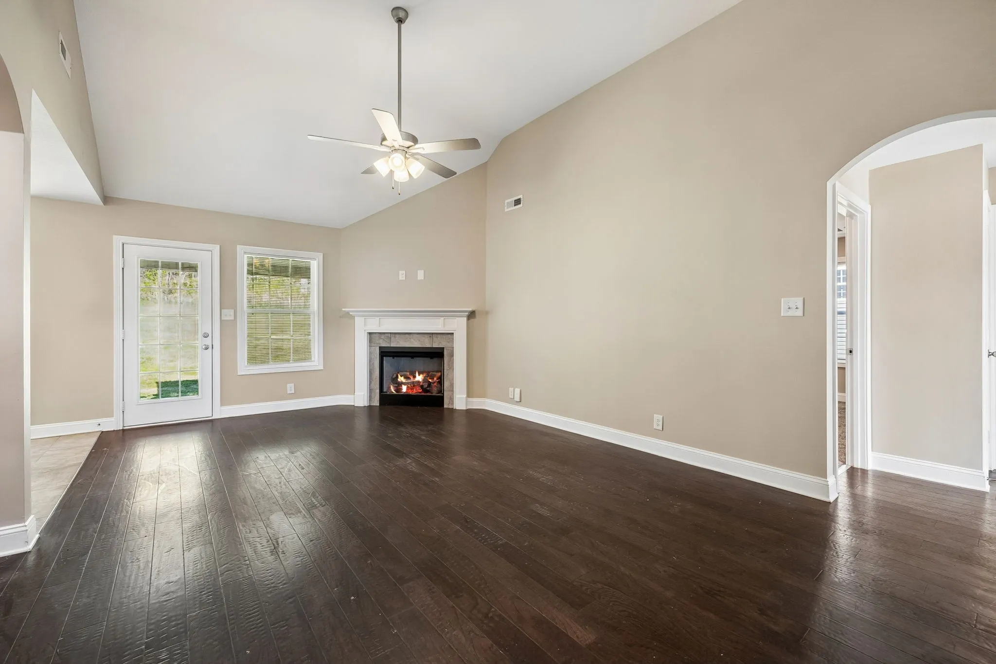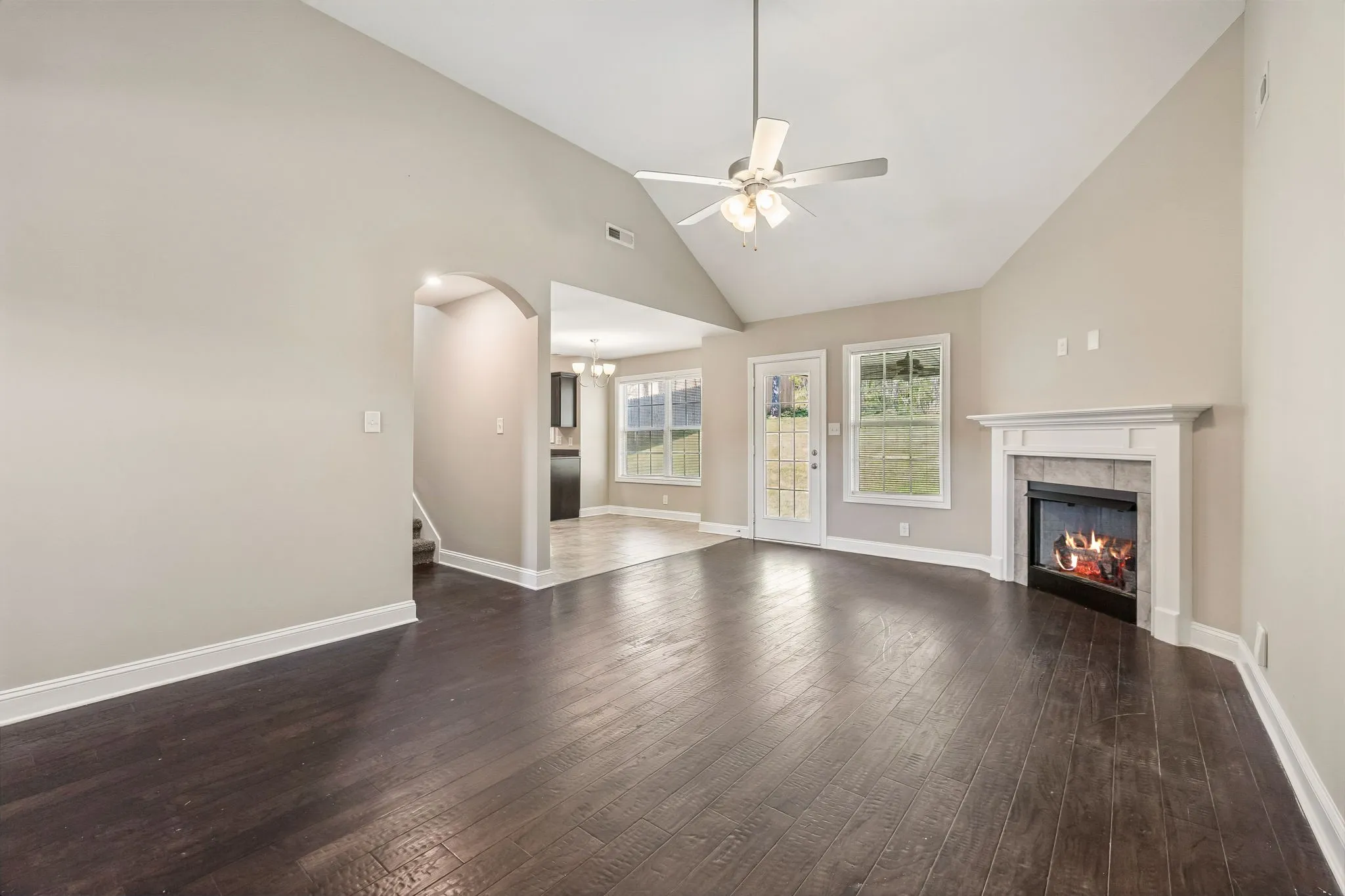 3-bedroom, 2-bath home in Timber Springs in Clarksville, built in 2020. Featuring vaulted ceilings and an open-concept layout, the main living area flows seamlessly into a functional kitchen with ample cabinetry and stainless steel appliances perfect