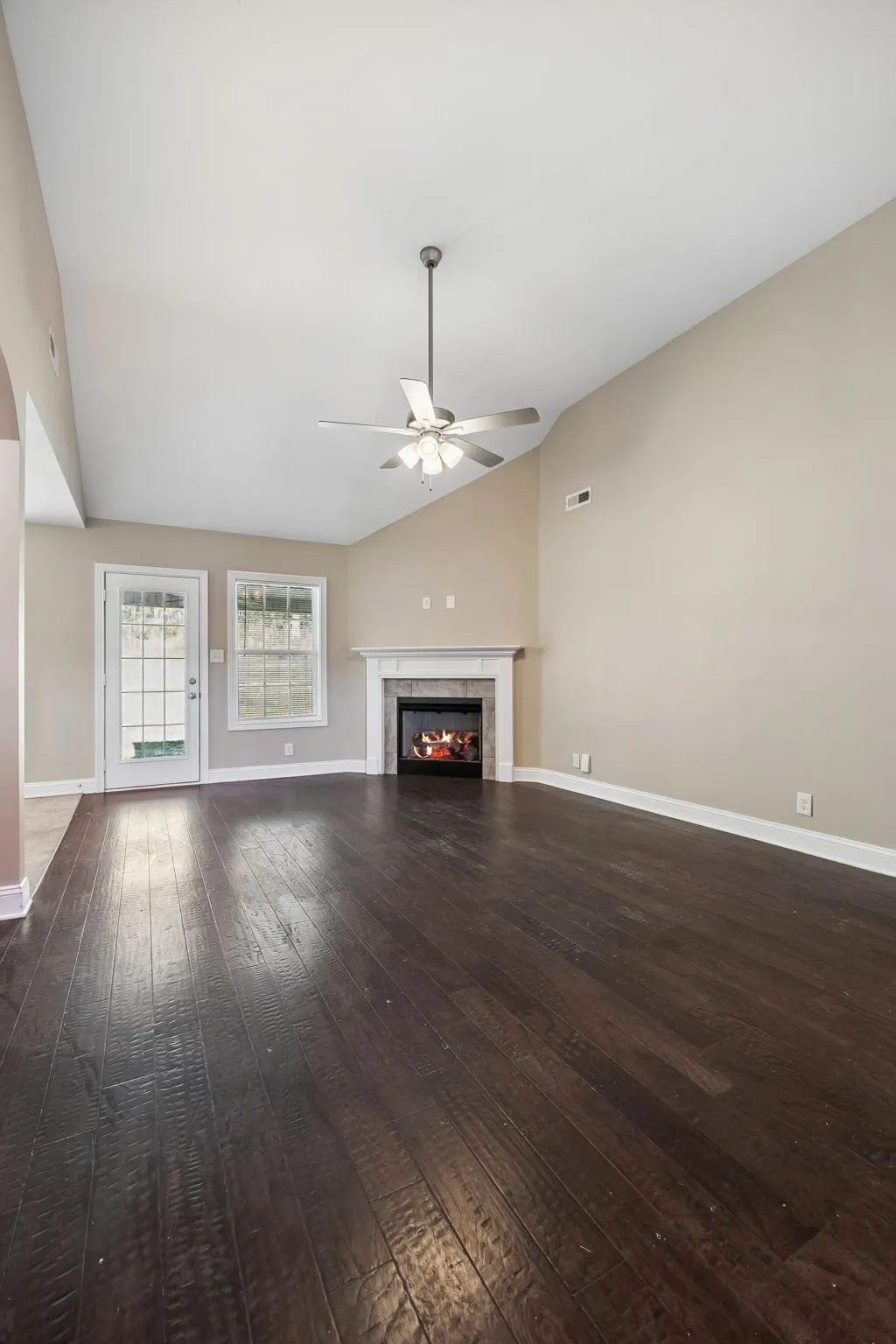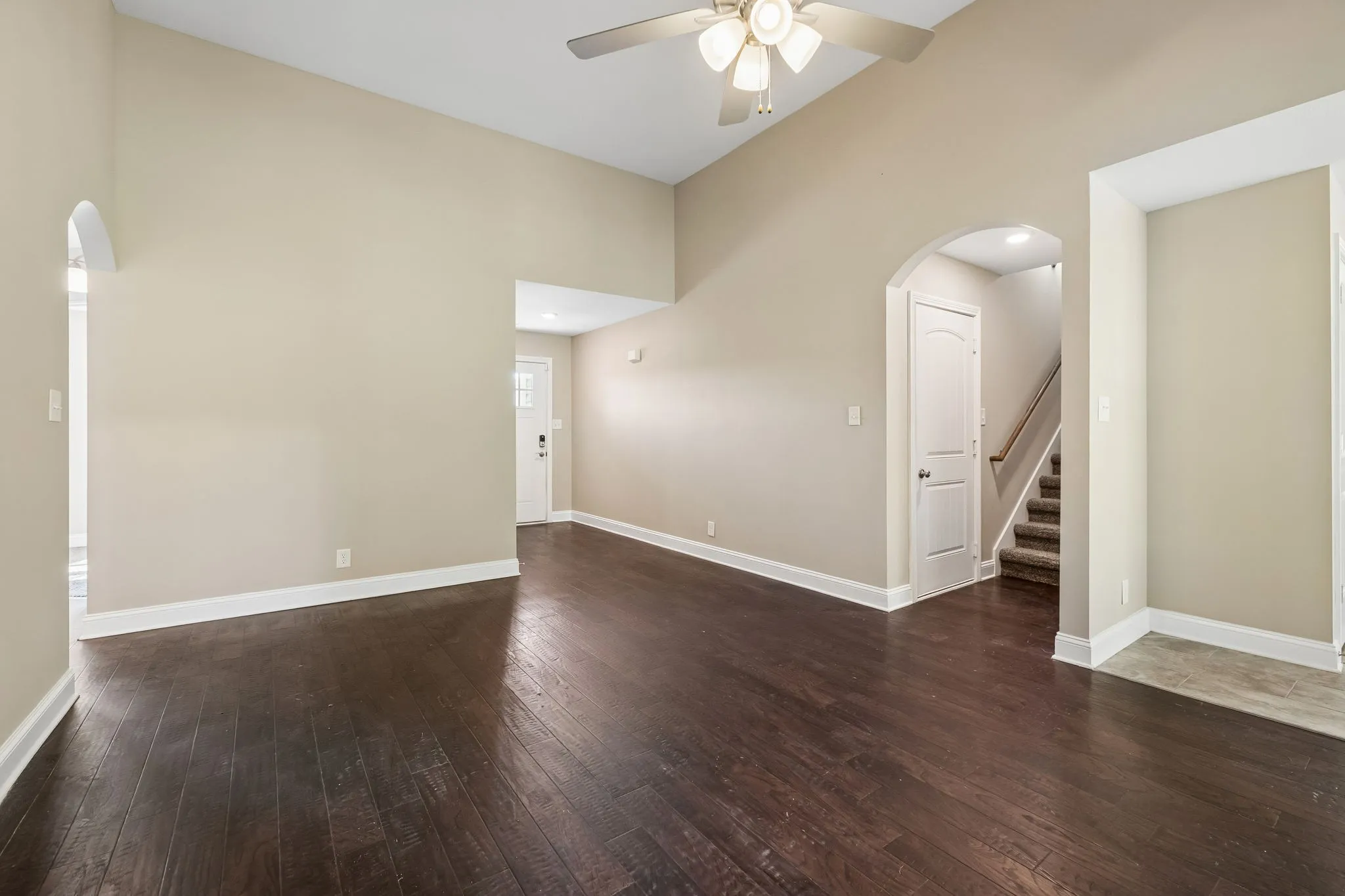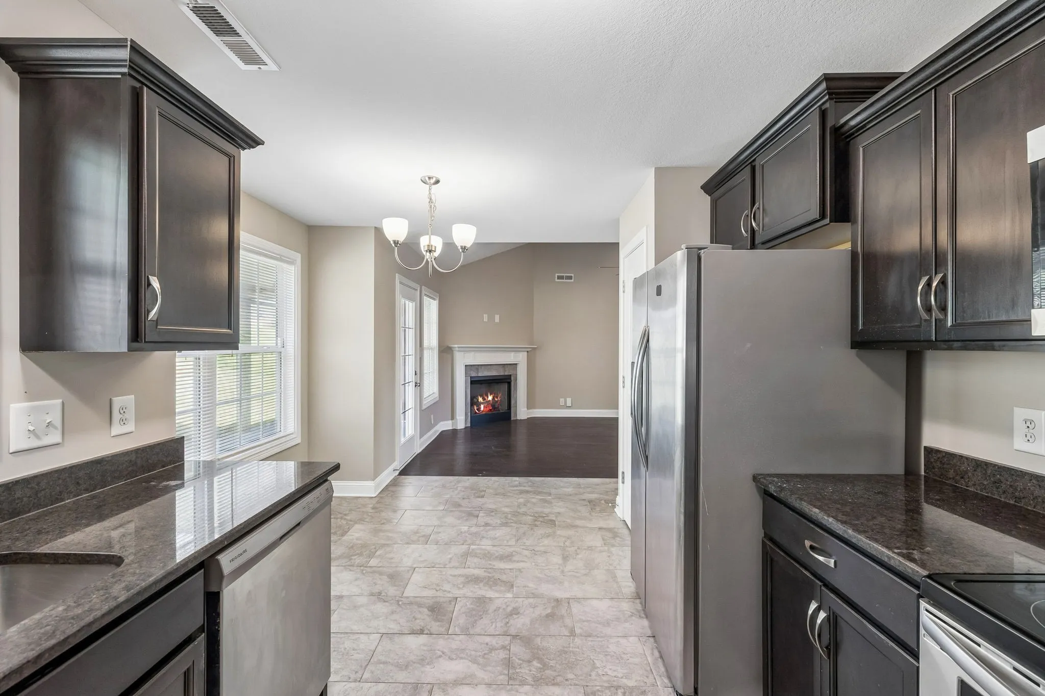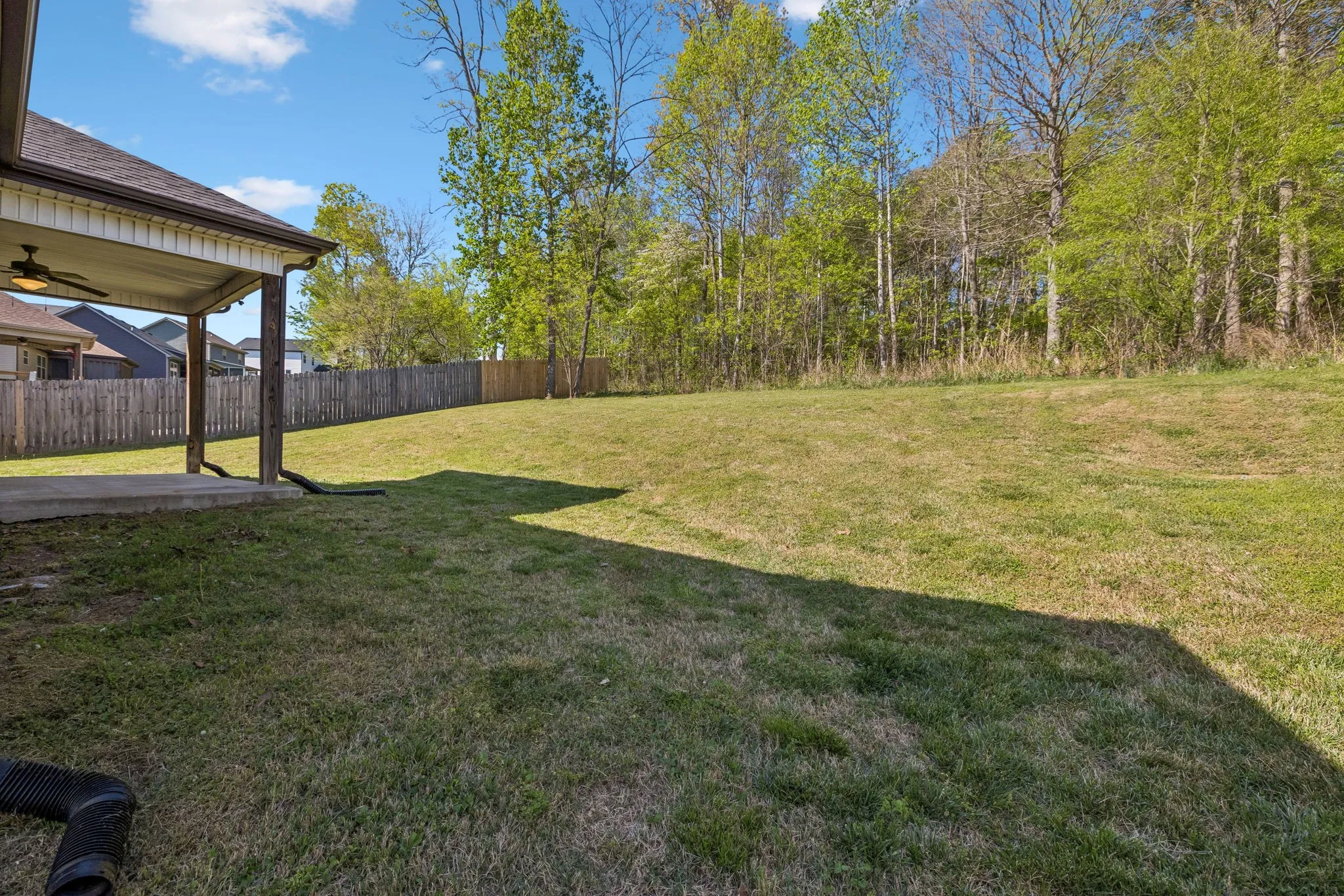3-bedroom, 2-bath home in Timber Springs in Clarksville, built in 2020. Featuring vaulted ceilings and an open-concept layout, the main living area flows seamlessly into a functional kitchen with ample cabinetry and stainless steel appliances perfect