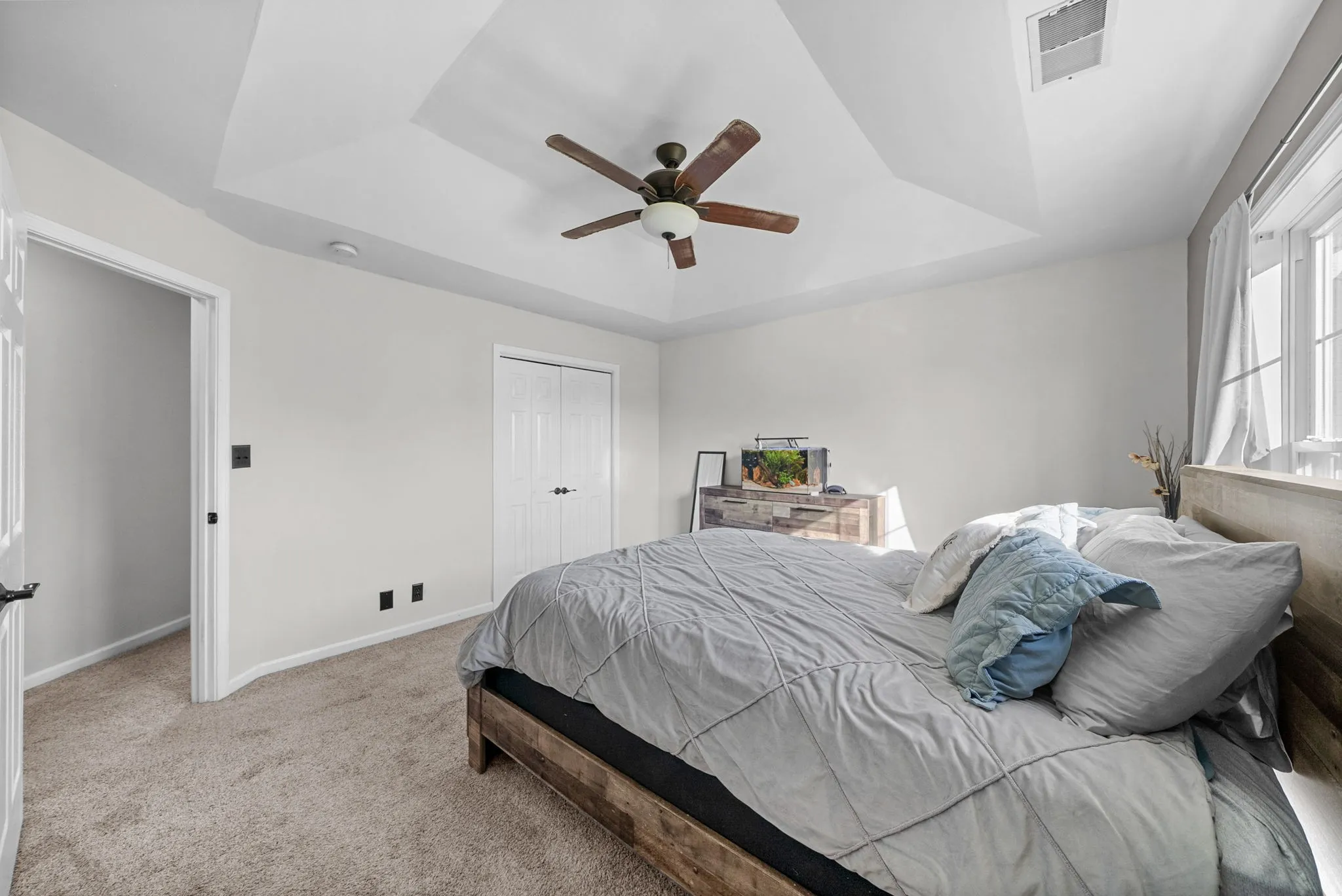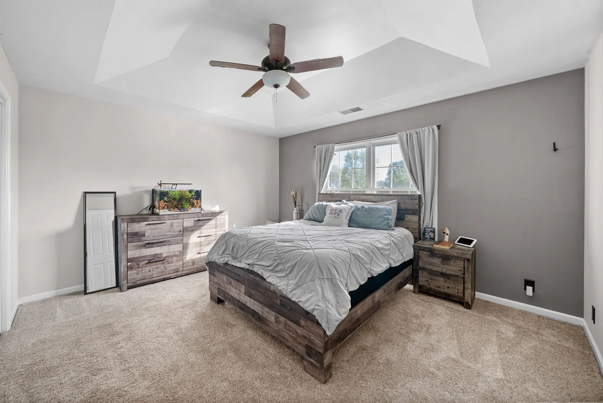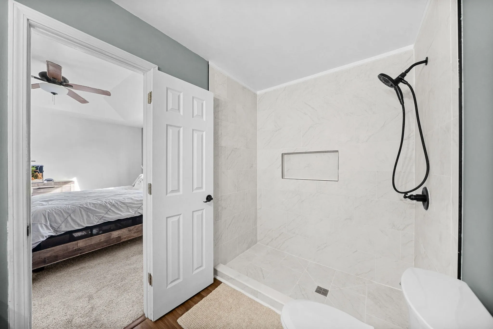 The primary suite has been fully renovated in 2025, featuring new flooring, updated countertops, and a beautifully redesigned bathroom with a tiled walk-in shower replacing the previous tub/shower combination.
