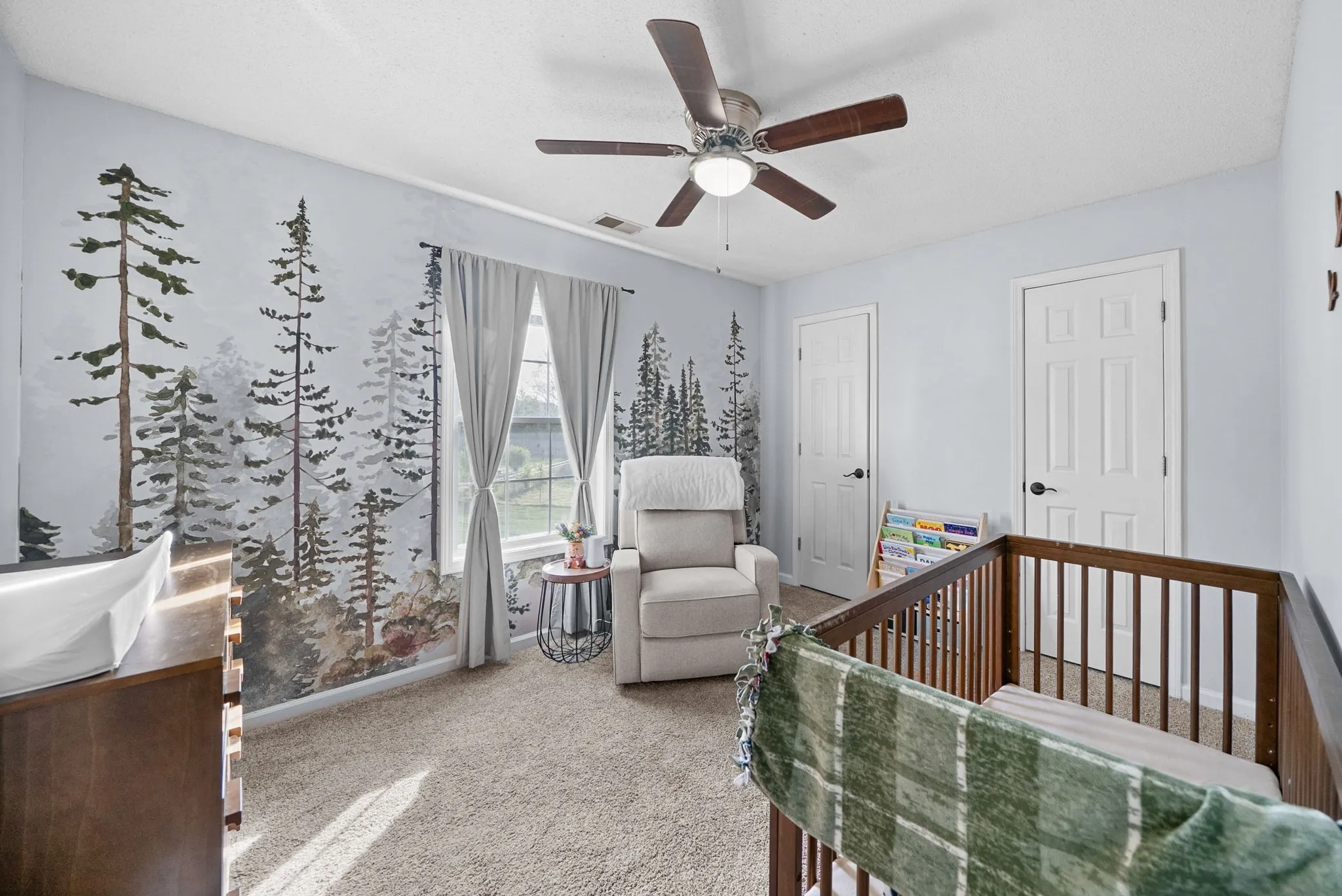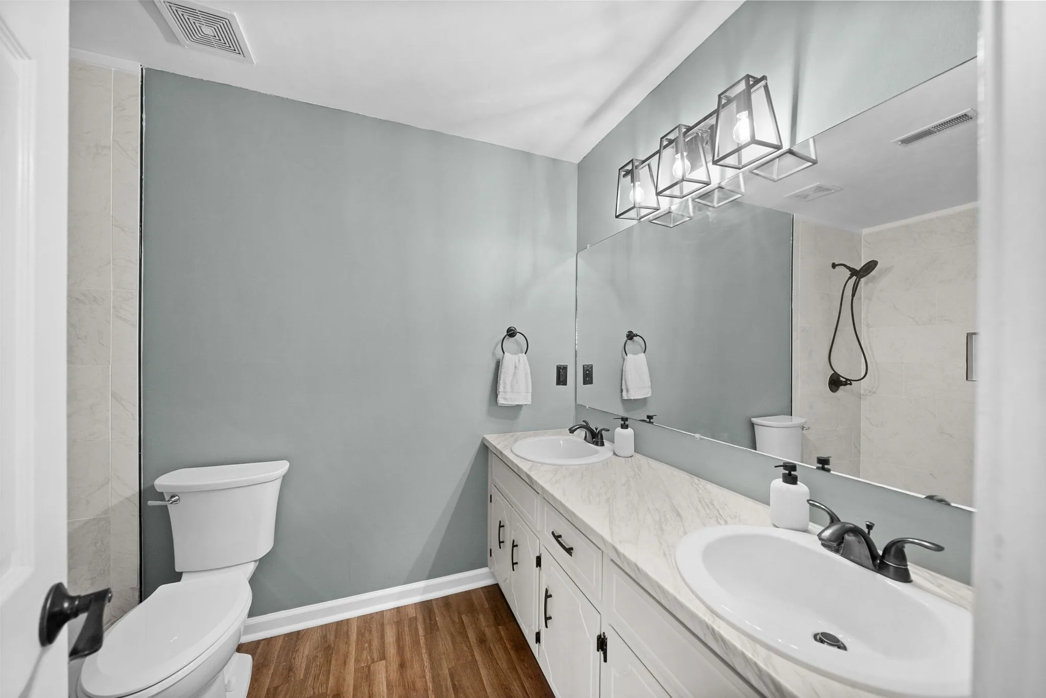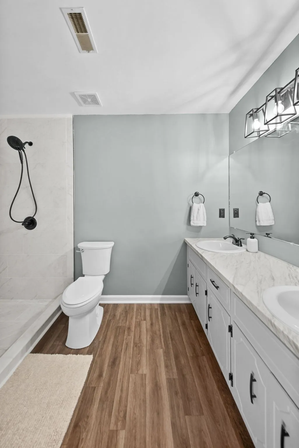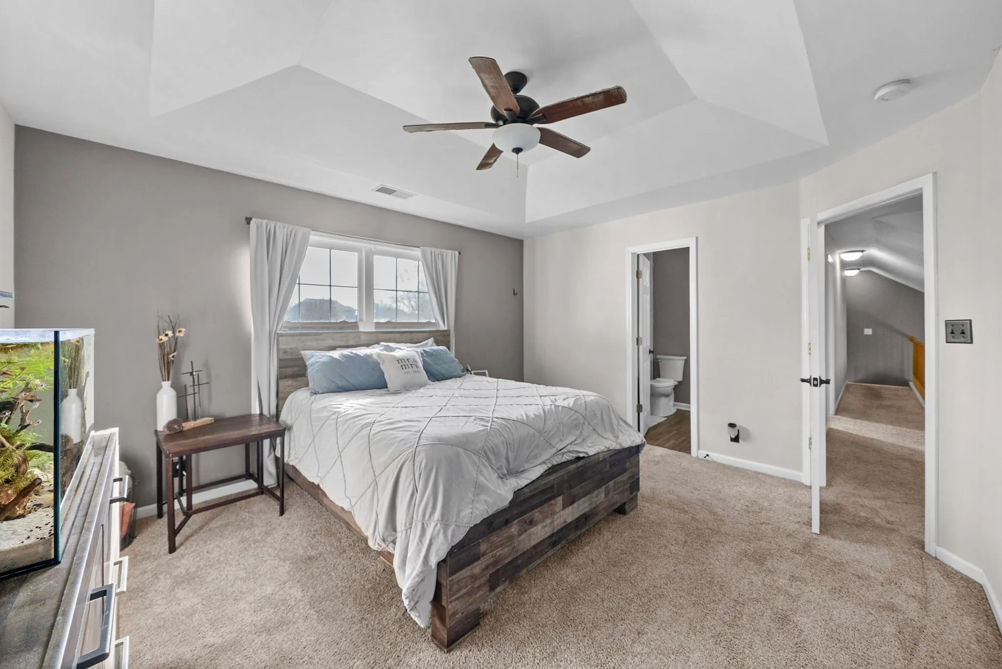 The primary suite has been fully renovated in 2025, featuring new flooring, updated countertops, and a beautifully redesigned bathroom with a tiled walk-in shower replacing the previous tub/shower combination.