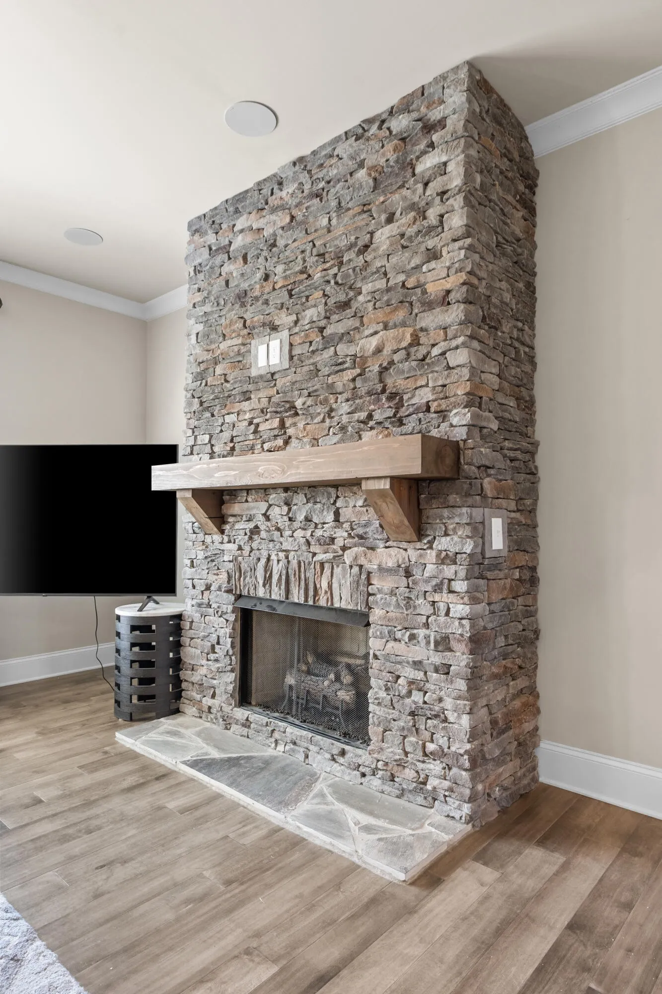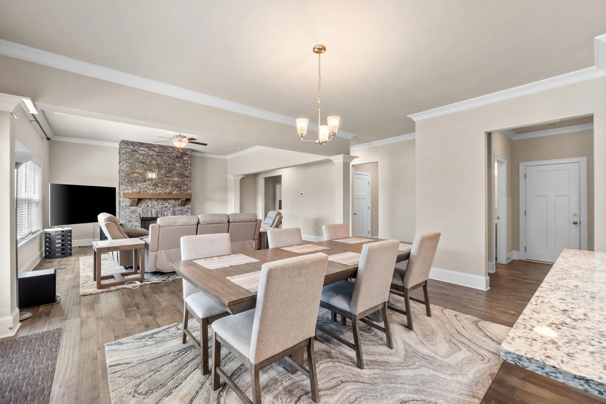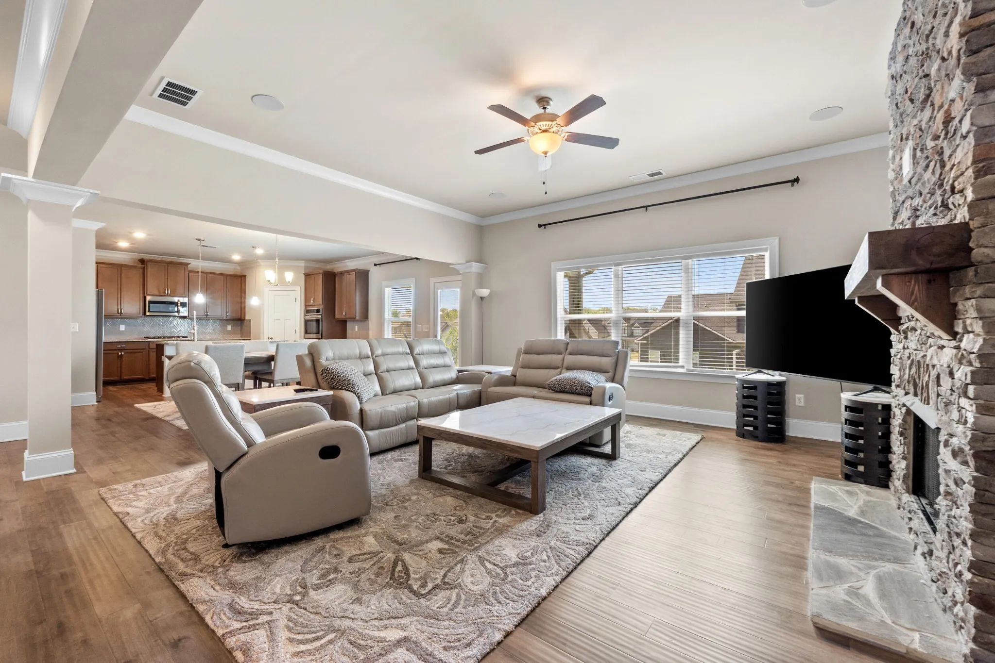 The gourmet kitchen is well-appointed with granite countertops, stainless steel appliances, ample cabinetry, and a stylish tile backsplash. It opens into the spacious great room, highlighted by hardwood floors and a beautiful stone fireplace, creating a warm and welcoming atmosphere. Built-in ceiling speakers enhance the main living area and media room, perfect for entertainment.