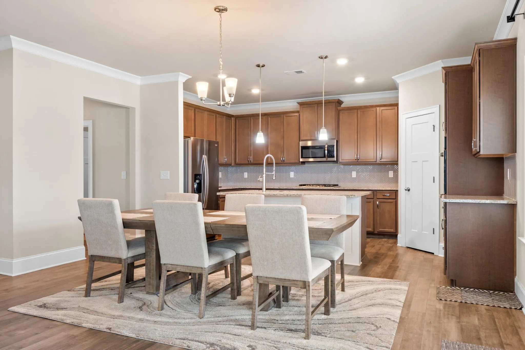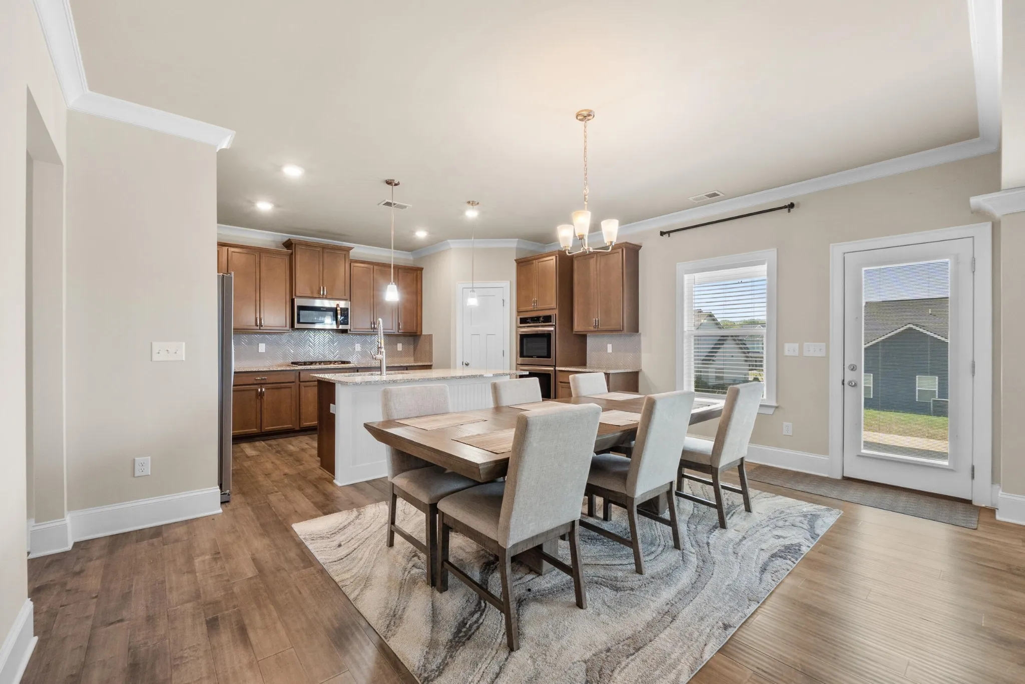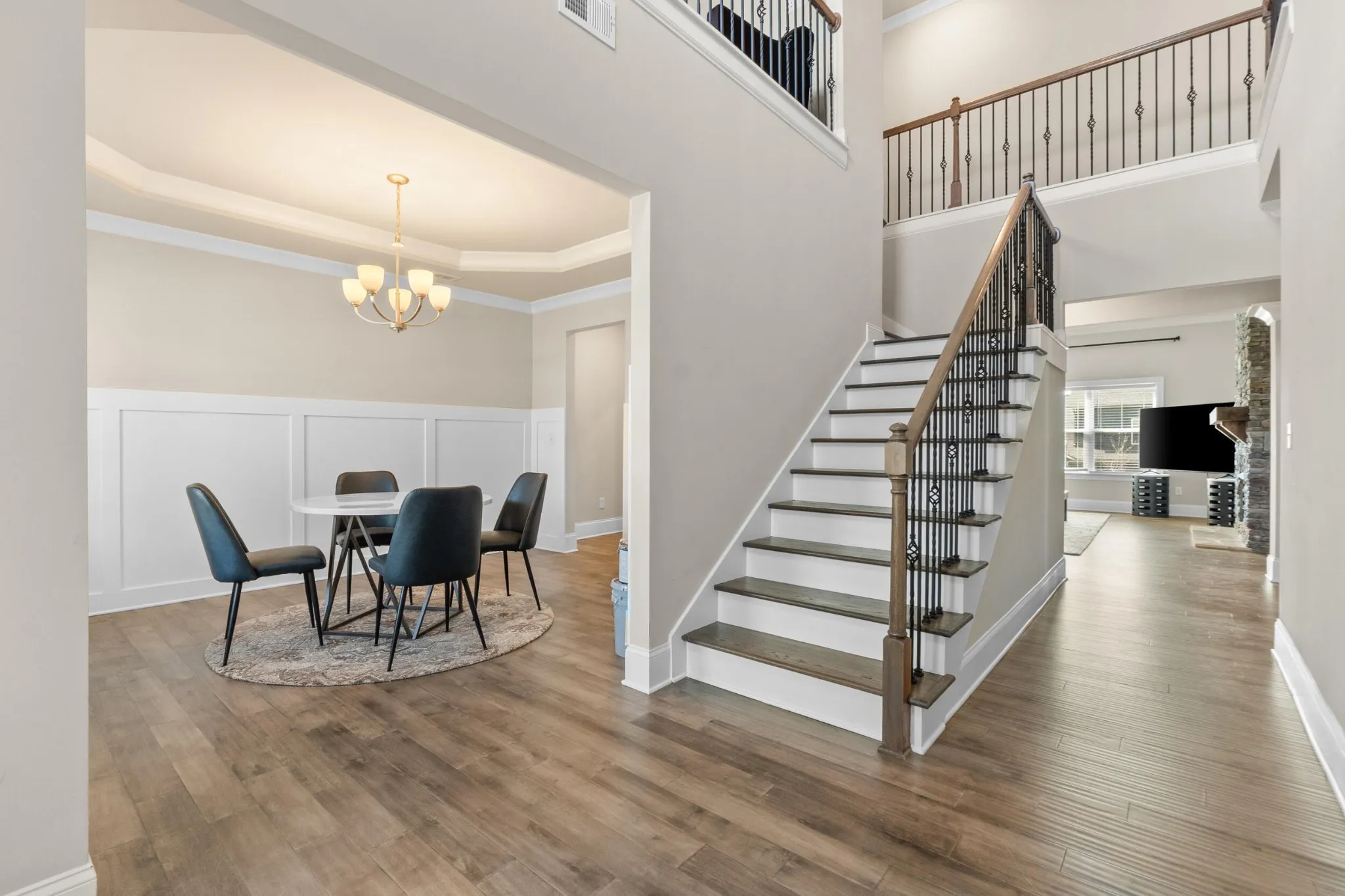 As you enter, you are greeted by a grand two-story foyer with soaring ceilings that create a bright and open feel. The main level features an inviting open-concept layout with seamless flow between living areas. A formal dining room with hardwood flooring provides the perfect setting for hosting gatherings and special occasions.