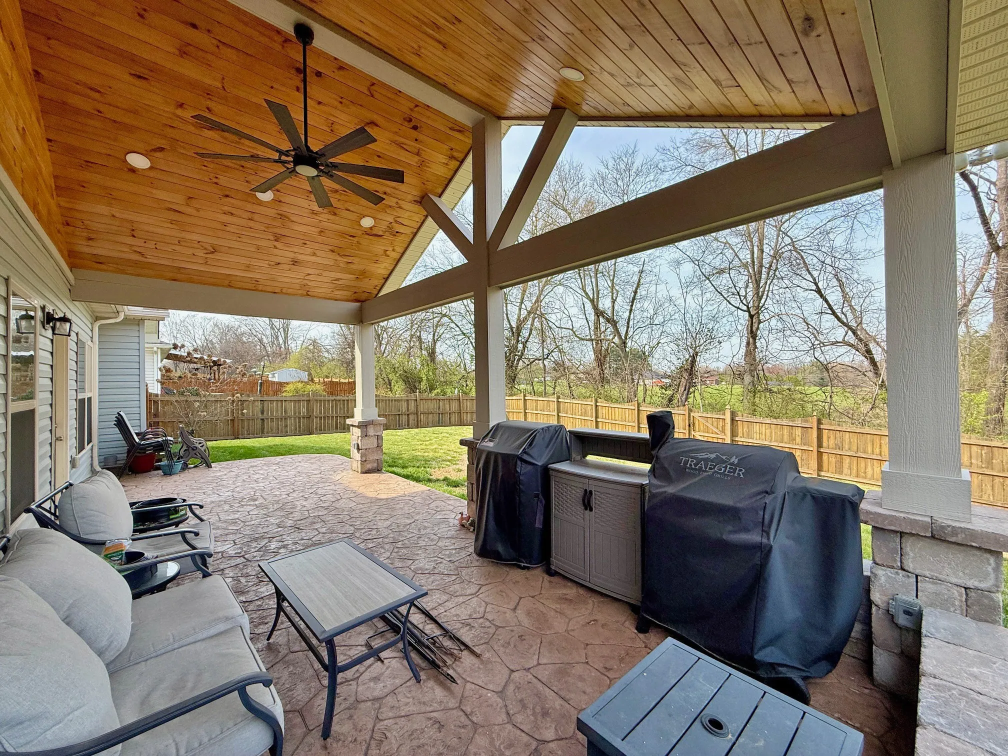 Step outside to enjoy the show-stopping covered patio, complete with an oversized stamped concrete floor and vaulted wood ceiling—ideal for relaxing or hosting guests. The fully fenced backyard provides privacy and a safe space for kids or pets, all while overlooking peaceful tree-lined views and open green space.