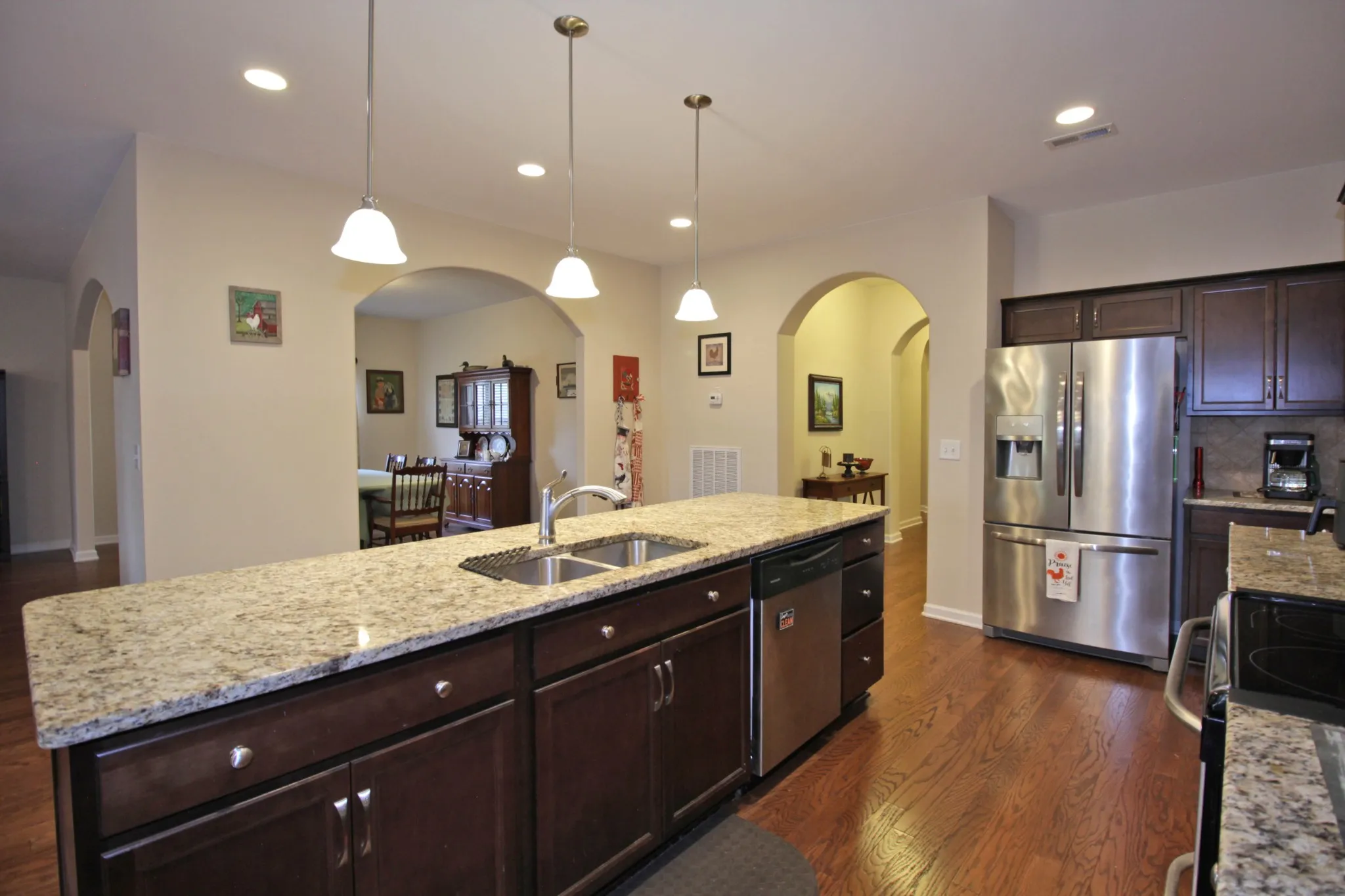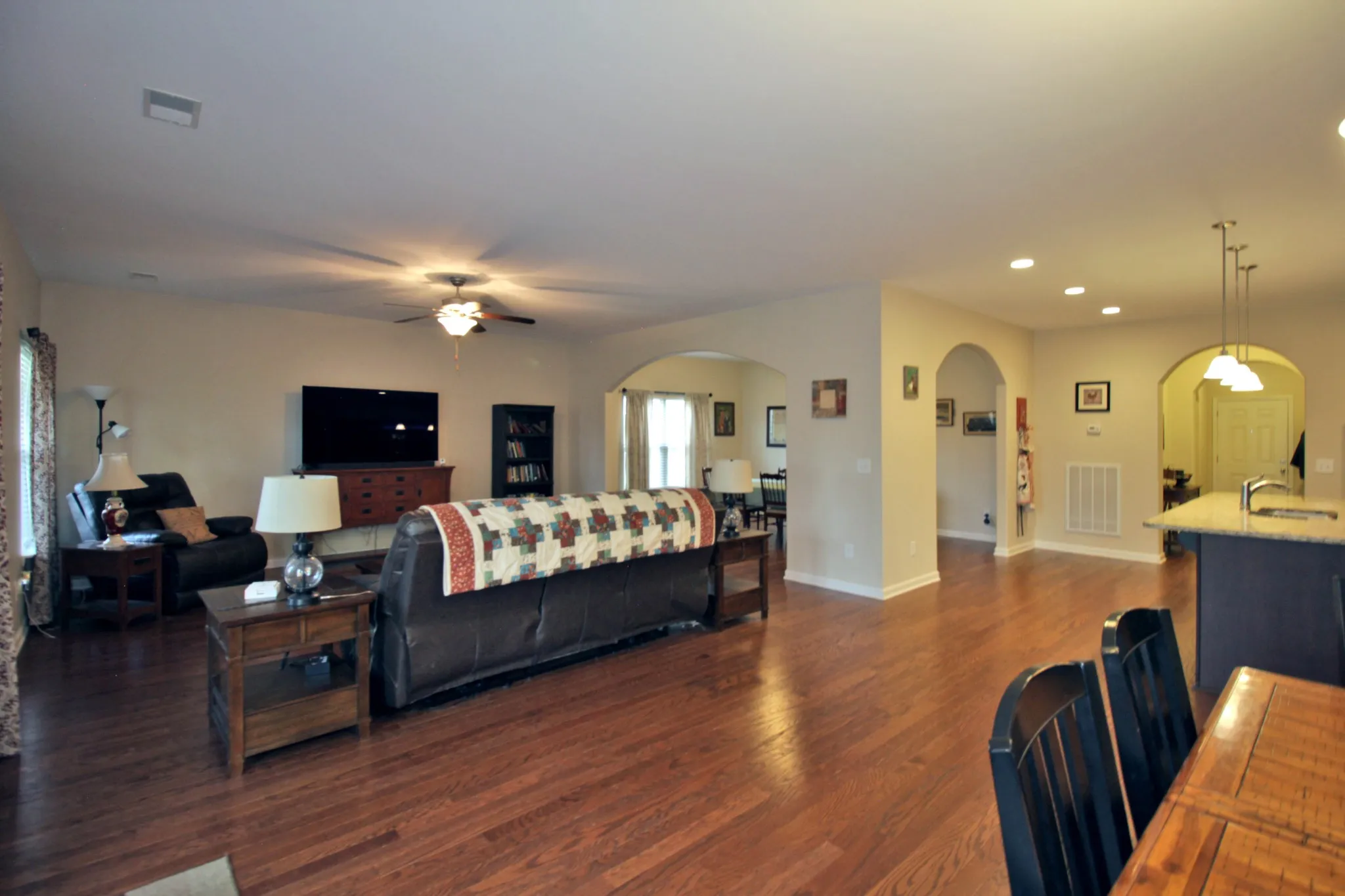 Featuring the popular Lexington floorplan, this home boasts an open-concept layout with spacious living areas, a versatile flex room, and a large bonus room. Hardwood floors flow throughout the main living spaces, while the kitchen shines with granite countertops, tile backsplash, stainless appliances, and an oversized island—perfect for entertaining.
