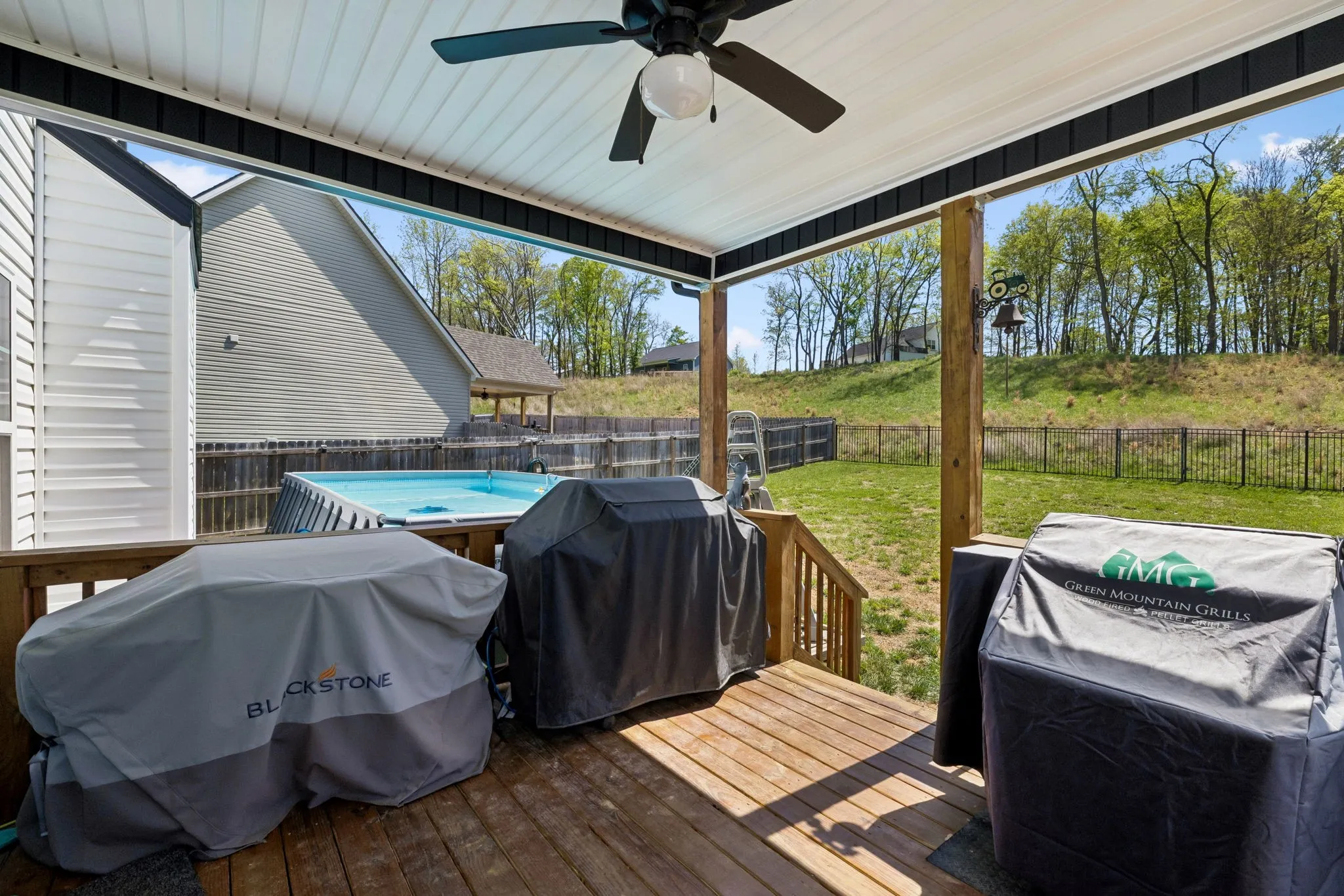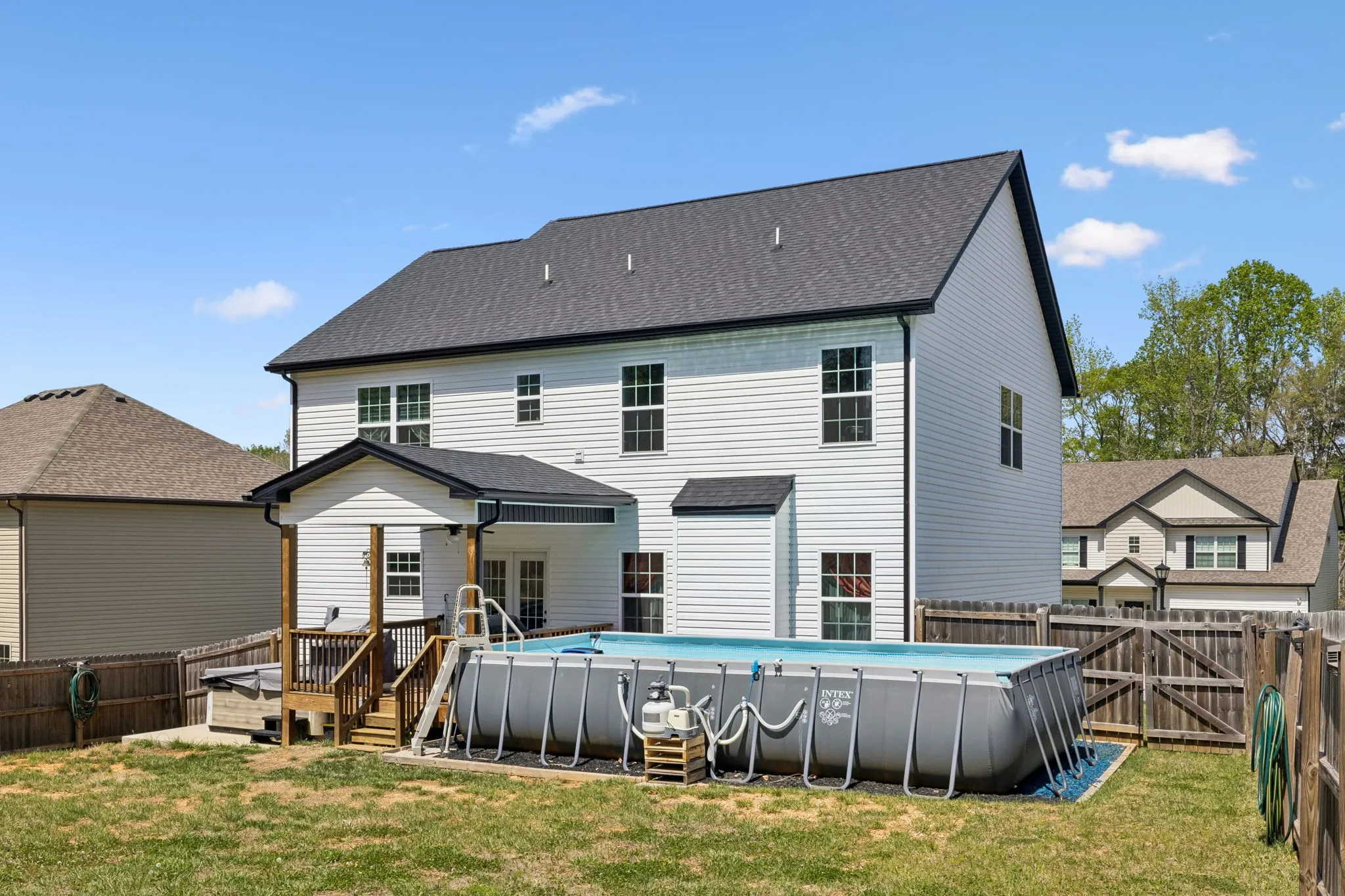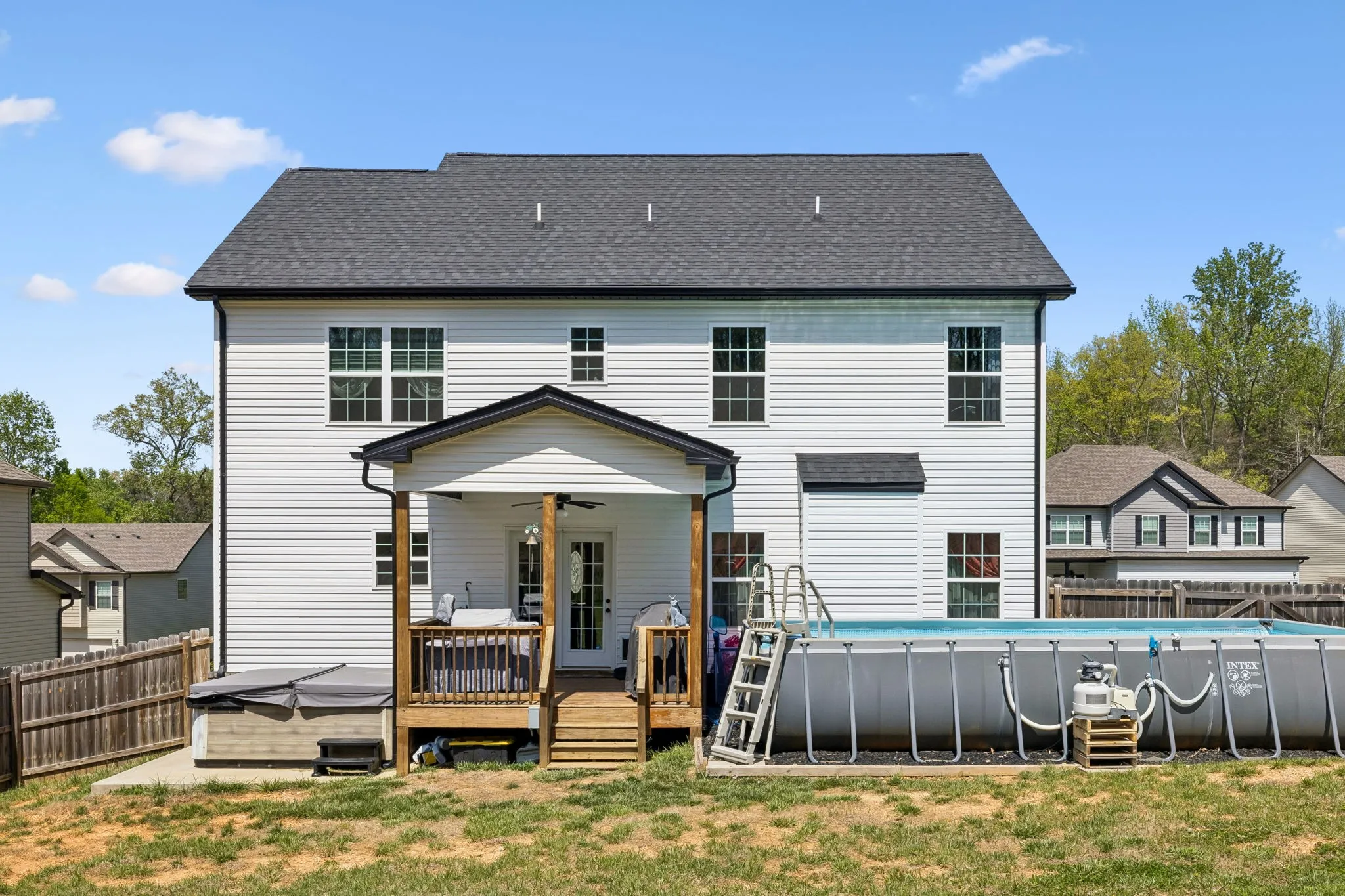 Out back is where this home truly shines—enjoy your own private oasis with a covered deck overlooking the above-ground pool and hot tub, all surrounded by a privacy fence. With no neighbors directly behind you and a peaceful tree line backdrop, you’ll love the added sense of privacy and space.