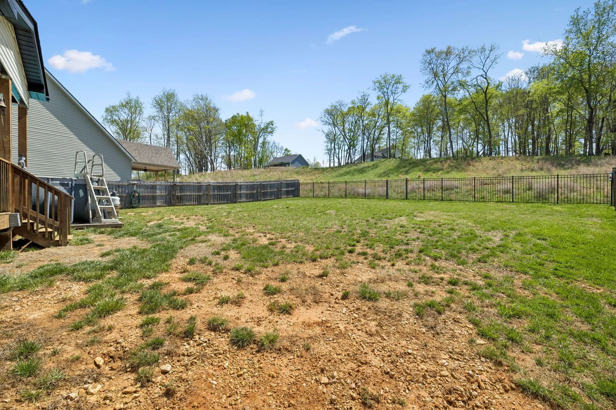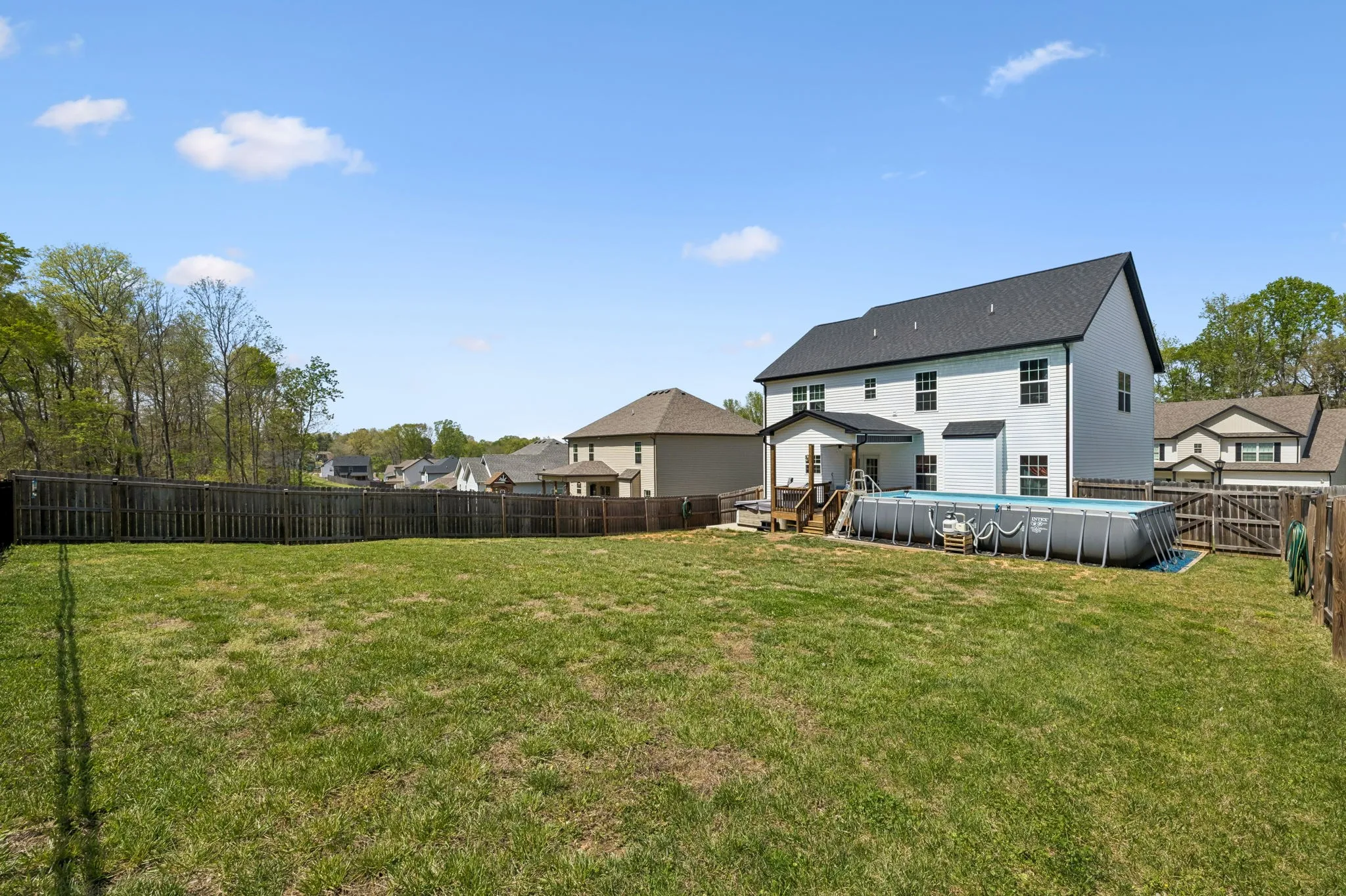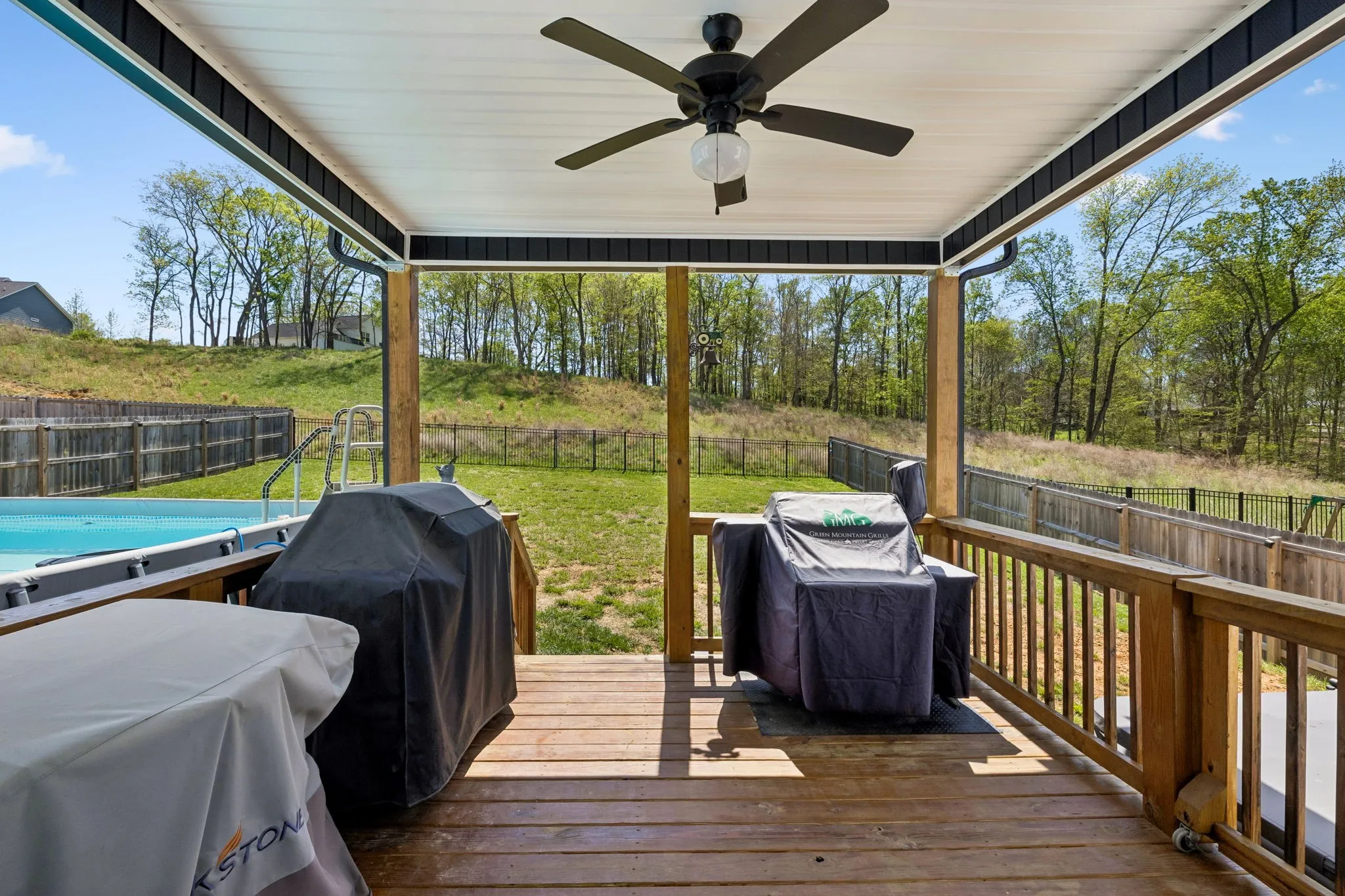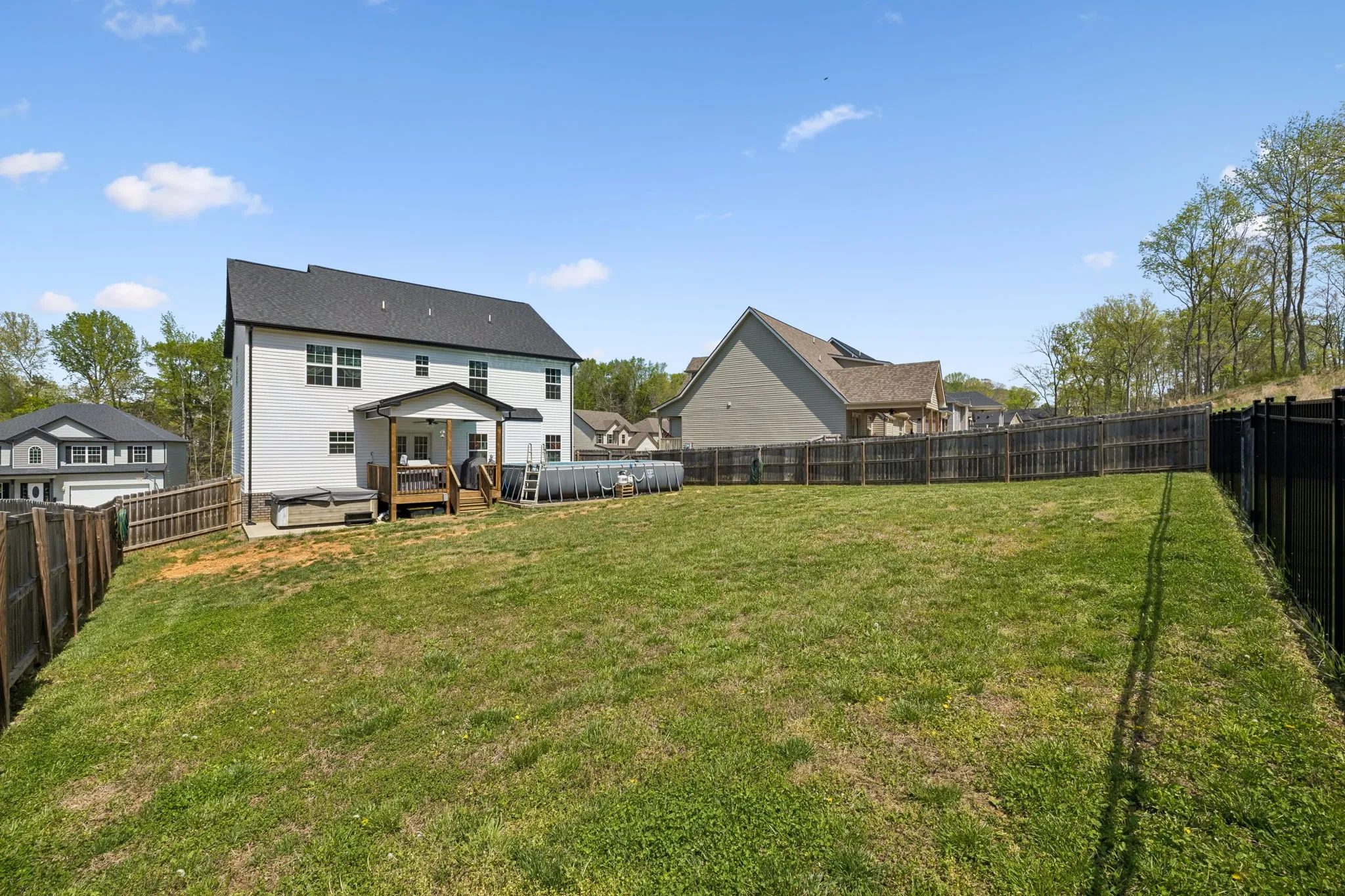 Out back is where this home truly shines—enjoy your own private oasis with a covered deck overlooking the above-ground pool and hot tub, all surrounded by a privacy fence. With no neighbors directly behind you and a peaceful tree line backdrop, you’ll love the added sense of privacy and space.