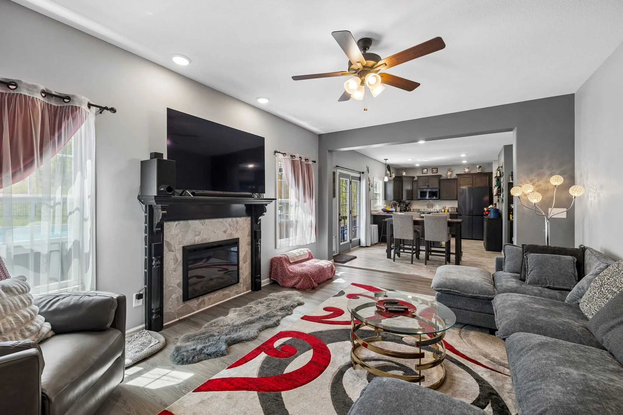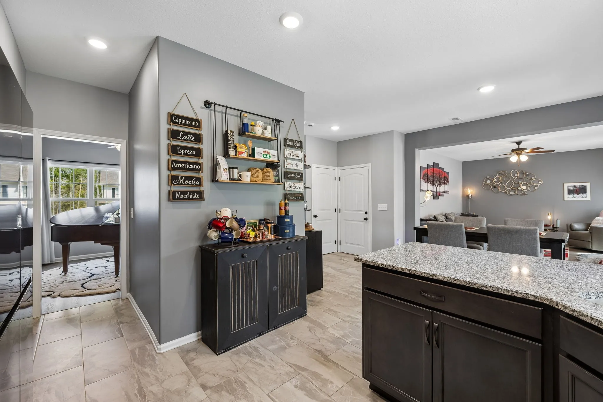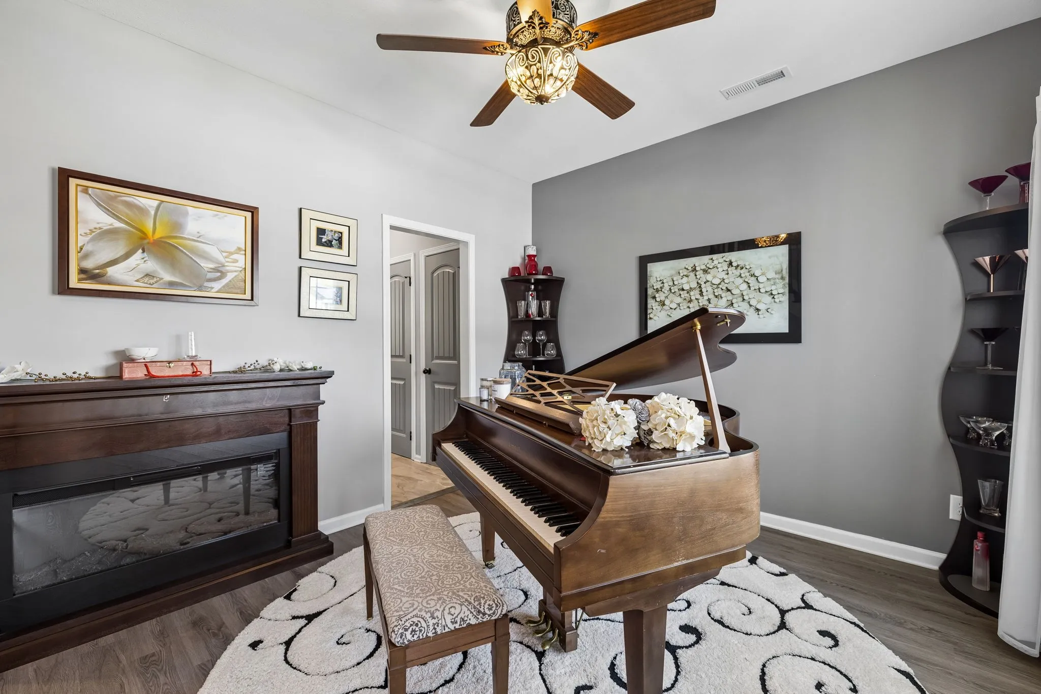 Step inside to an open floorplan designed for both everyday living and entertaining. The living room features a cozy fireplace, flowing seamlessly into the kitchen where a peninsula provides seating for three—perfect for casual meals or gathering with guests. Just off the main living space, you’ll find a versatile piano room that can easily serve as a formal dining room, home office, or flex space to fit your needs.
