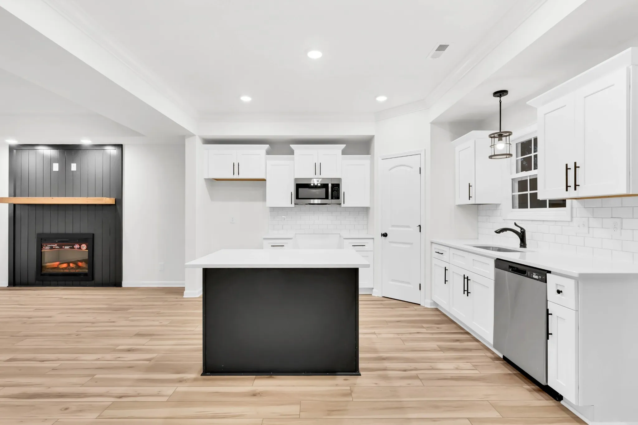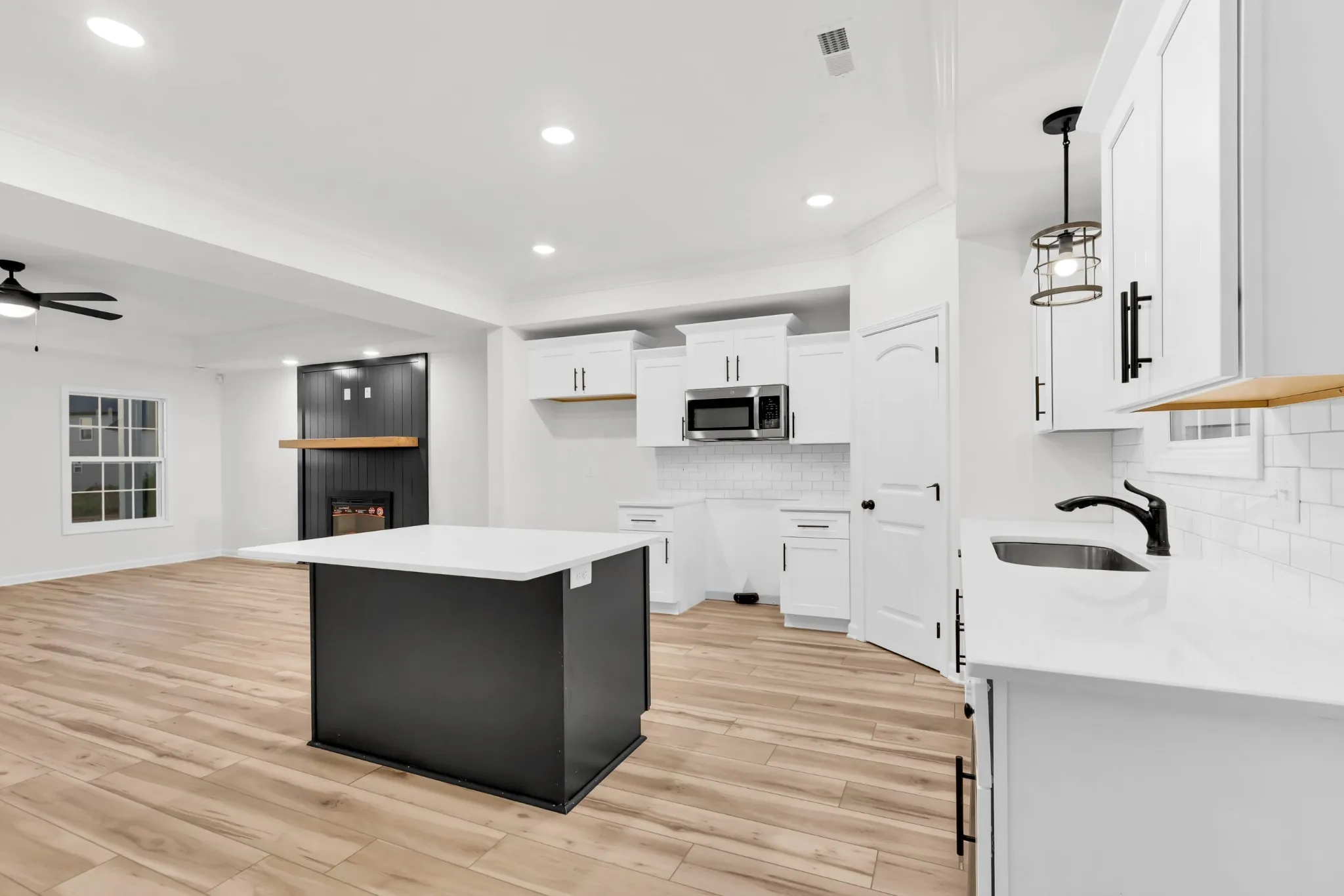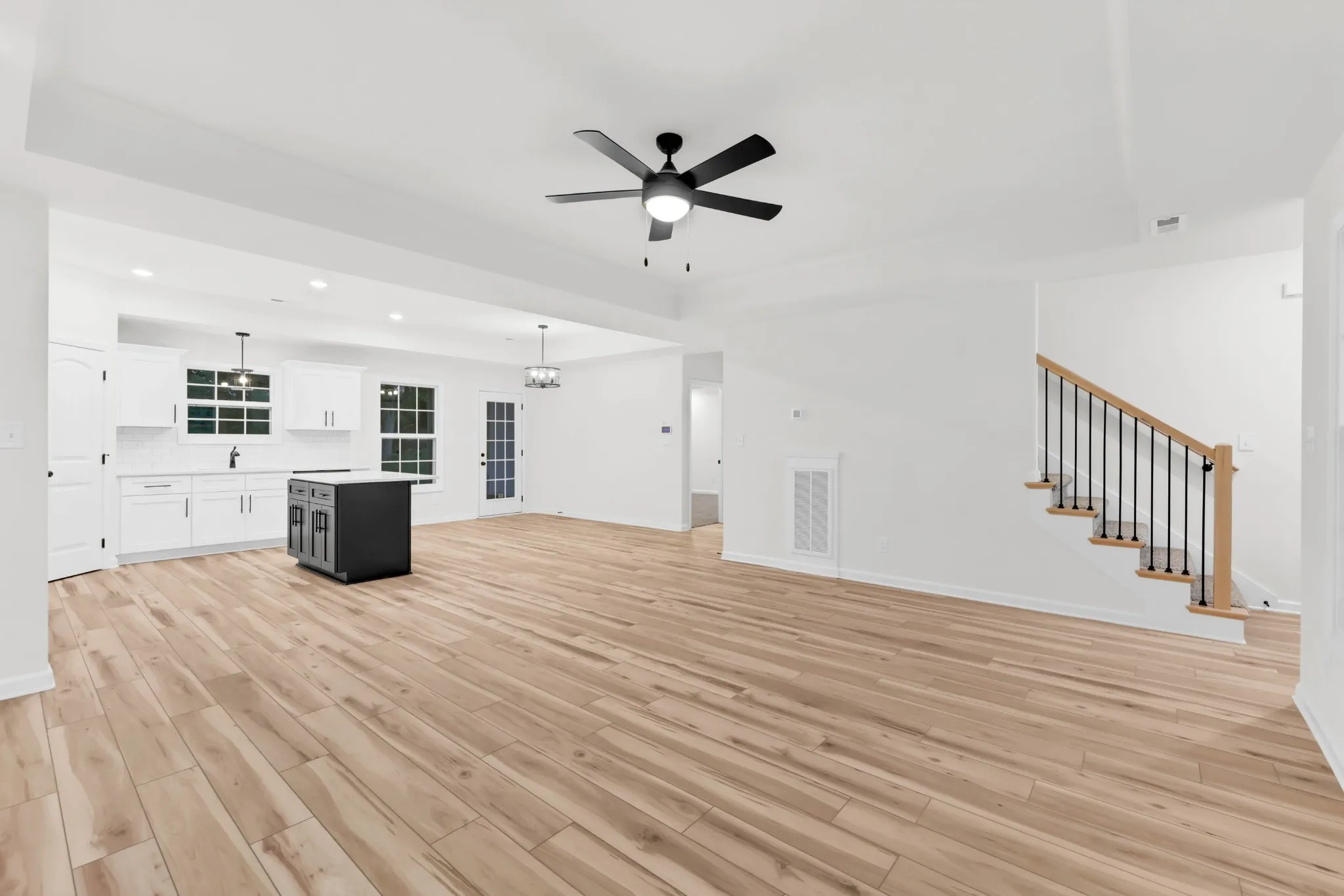 The open-concept living area is perfect for entertaining, with an island anchoring the kitchen.