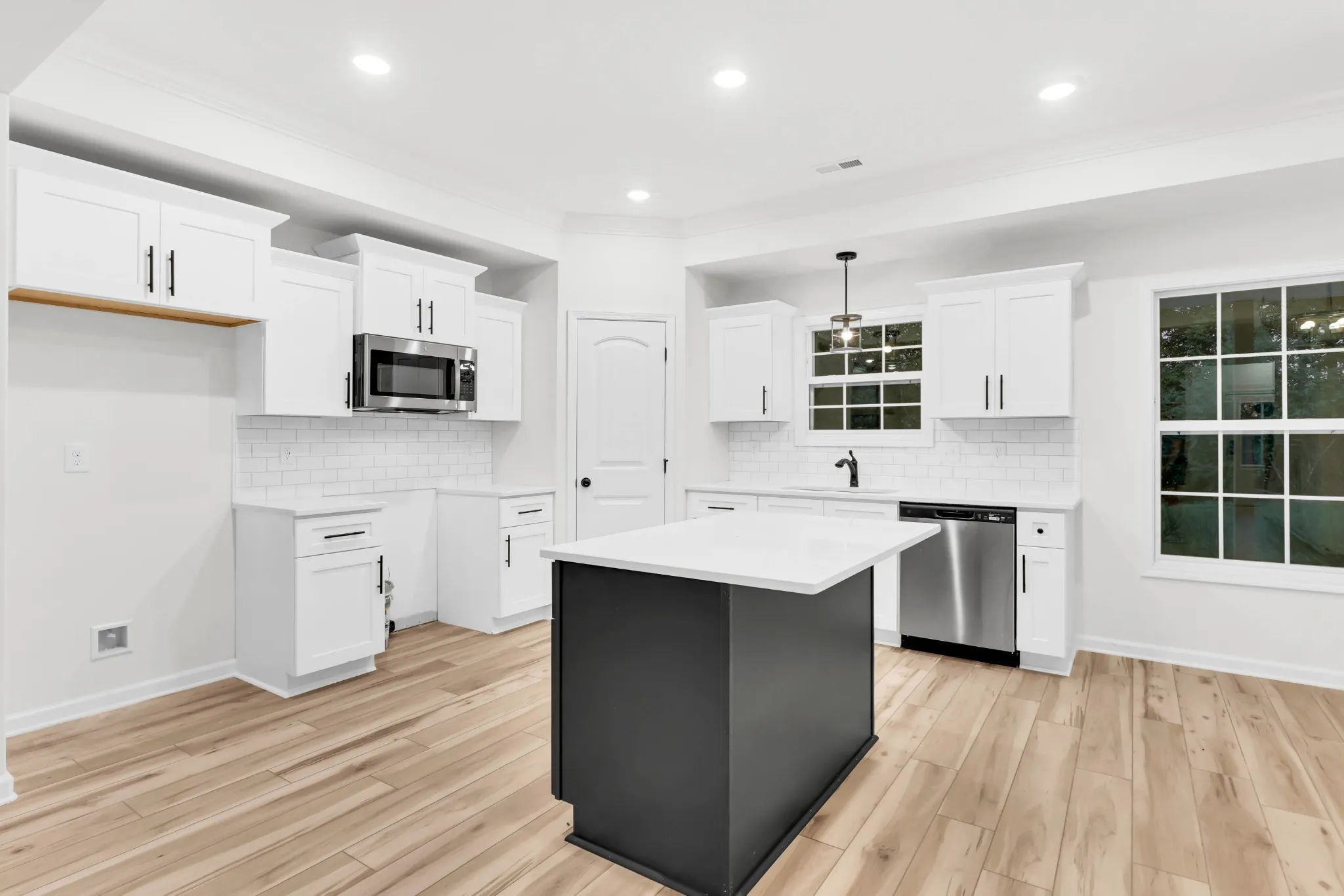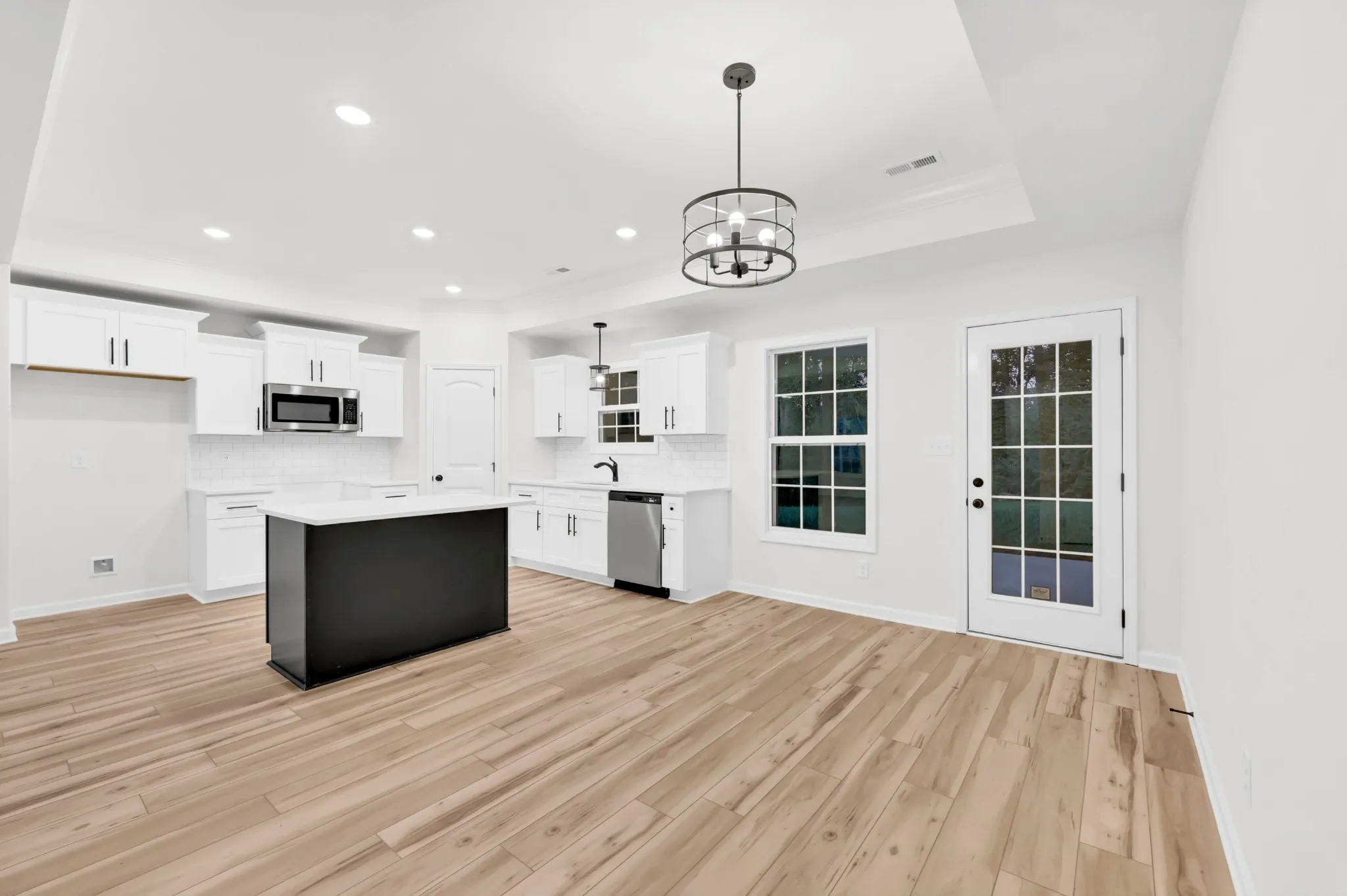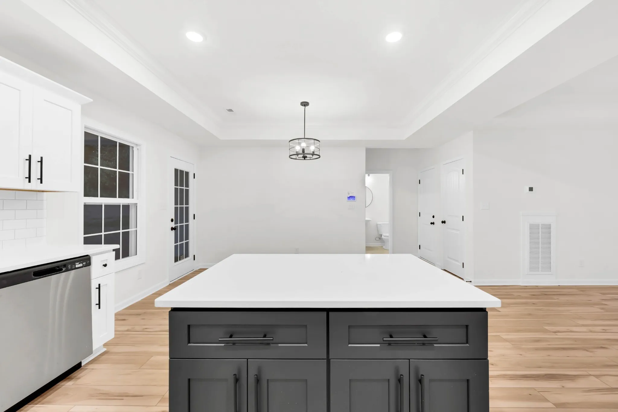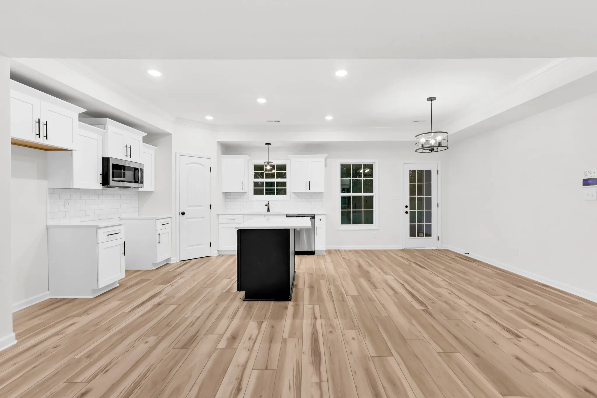 The open-concept living area is perfect for entertaining, with an island anchoring the kitchen.