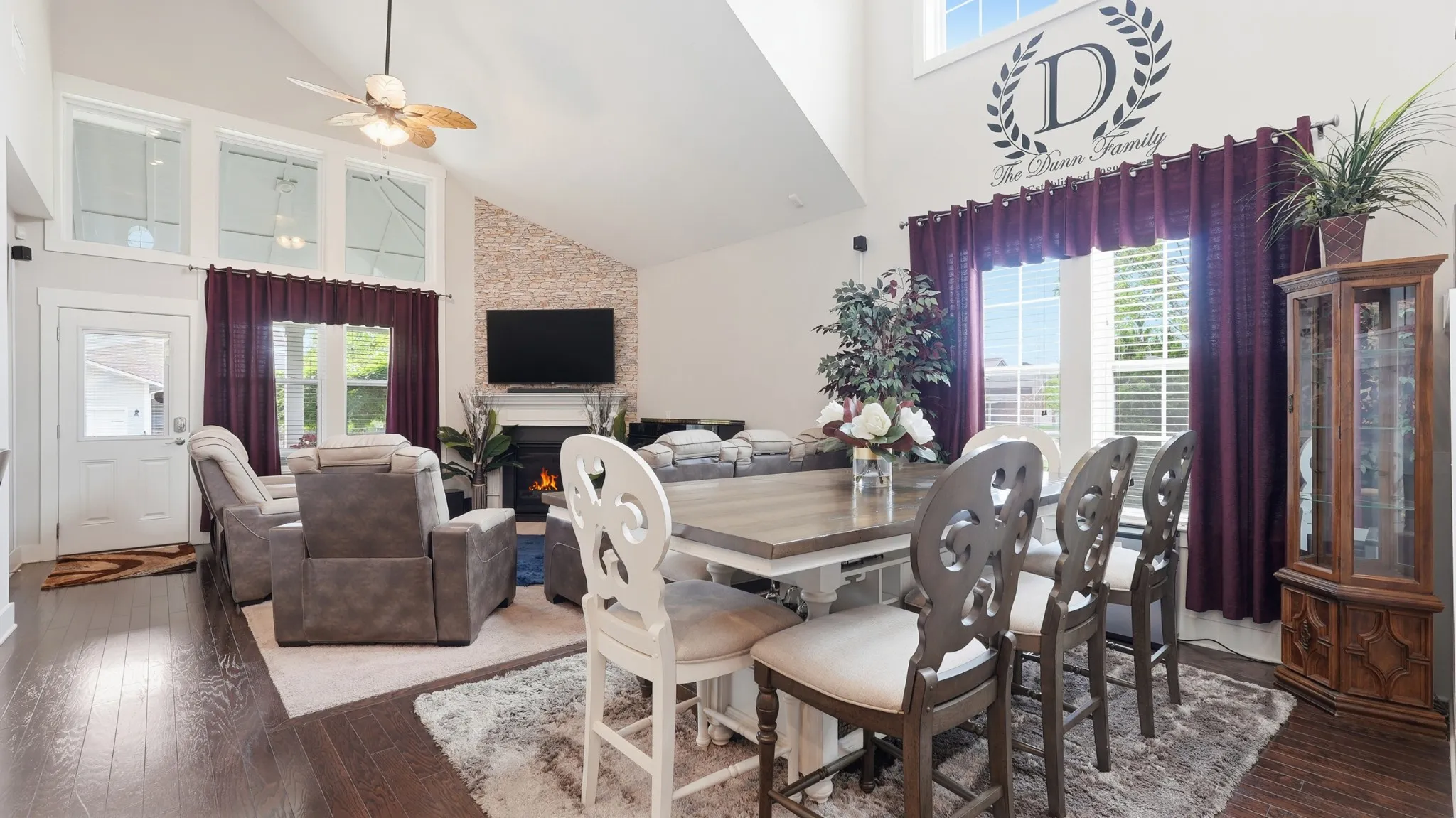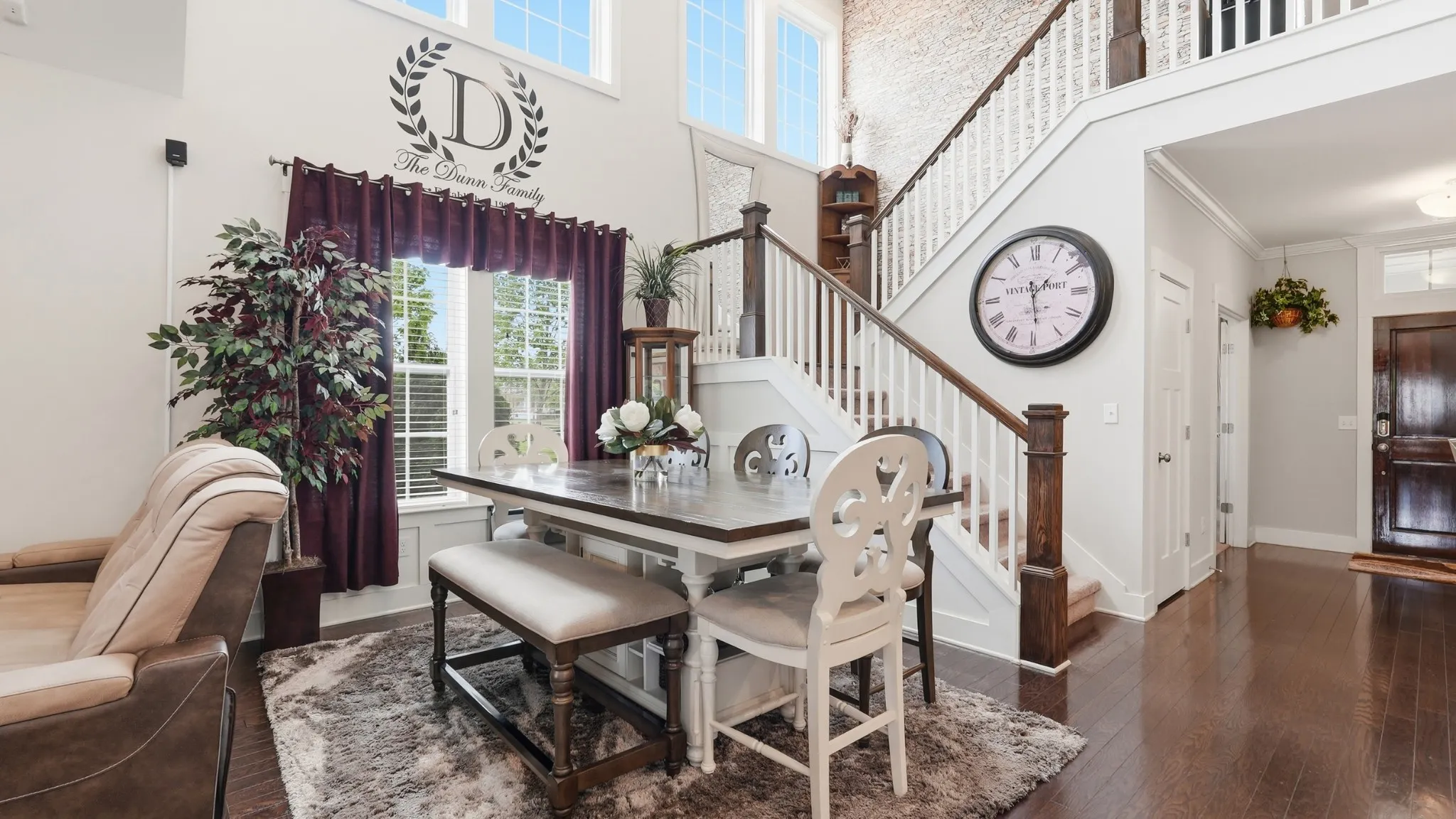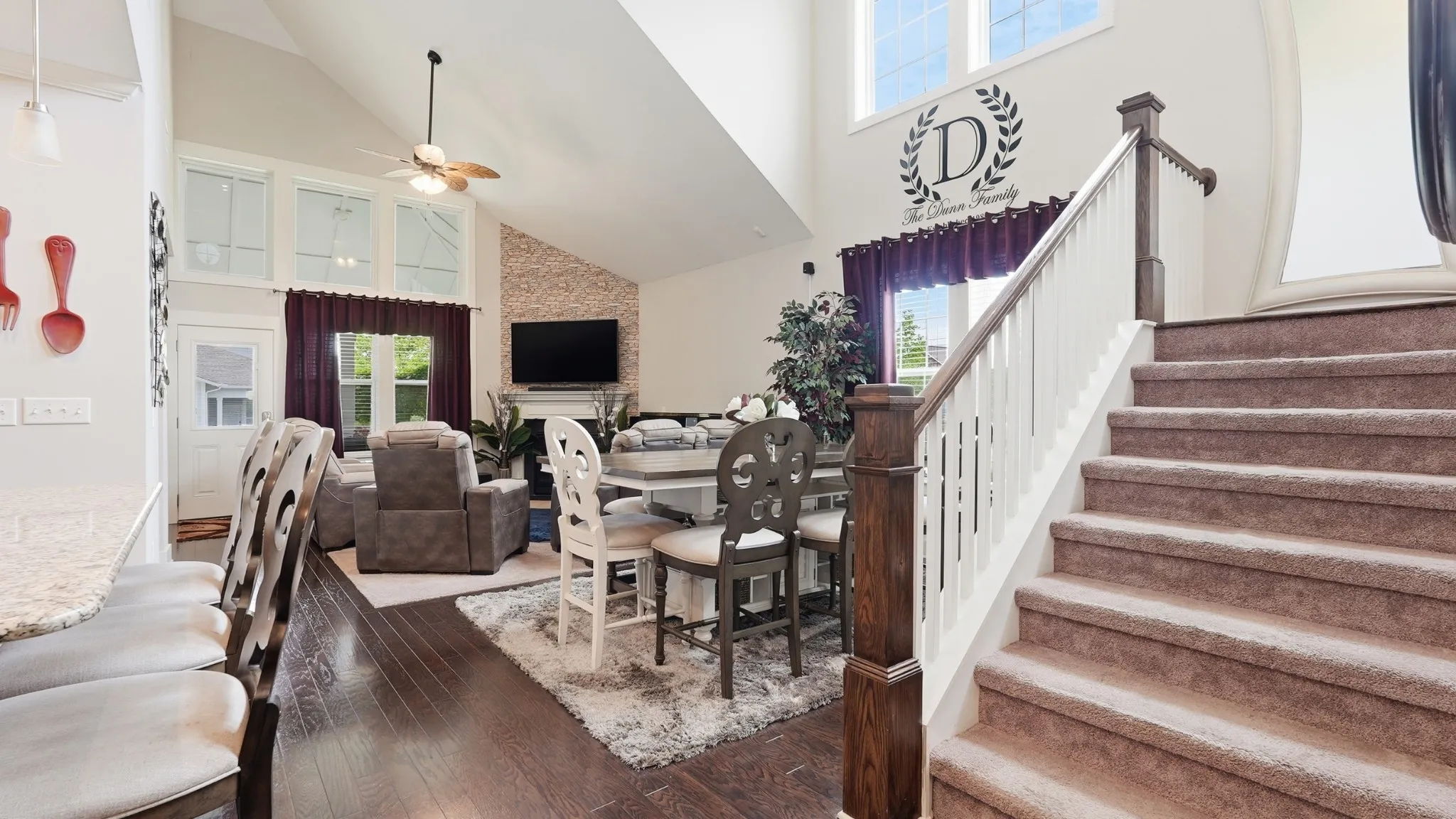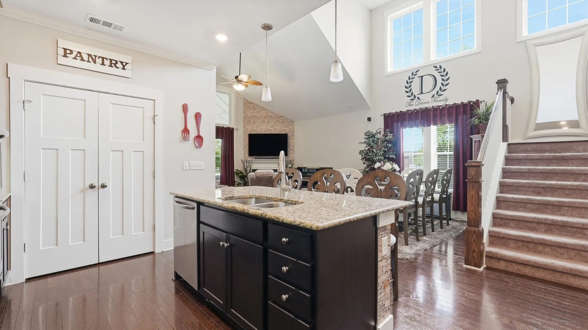 Thoughtful upgrades are found throughout, including crown molding, built-in closets, a custom pantry with shelving, and a functional mudroom. The kitchen is equipped with a double oven and opens to a bright, airy living room featuring soaring vaulted ceilings and stunning high windows that flood the space with natural light.