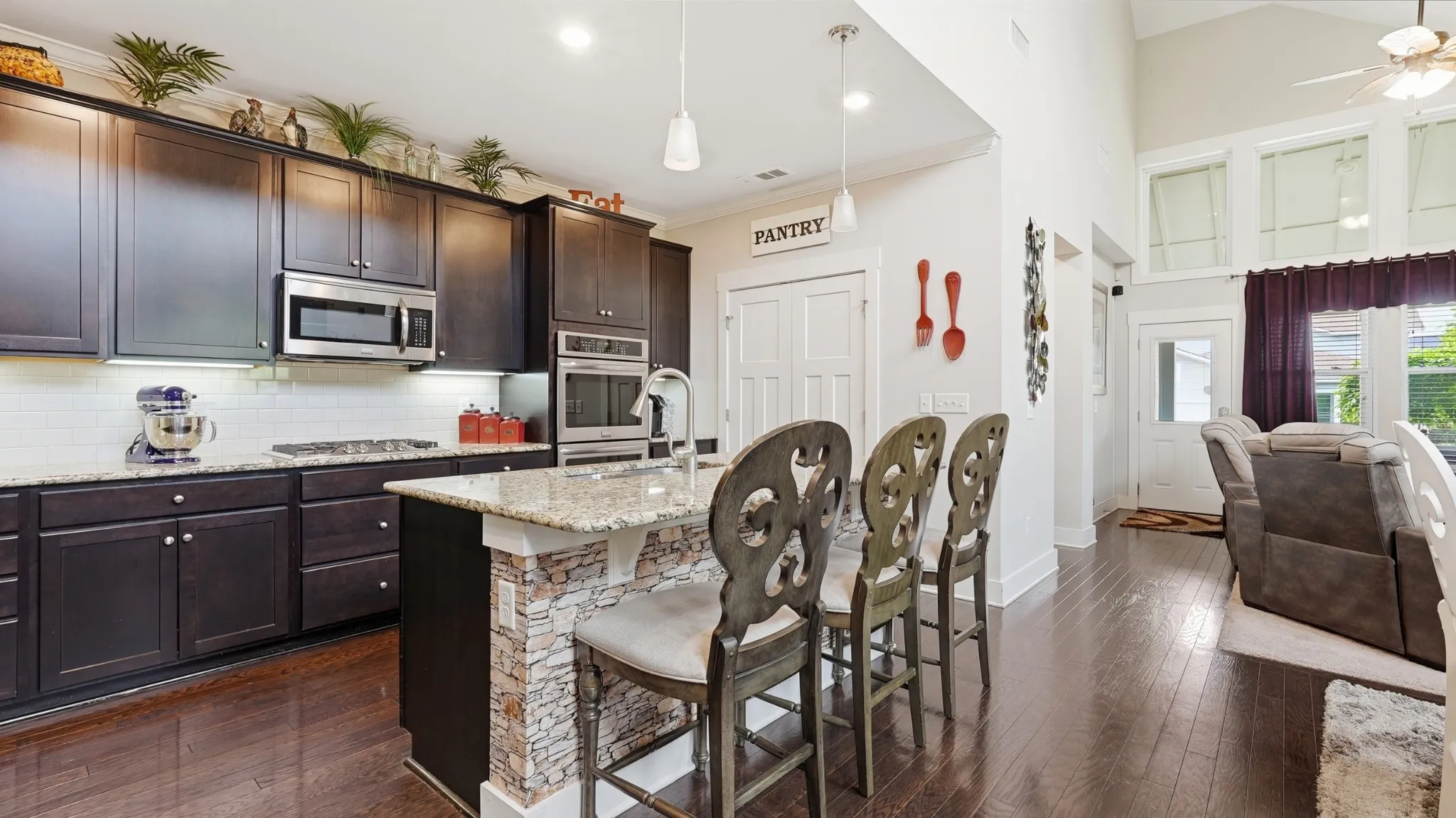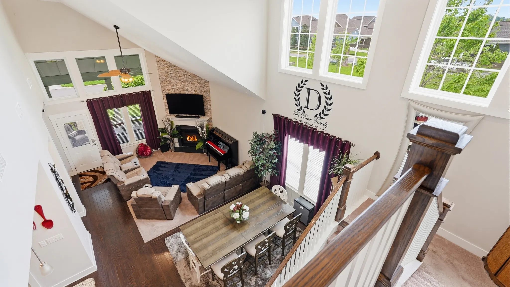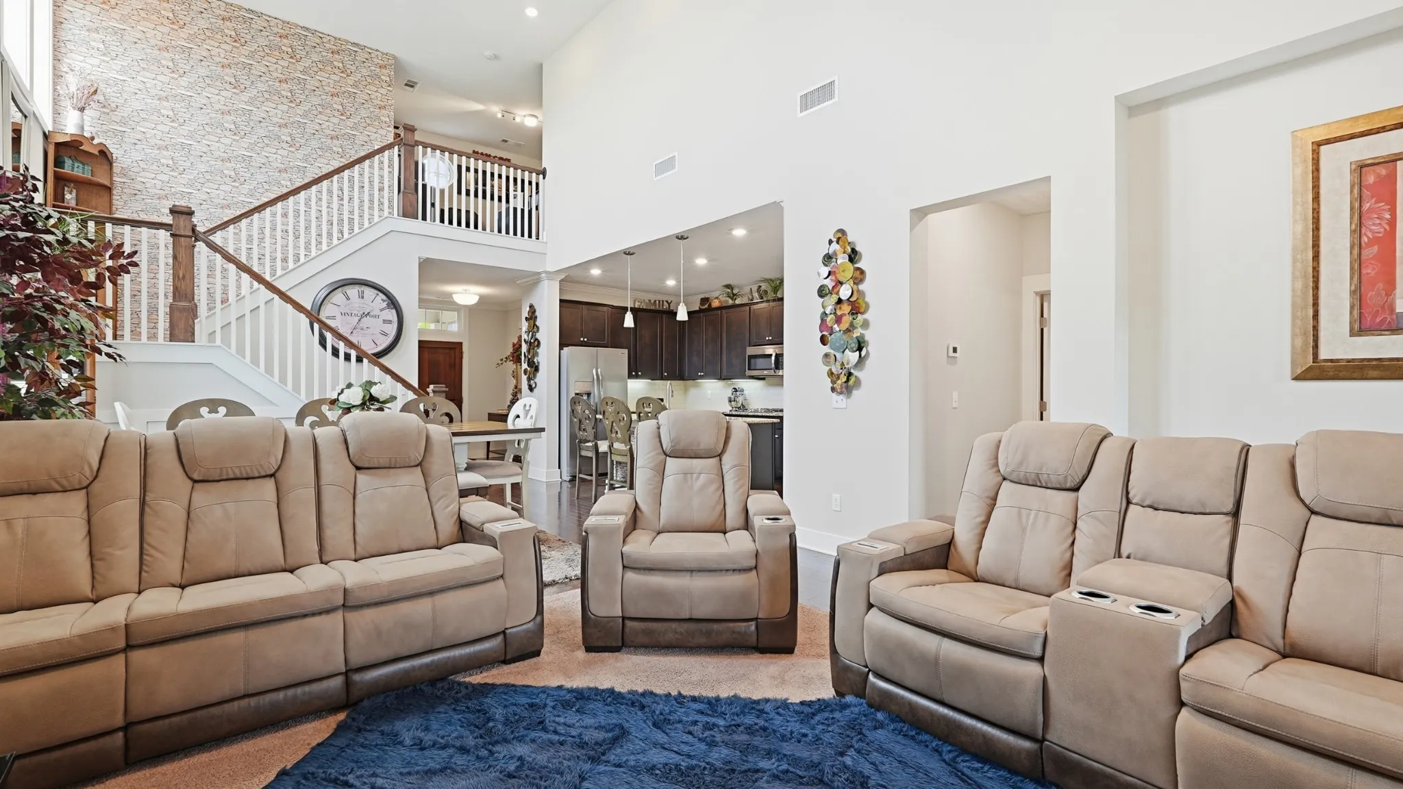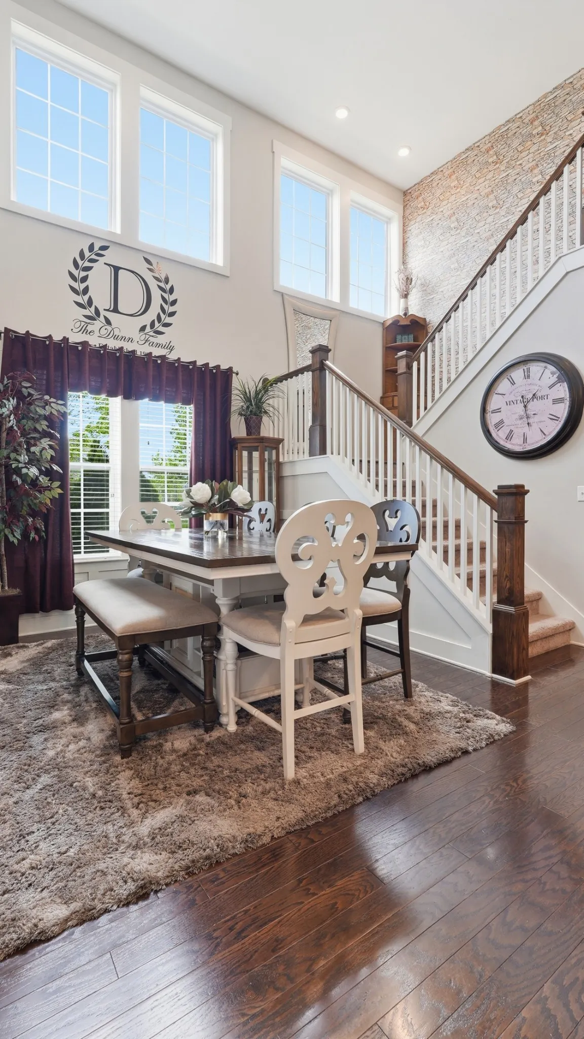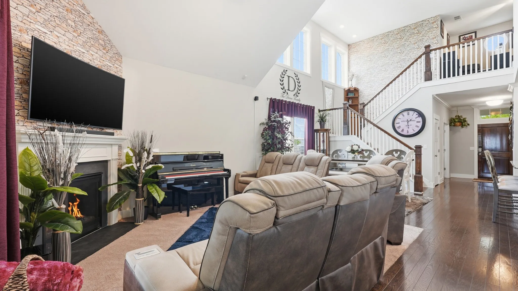 Thoughtful upgrades are found throughout, including crown molding, built-in closets, a custom pantry with shelving, and a functional mudroom. The kitchen is equipped with a double oven and opens to a bright, airy living room featuring soaring vaulted ceilings and stunning high windows that flood the space with natural light.