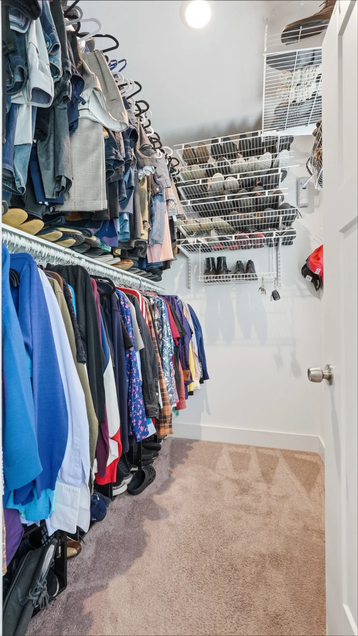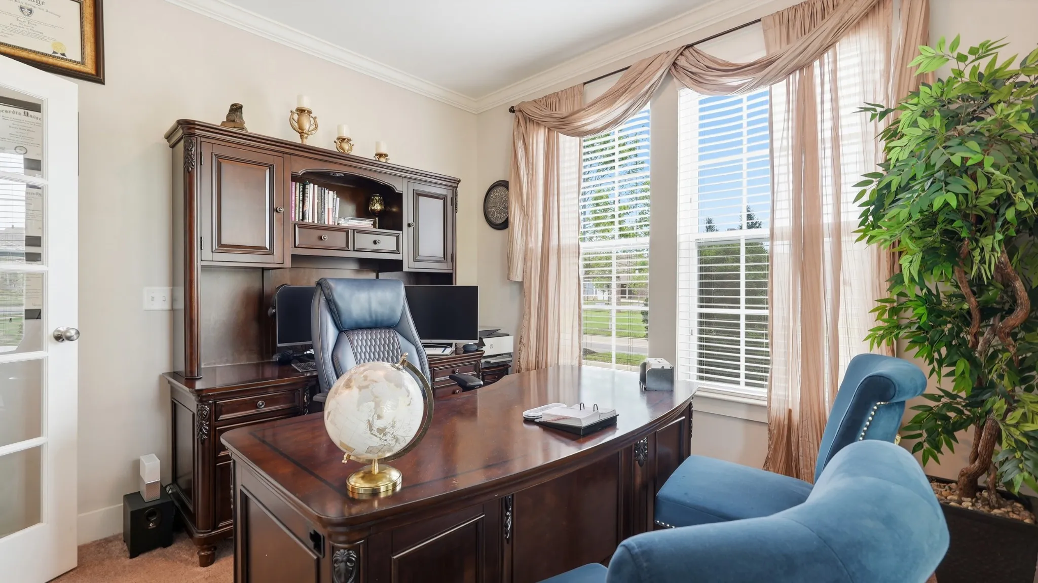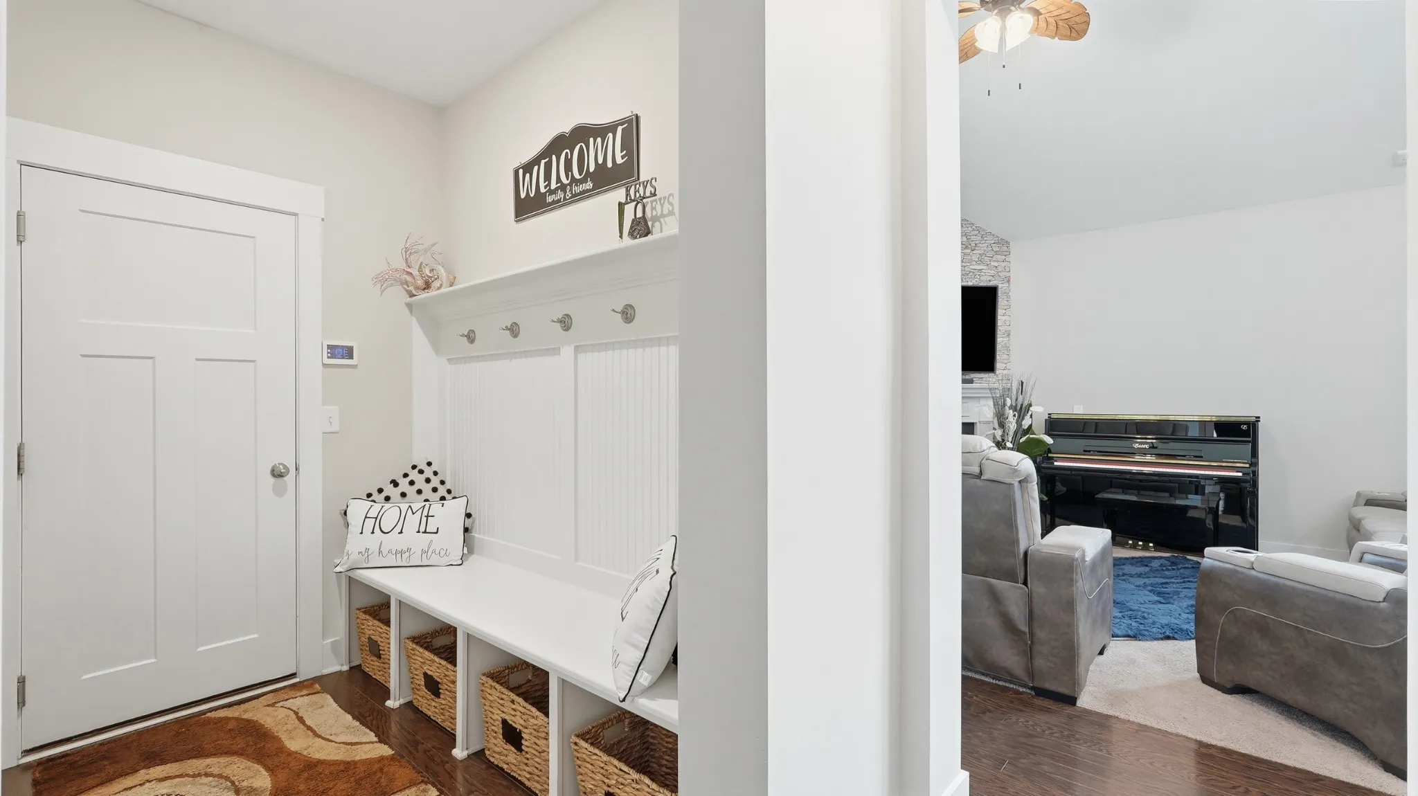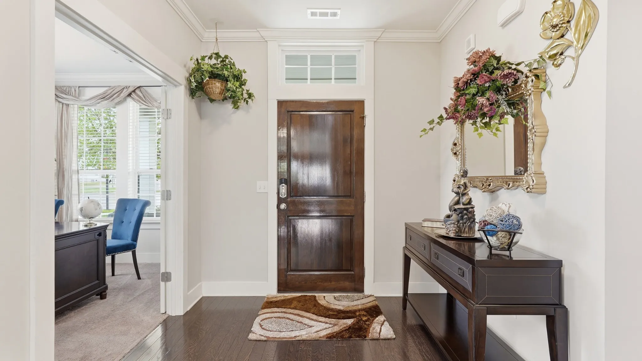 Thoughtful upgrades are found throughout, including crown molding, built-in closets, a custom pantry with shelving, and a functional mudroom. The kitchen is equipped with a double oven and opens to a bright, airy living room featuring soaring vaulted ceilings and stunning high windows that flood the space with natural light.