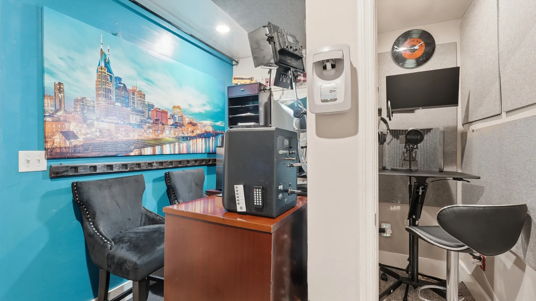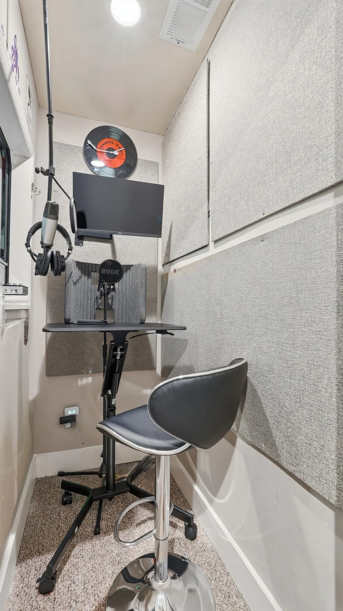 Upstairs, you’ll find a versatile loft, two additional bedrooms, and a rare, fully soundproof recording studio featuring a private sound booth, acoustic paneling, and a sleek production area creating an ideal space for musicians, podcasters, or remote professionals seeking a dedicated at home studio.