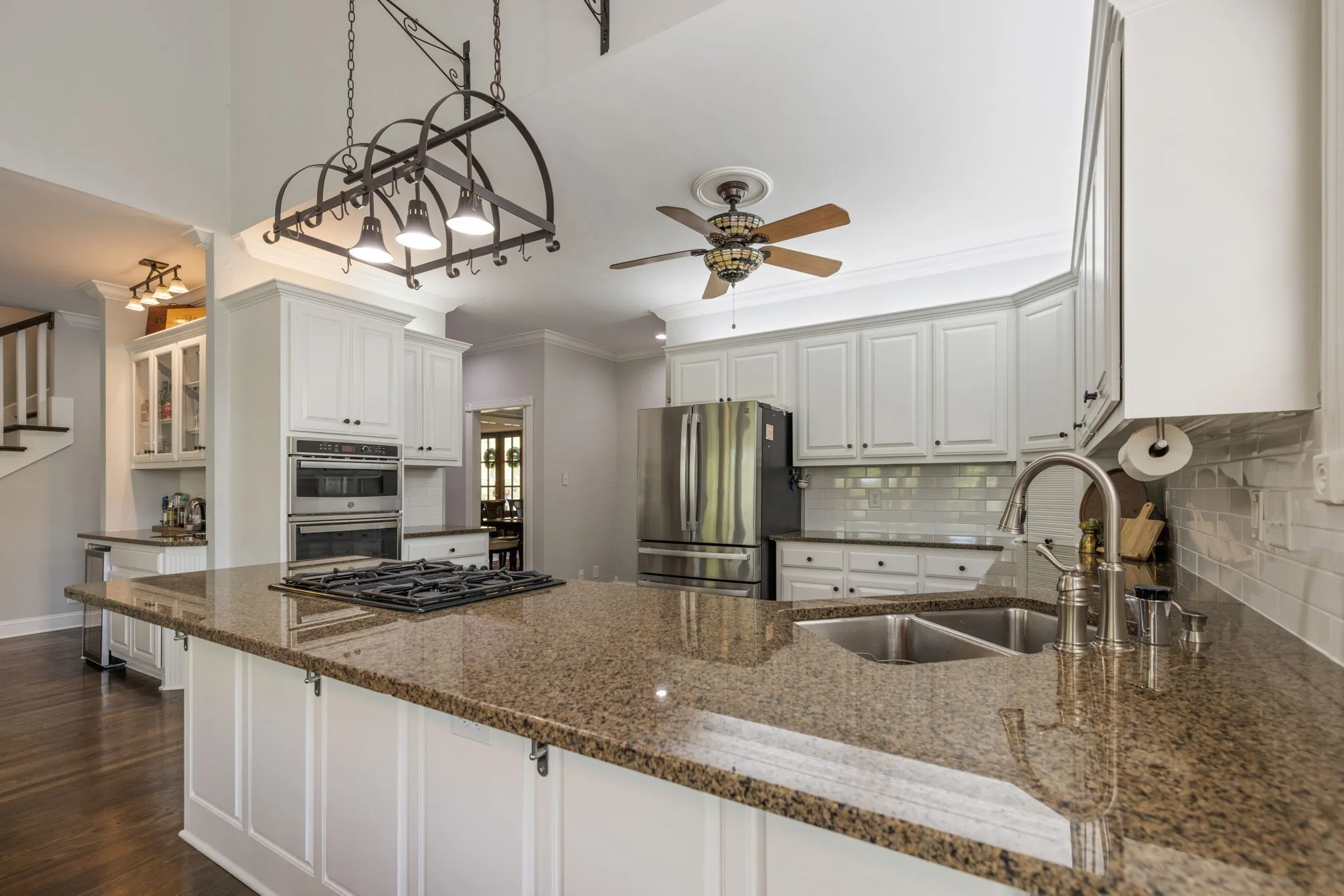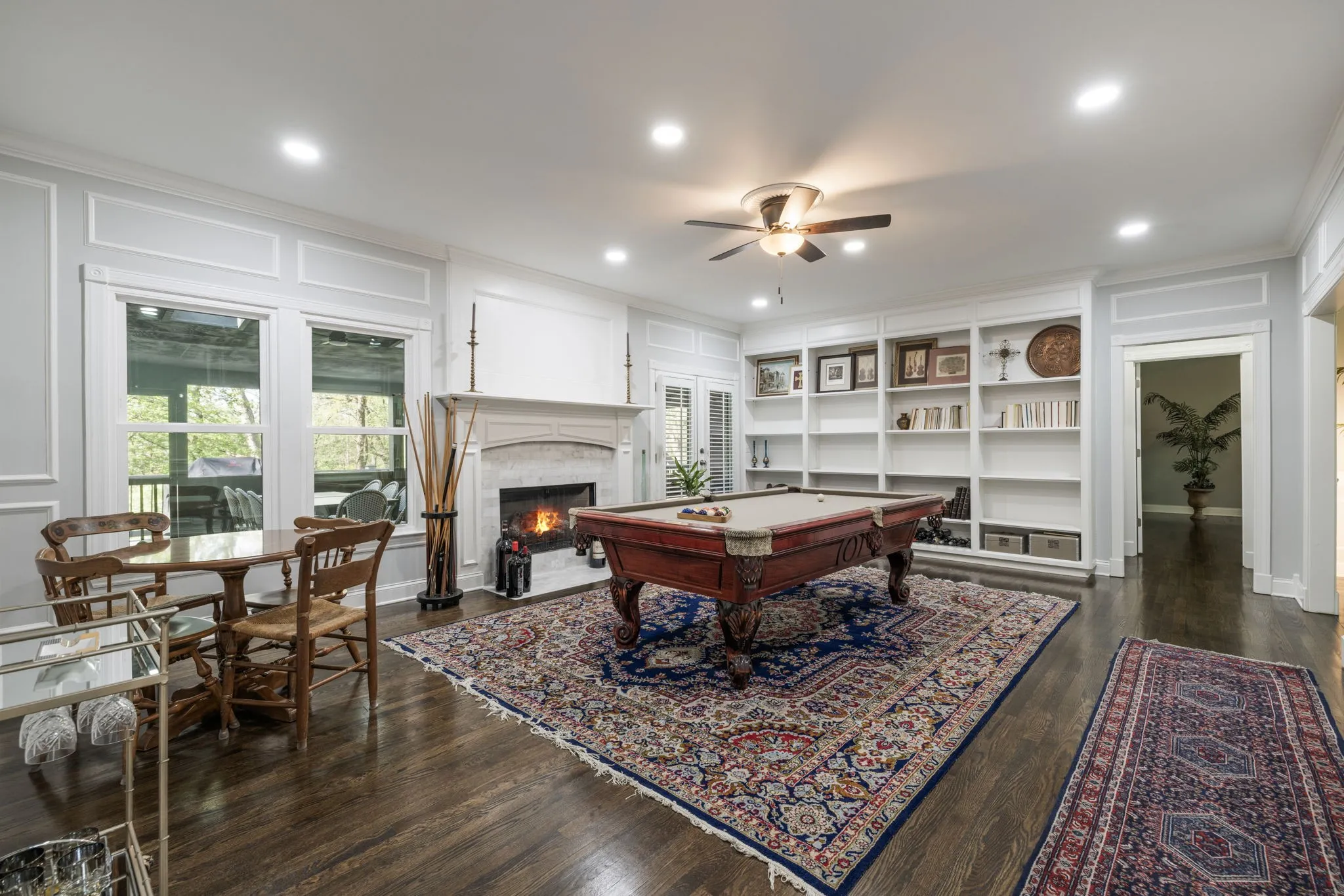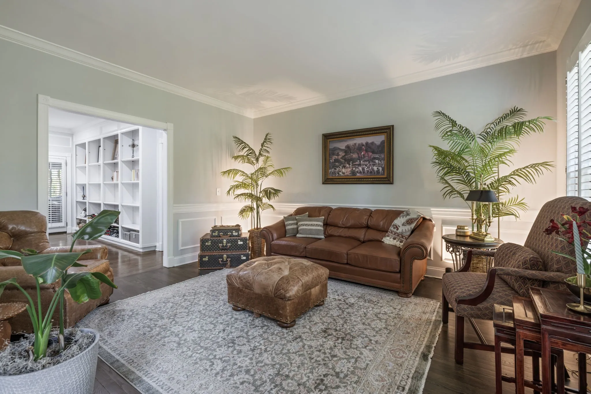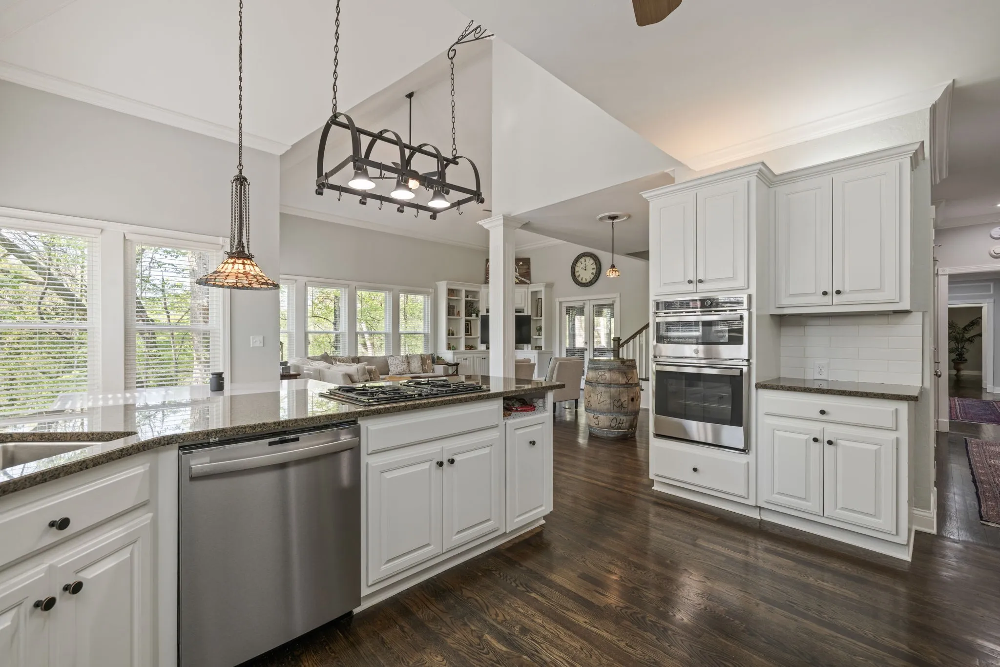 Step inside to a grand two-story foyer flanked by a formal dining room and elegant living room, all accented by rich hardwood floors and classic plantation shutters throughout the main living spaces. Designed with both everyday living and entertaining in mind, this home offers an abundance of flexible living areas, including a spacious den with custom bookcases and a cozy fireplace, plus an inviting eat-in kitchen with a breakfast nook, wet bar, and premium JennAir and GE appliances.