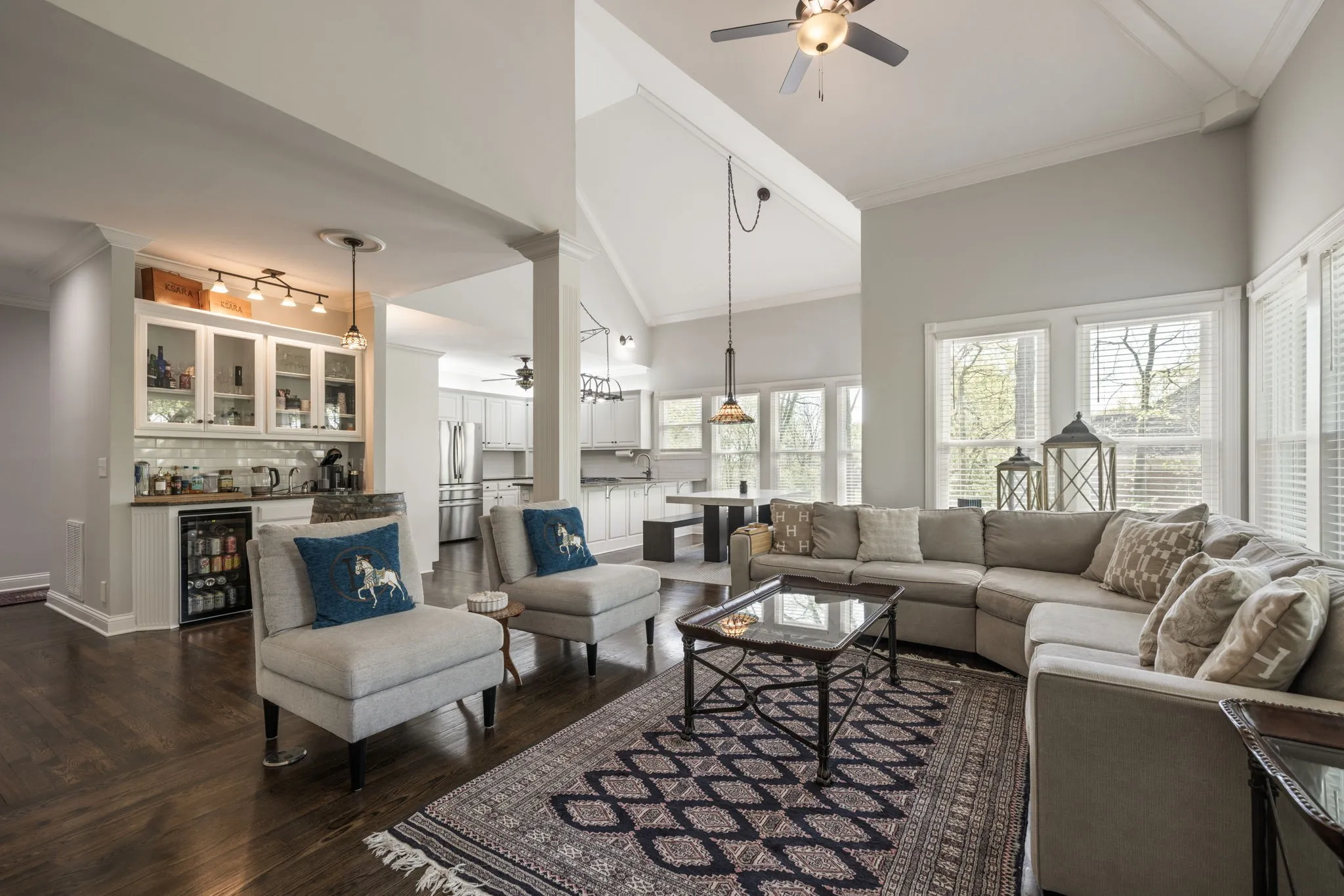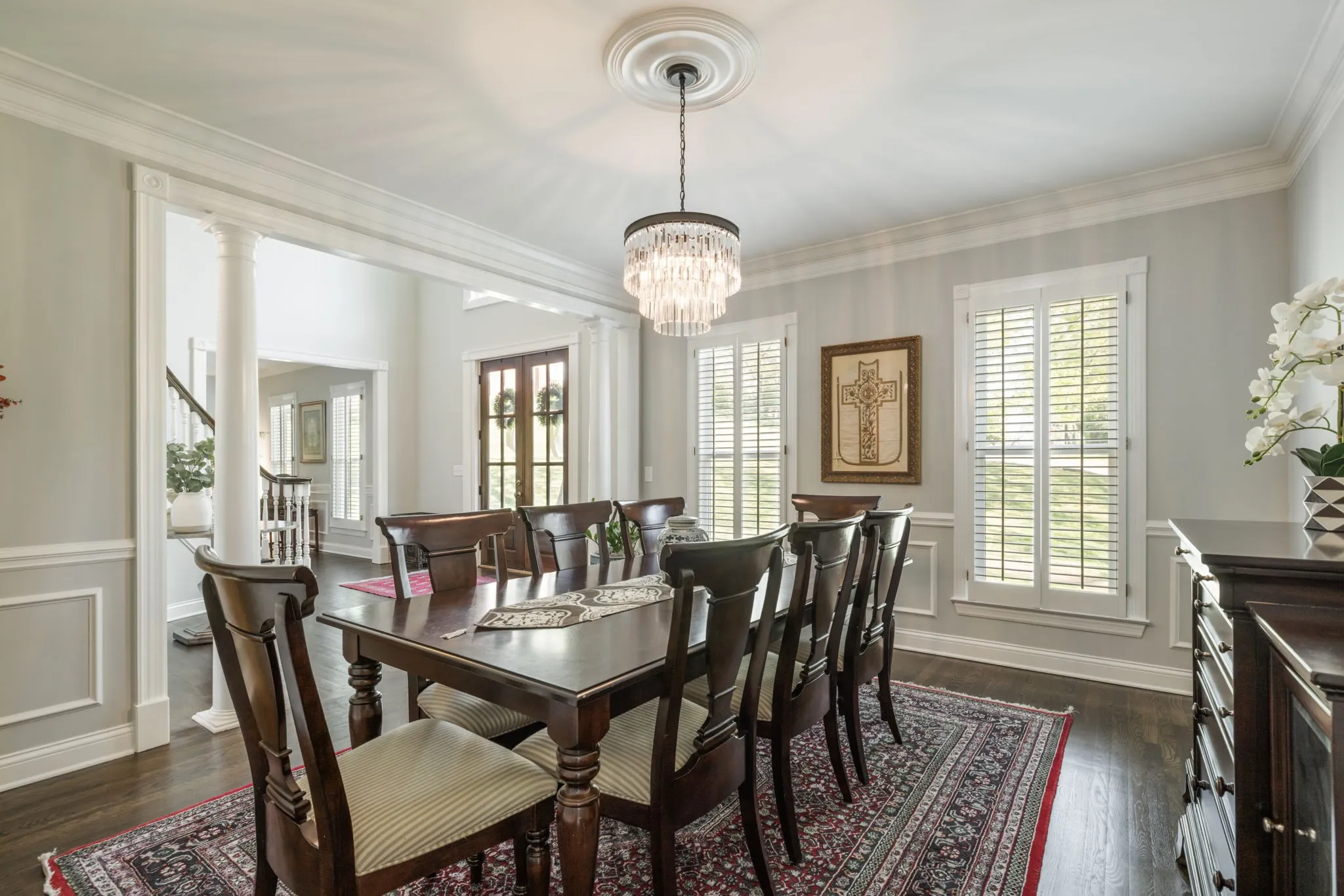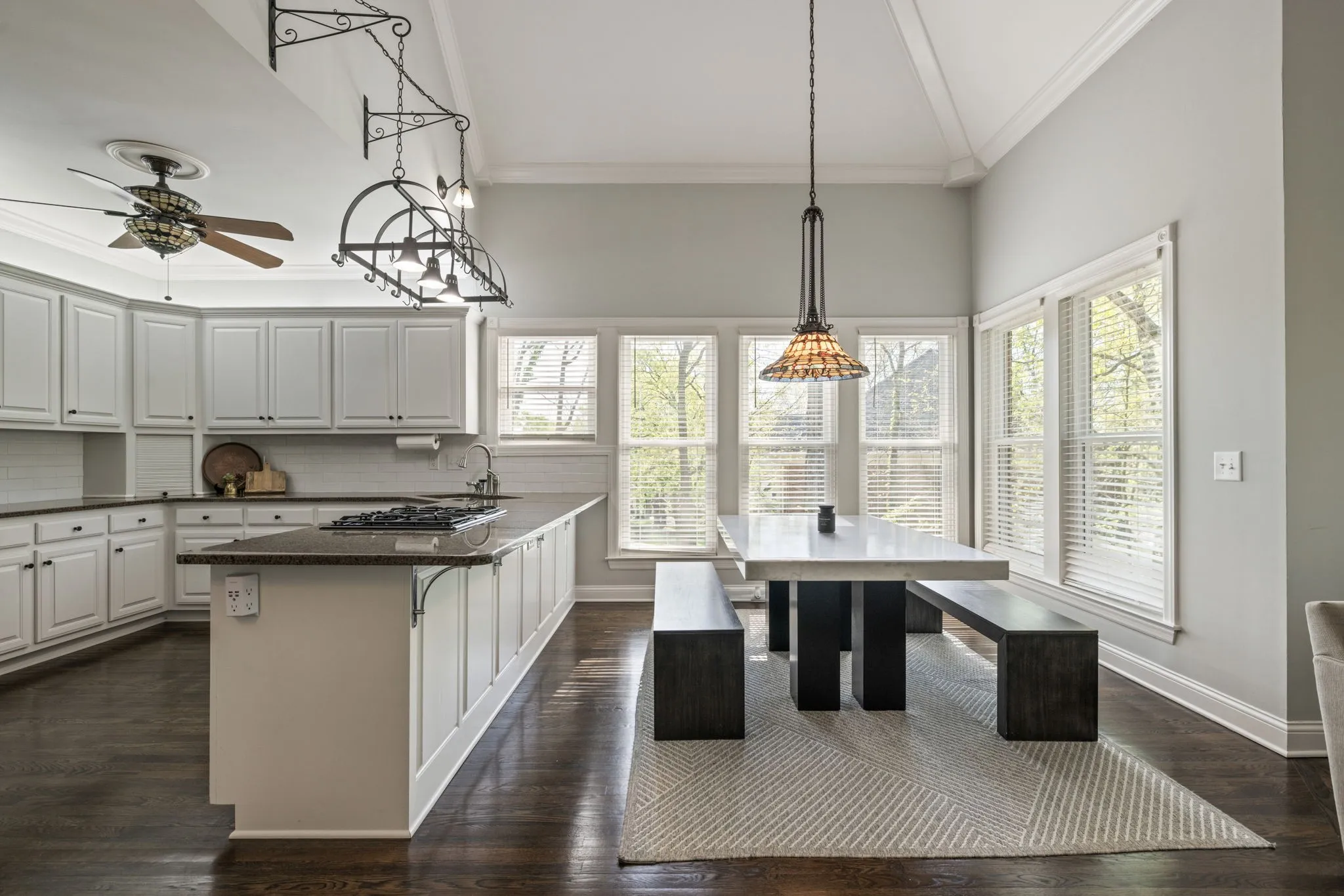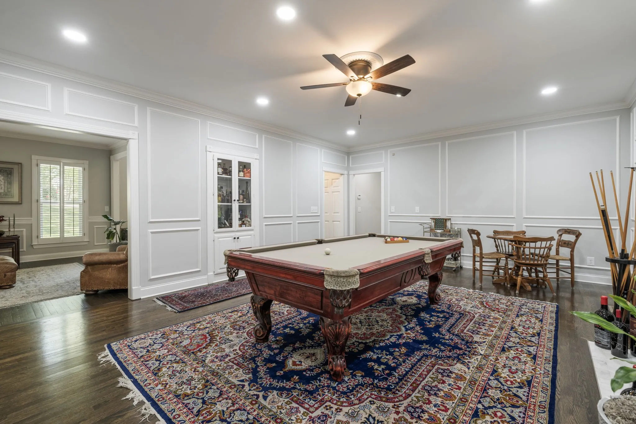 Step inside to a grand two-story foyer flanked by a formal dining room and elegant living room, all accented by rich hardwood floors and classic plantation shutters throughout the main living spaces. Designed with both everyday living and entertaining in mind, this home offers an abundance of flexible living areas, including a spacious den with custom bookcases and a cozy fireplace, plus an inviting eat-in kitchen with a breakfast nook, wet bar, and premium JennAir and GE appliances.