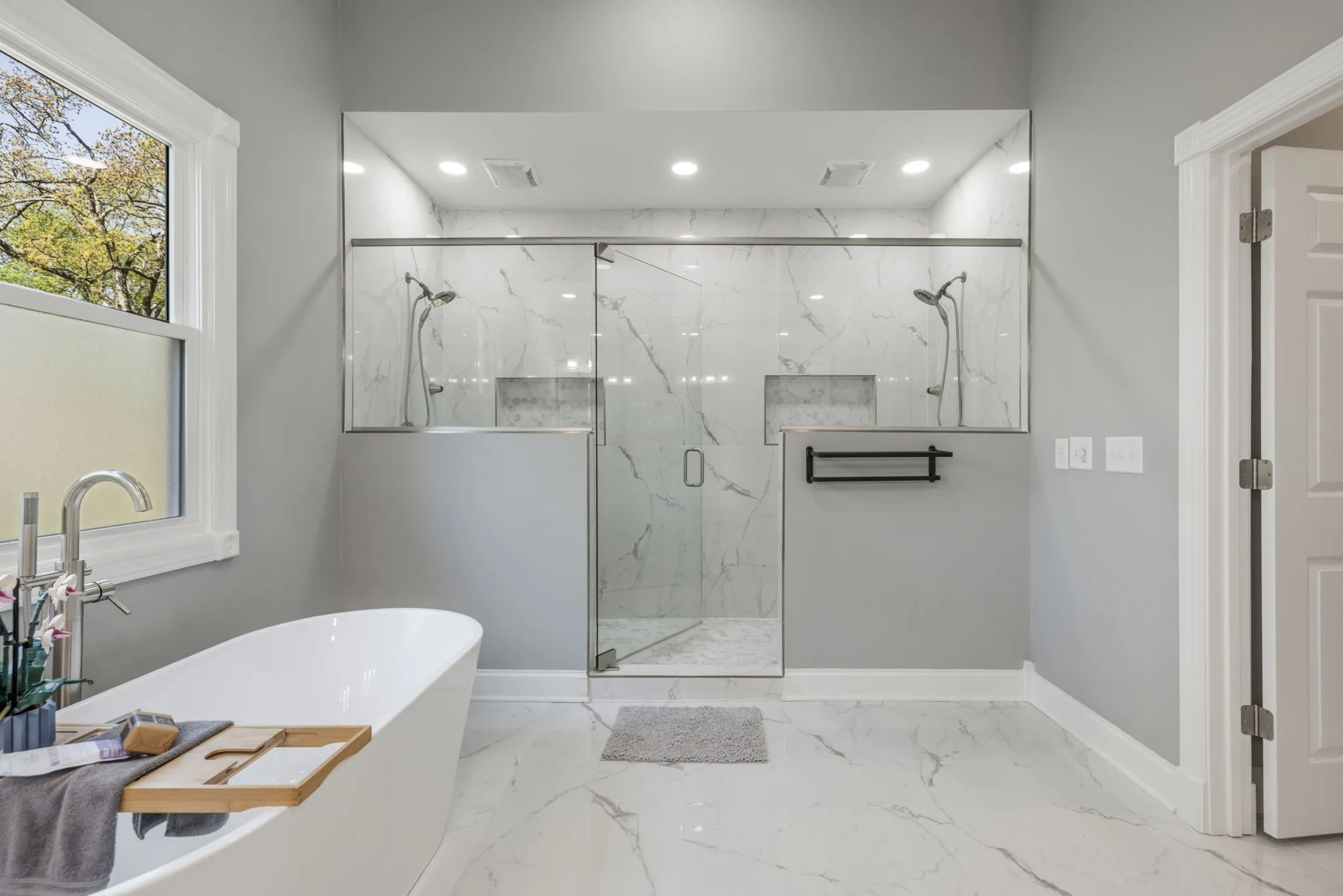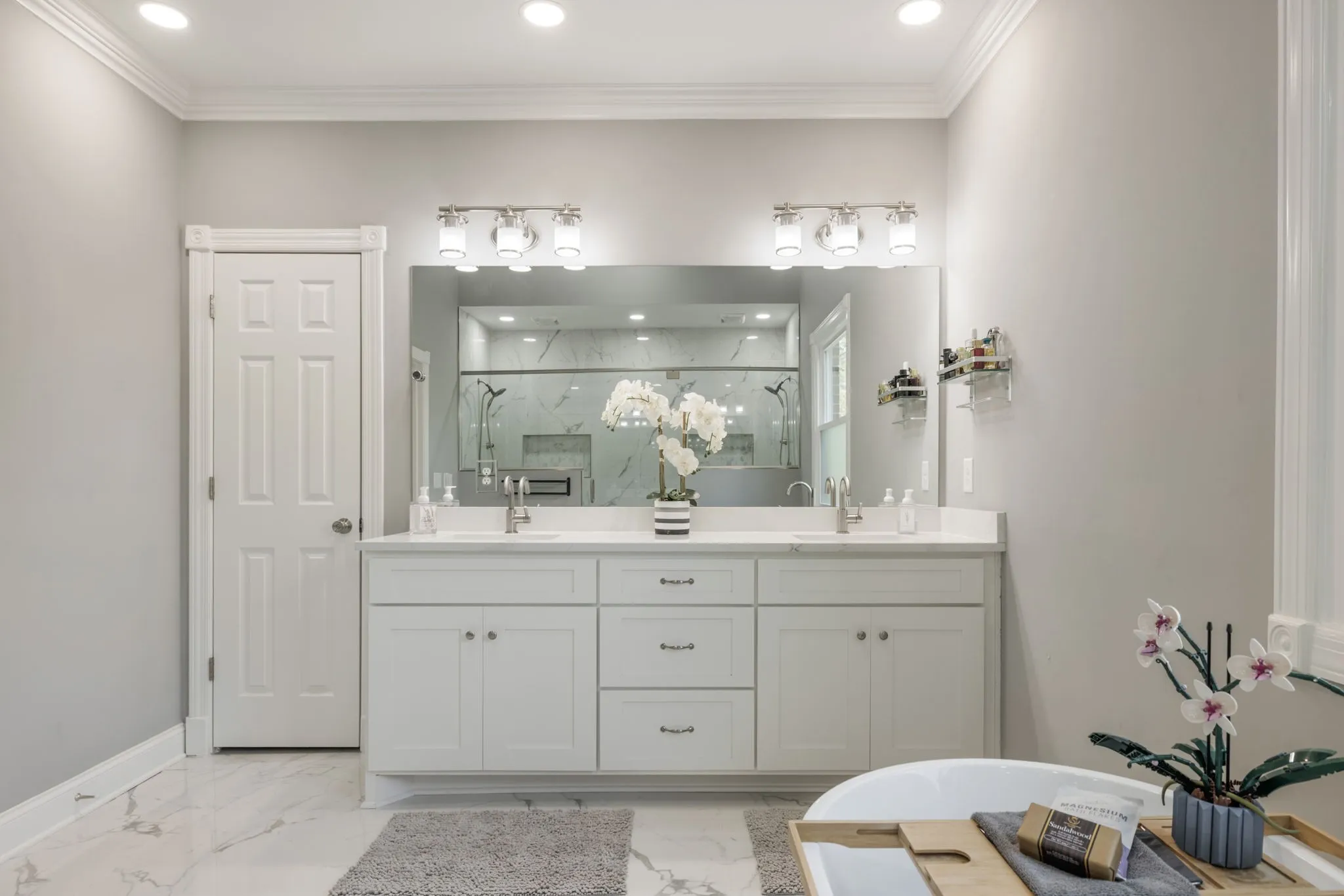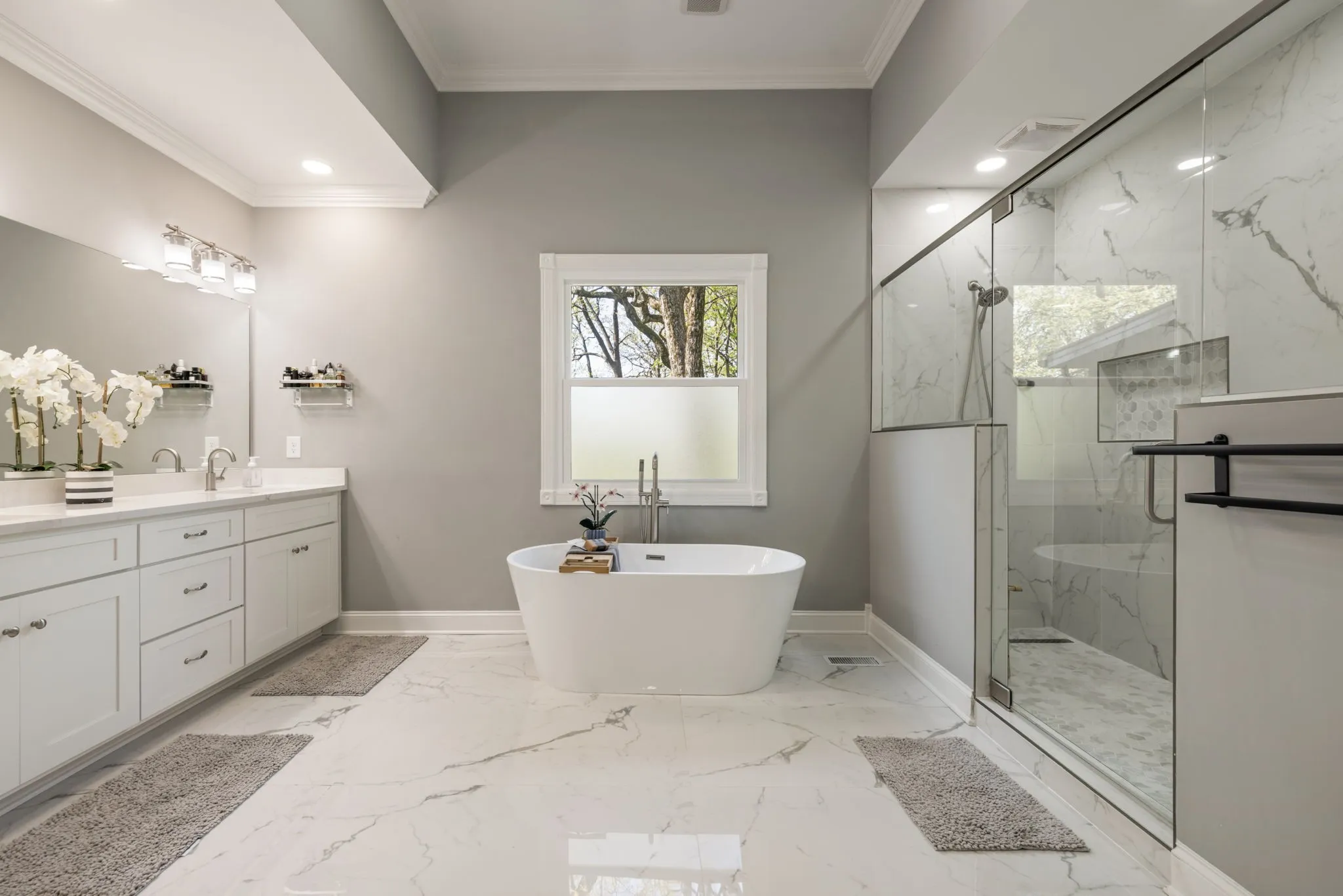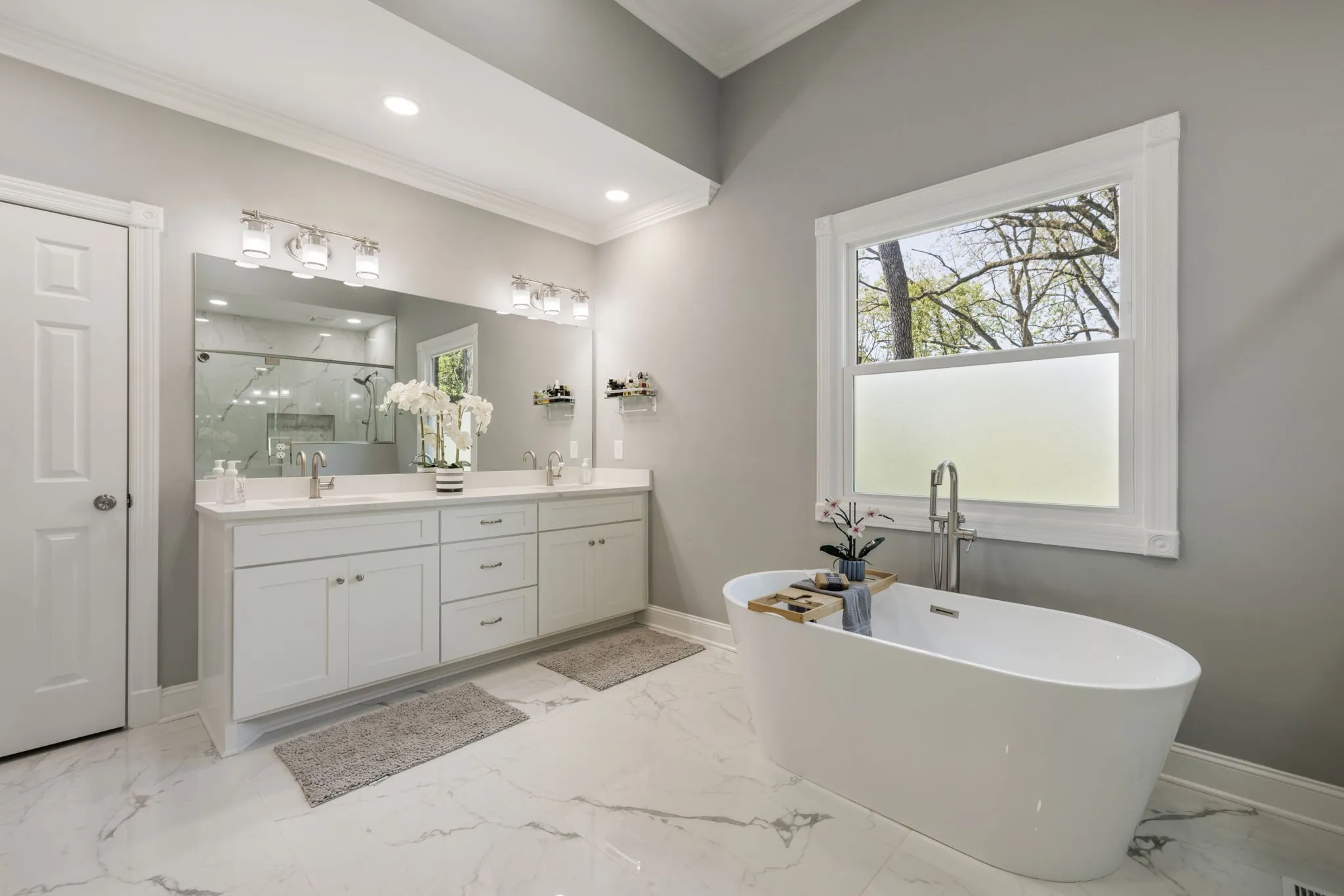 The main-level primary suite is a true retreat, featuring dual walk-in closets and a luxurious renovated spa-like bath complete with double vanities, a soaking tub, and an oversized walk-in shower designed for two.