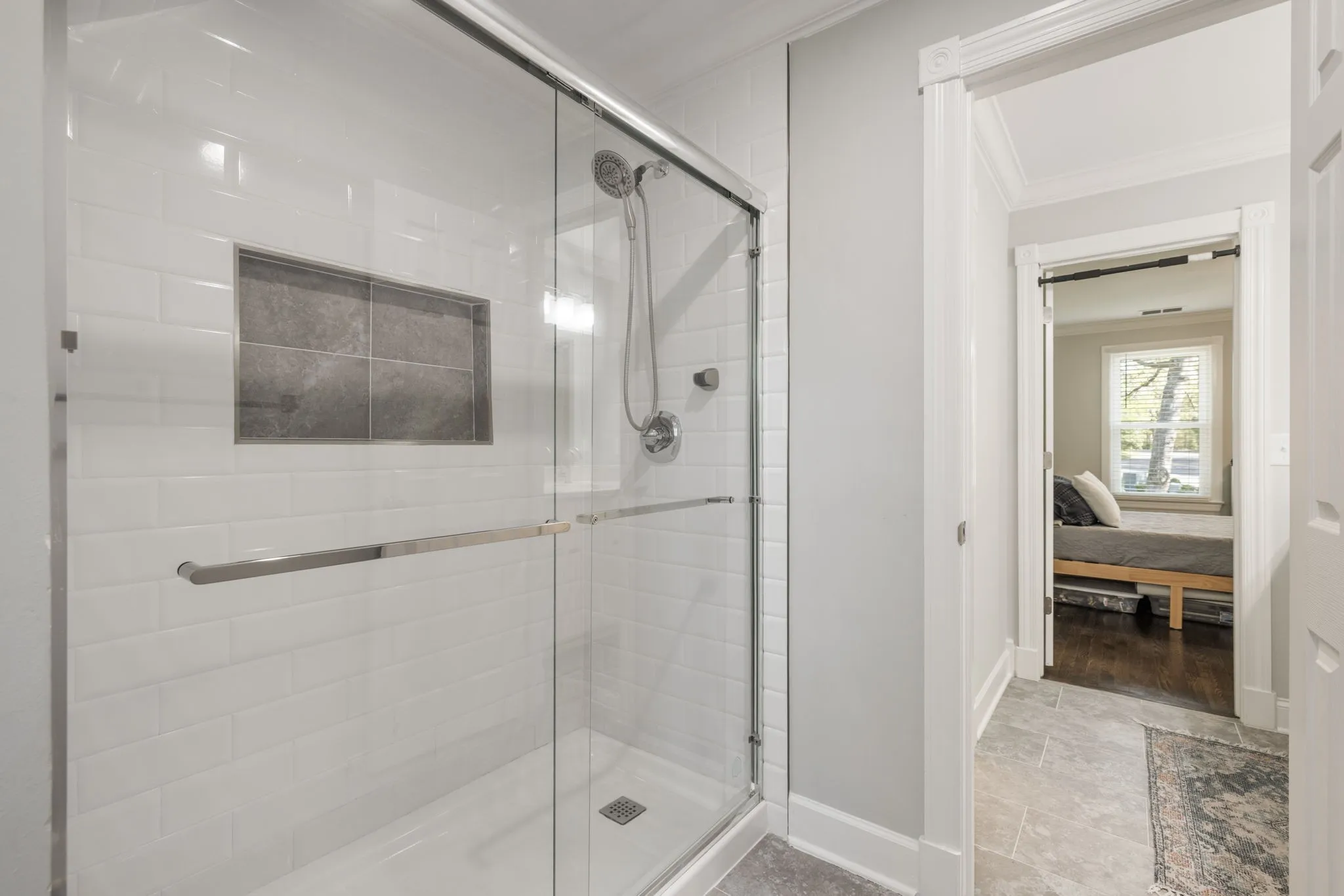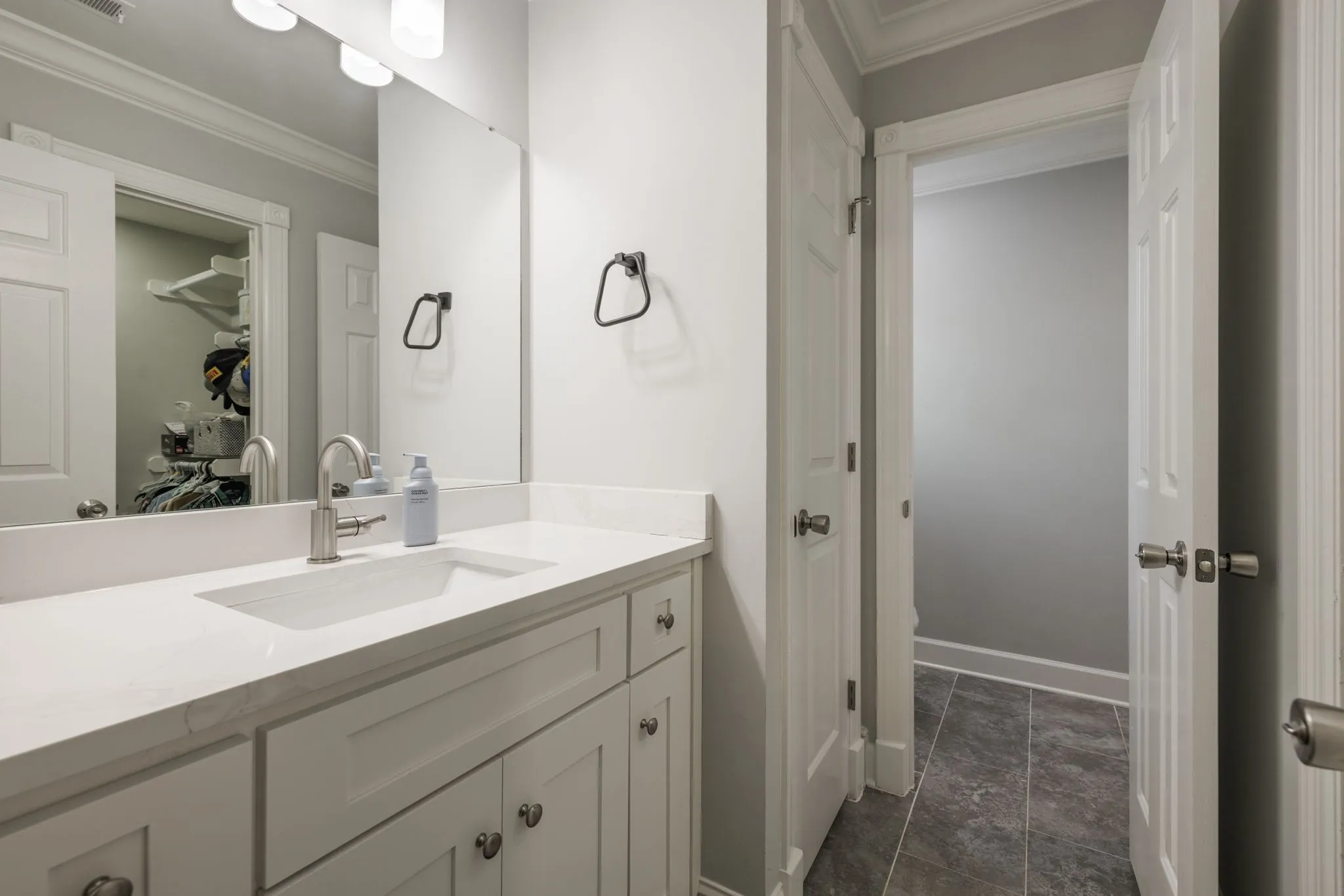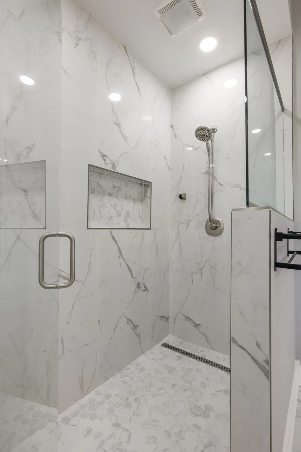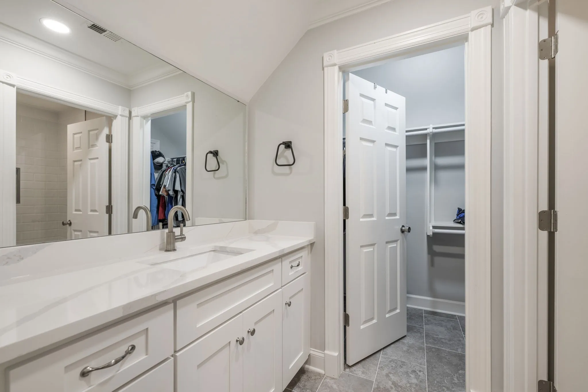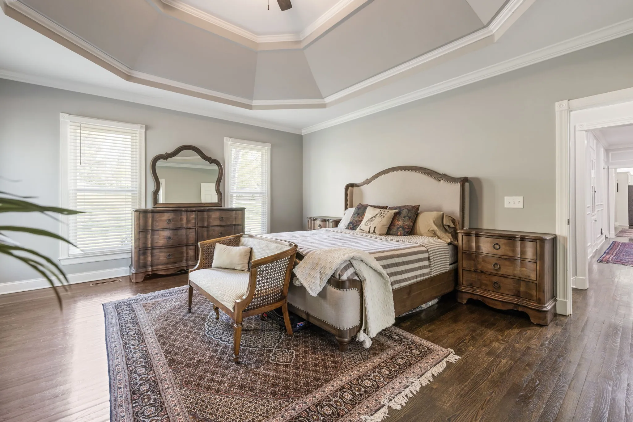 The main-level primary suite is a true retreat, featuring dual walk-in closets and a luxurious renovated spa-like bath complete with double vanities, a soaking tub, and an oversized walk-in shower designed for two.