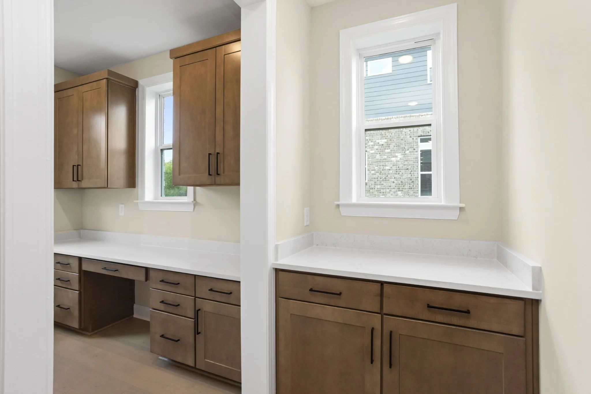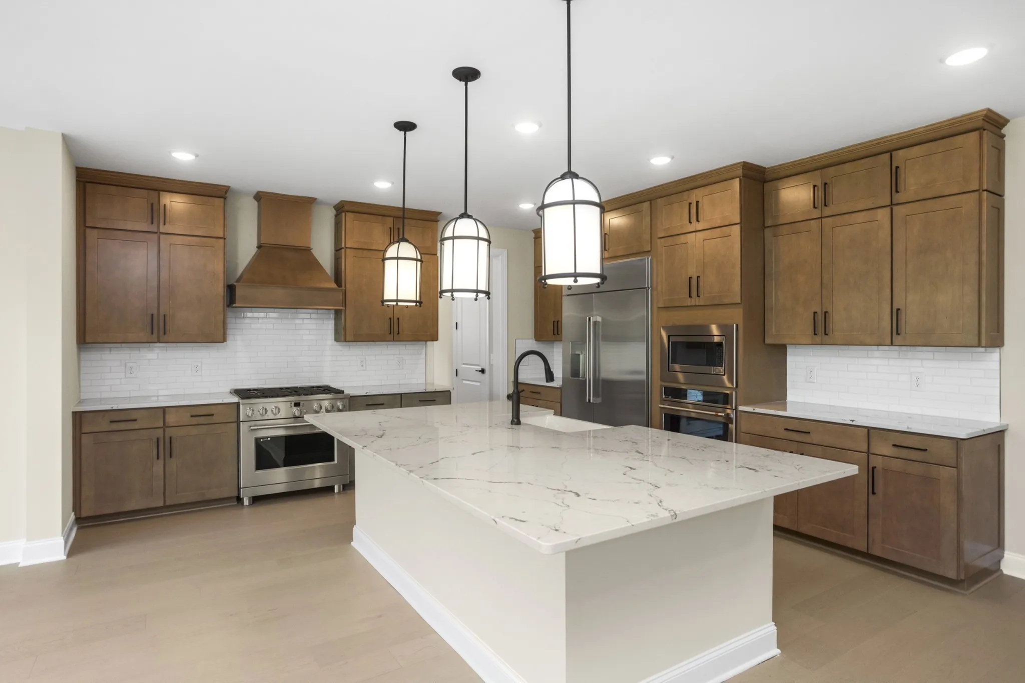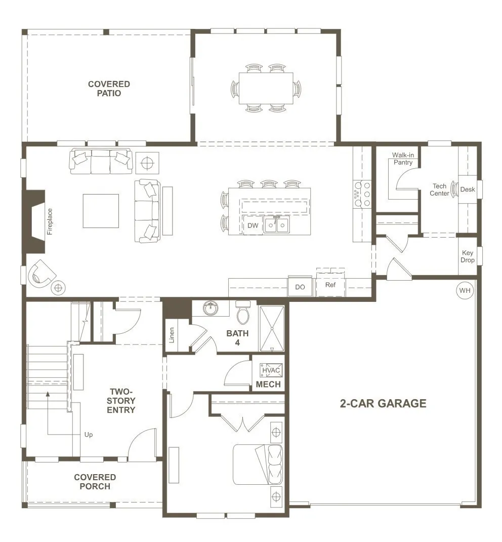 The main level features a first‑floor bedroom, ideal for guests or multi‑generational living. The kitchen anchors the home with a large island, quartz countertops, and luxury Café stainless appliances (refrigerator, wall oven, microwave, dishwasher, and gas range with dual‑heat oven), plus a butler’s pantry with wet bar. The den centers around a cozy gas fireplace, and the covered patio extends your living outdoors.