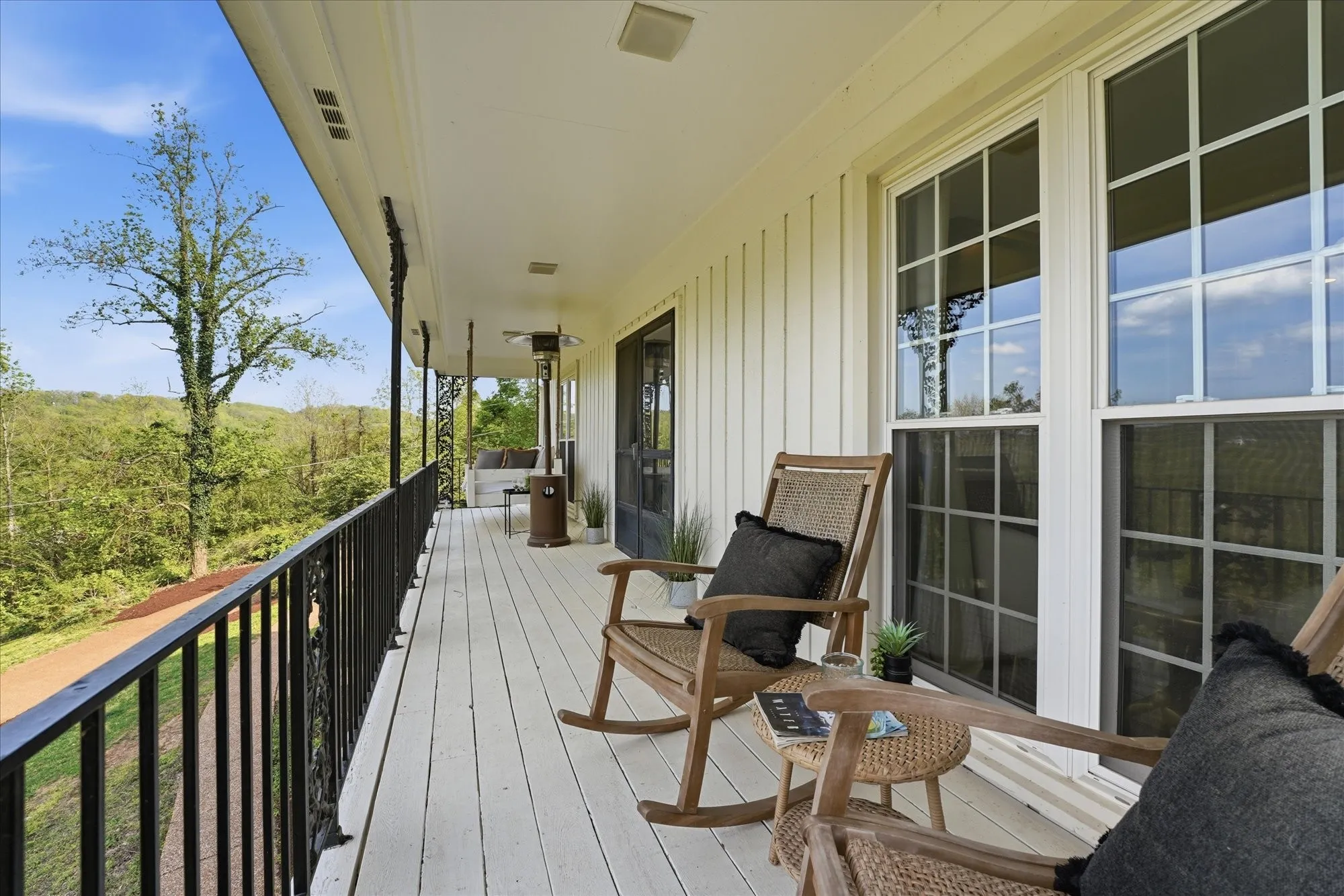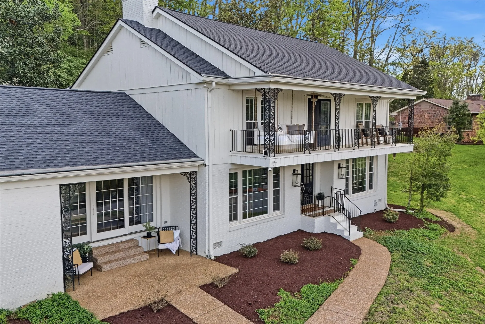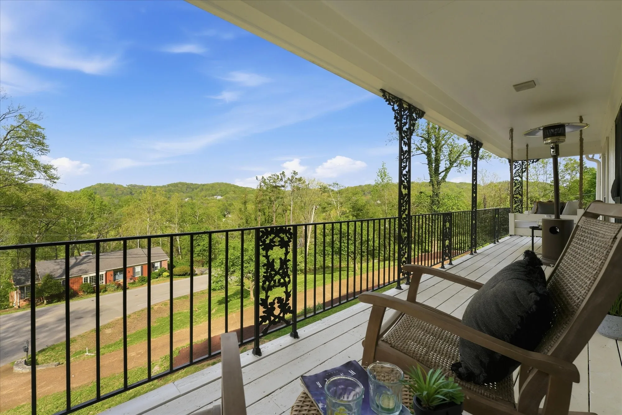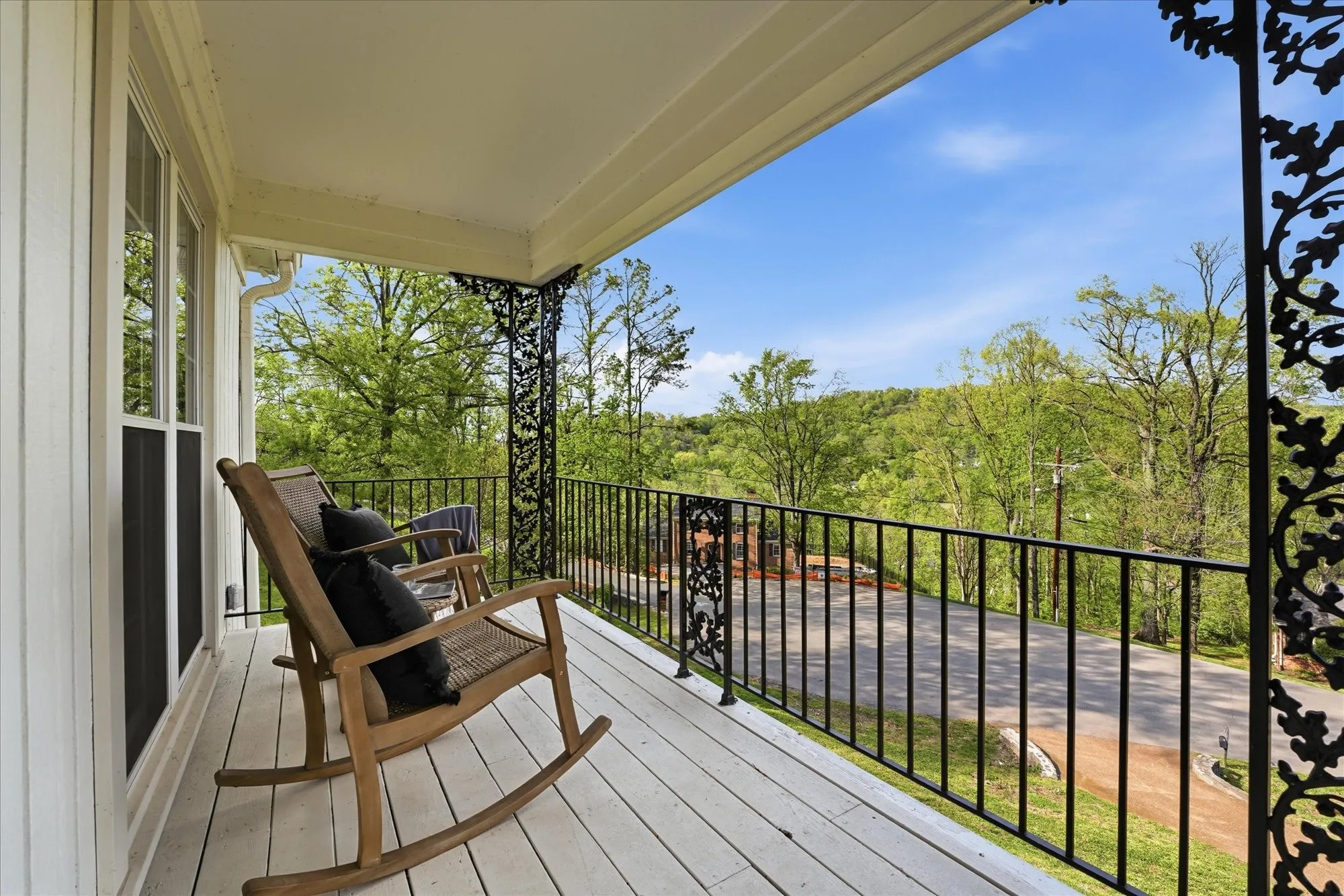 Inside, the home exudes timeless sophistication and warmth, highlighted by exposed brick accents in both the kitchen and living room, a charming wood-burning fireplace insert, and generous living spaces designed for both everyday comfort and elegant entertaining. The sprawling upper-level balcony provides a breathtaking vantage point overlooking the rolling hills of Forest Hills, creating an ideal setting for morning coffee or evening sunsets.