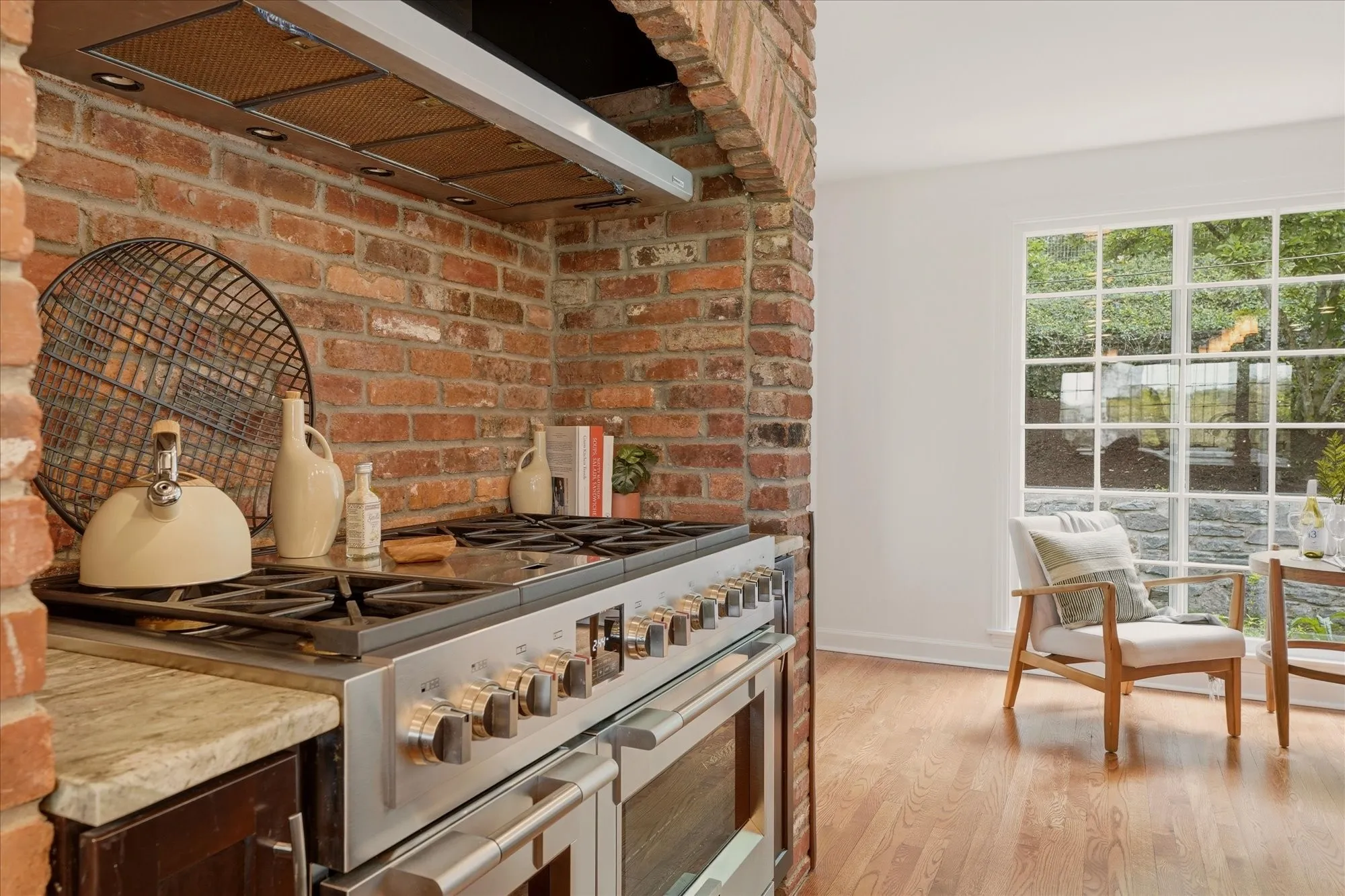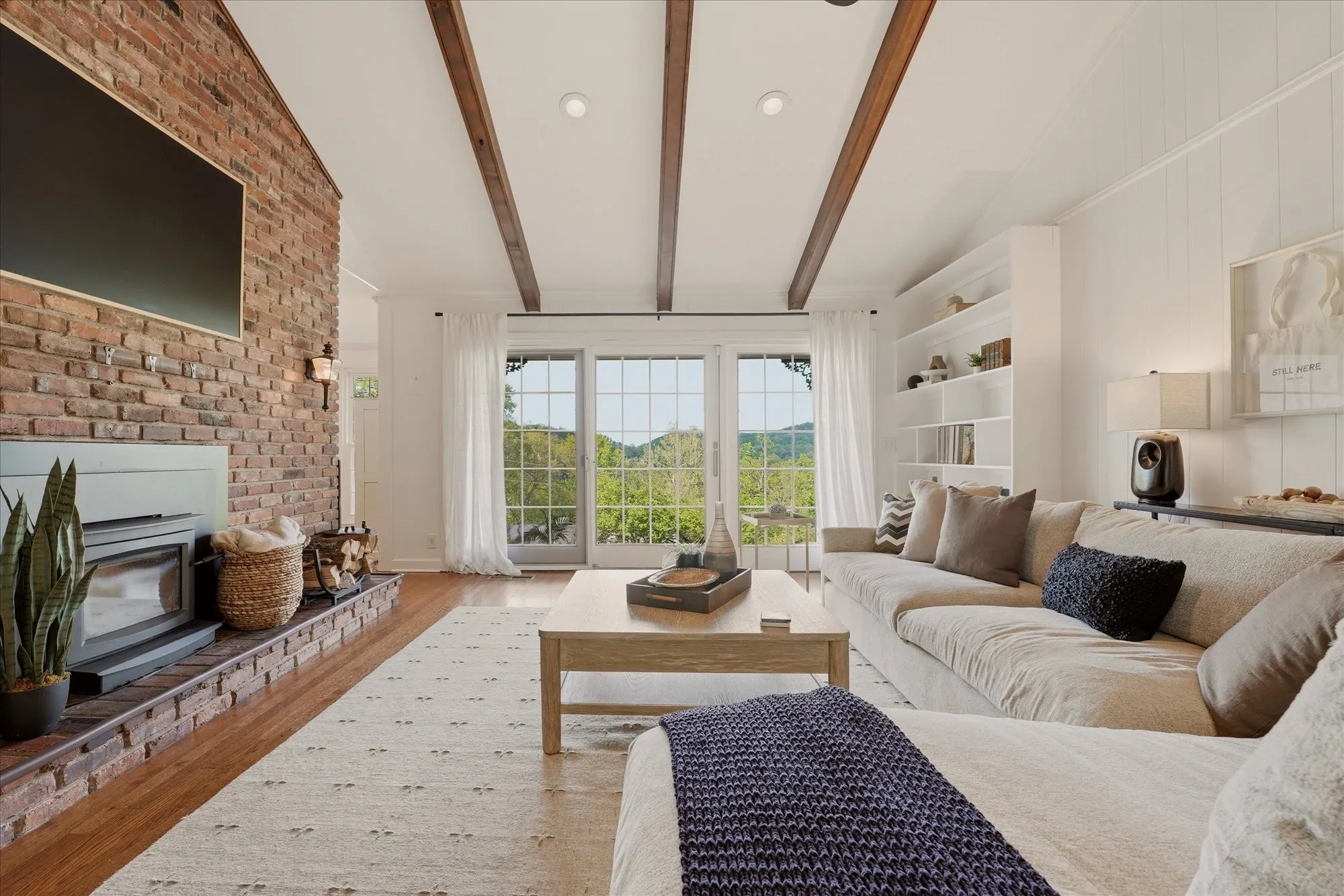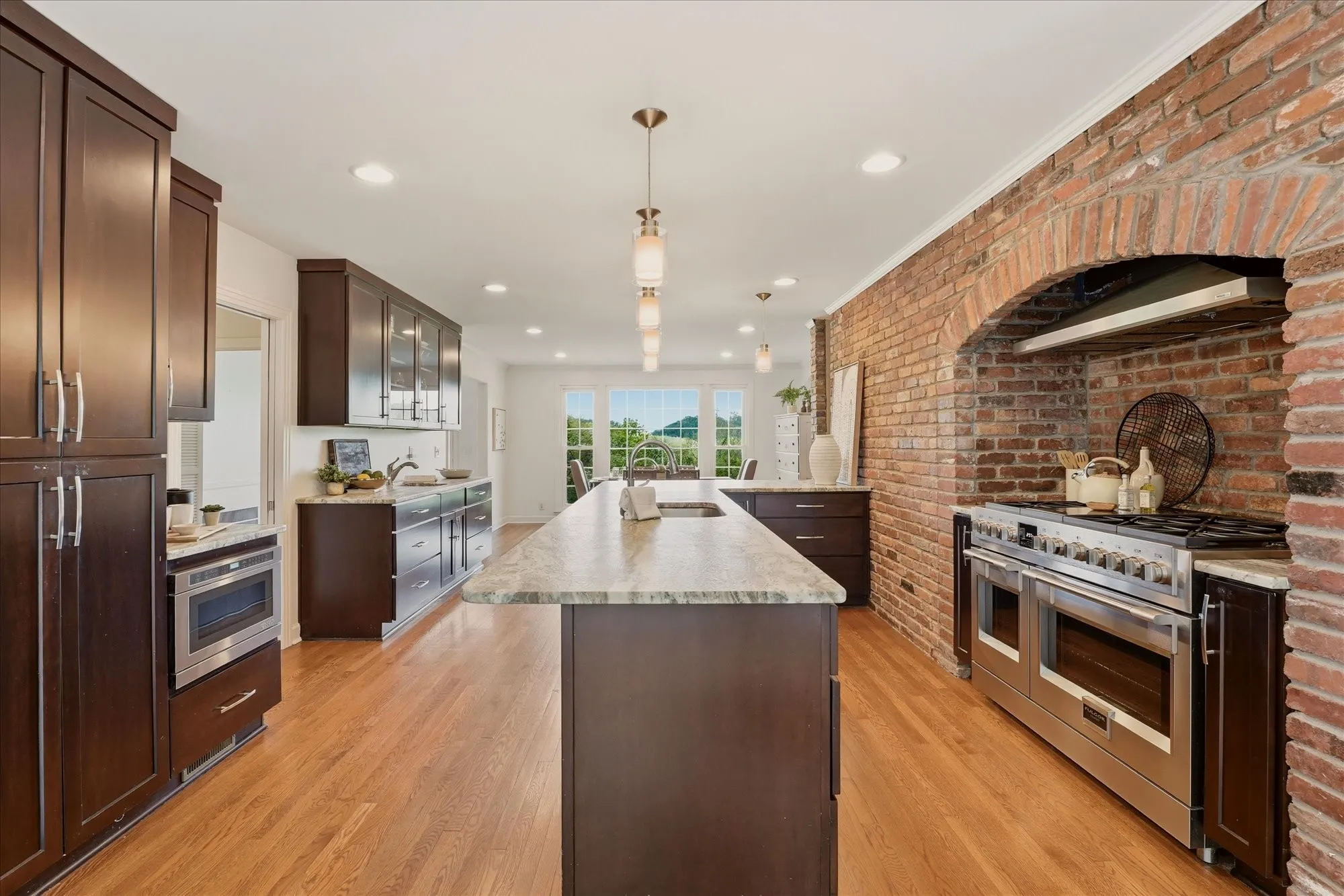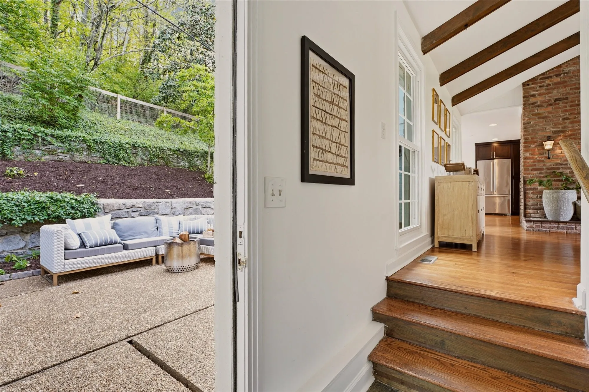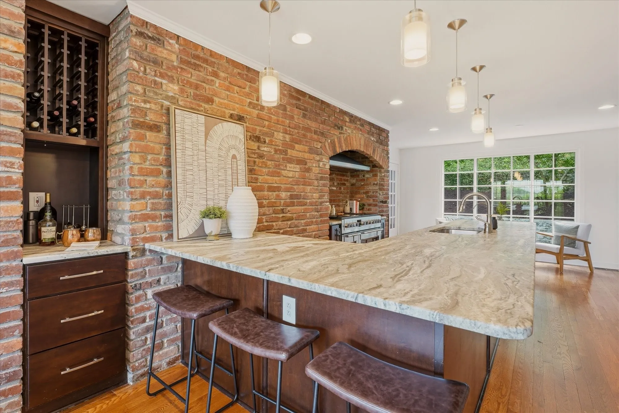 Inside, the home exudes timeless sophistication and warmth, highlighted by exposed brick accents in both the kitchen and living room, a charming wood-burning fireplace insert, and generous living spaces designed for both everyday comfort and elegant entertaining. The sprawling upper-level balcony provides a breathtaking vantage point overlooking the rolling hills of Forest Hills, creating an ideal setting for morning coffee or evening sunsets.