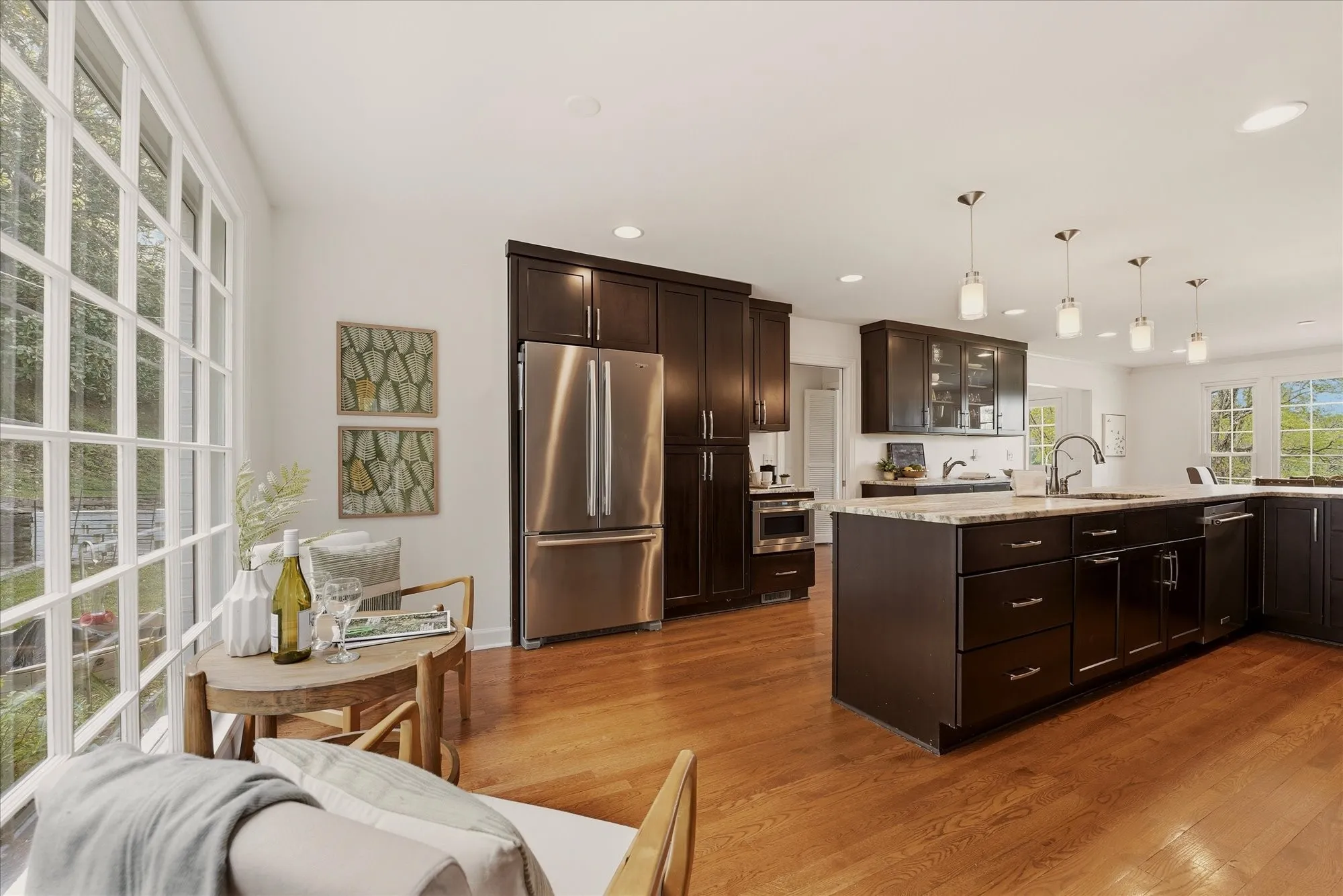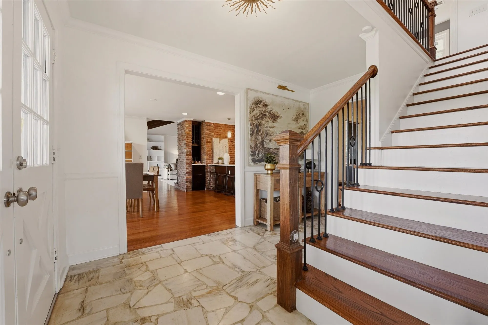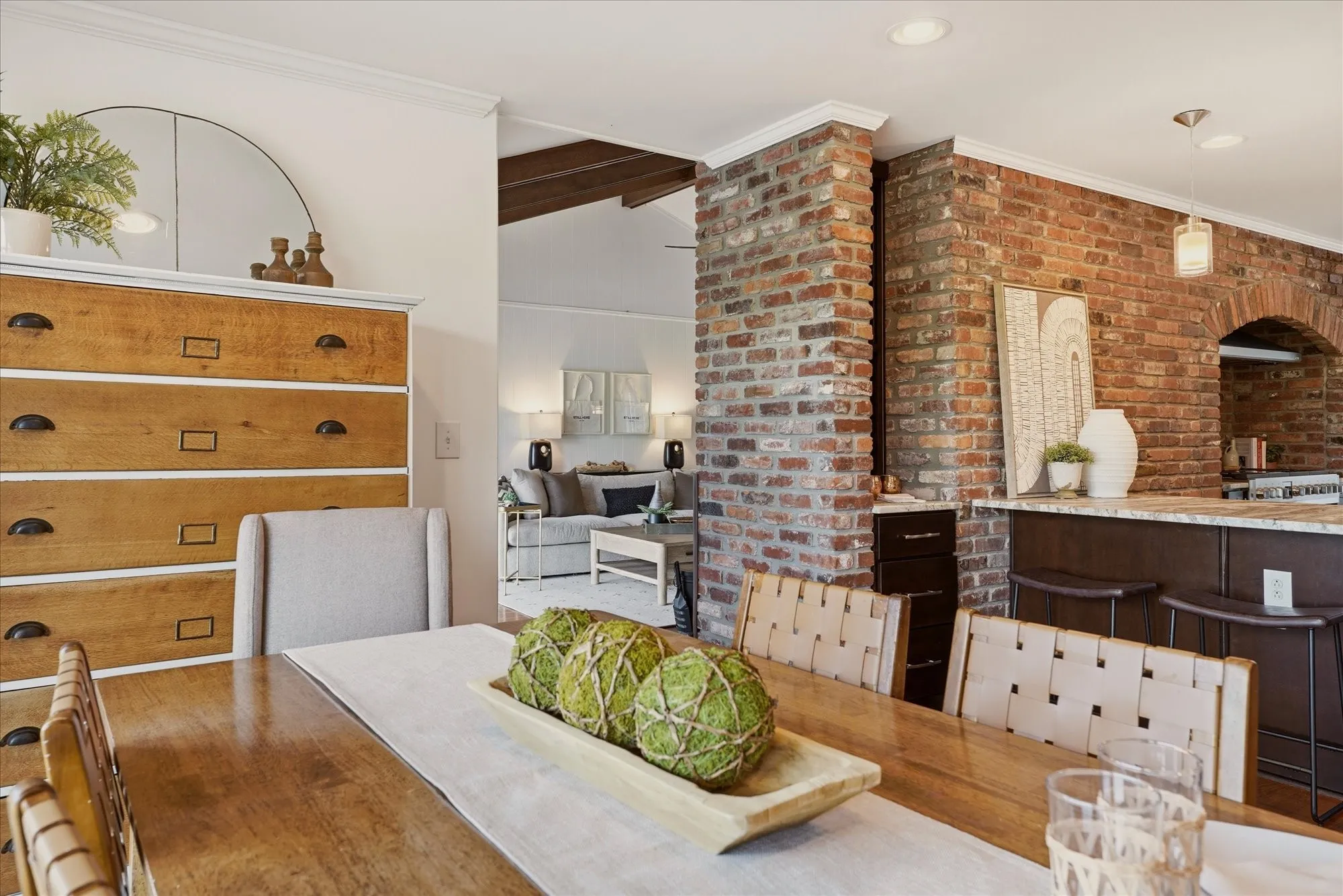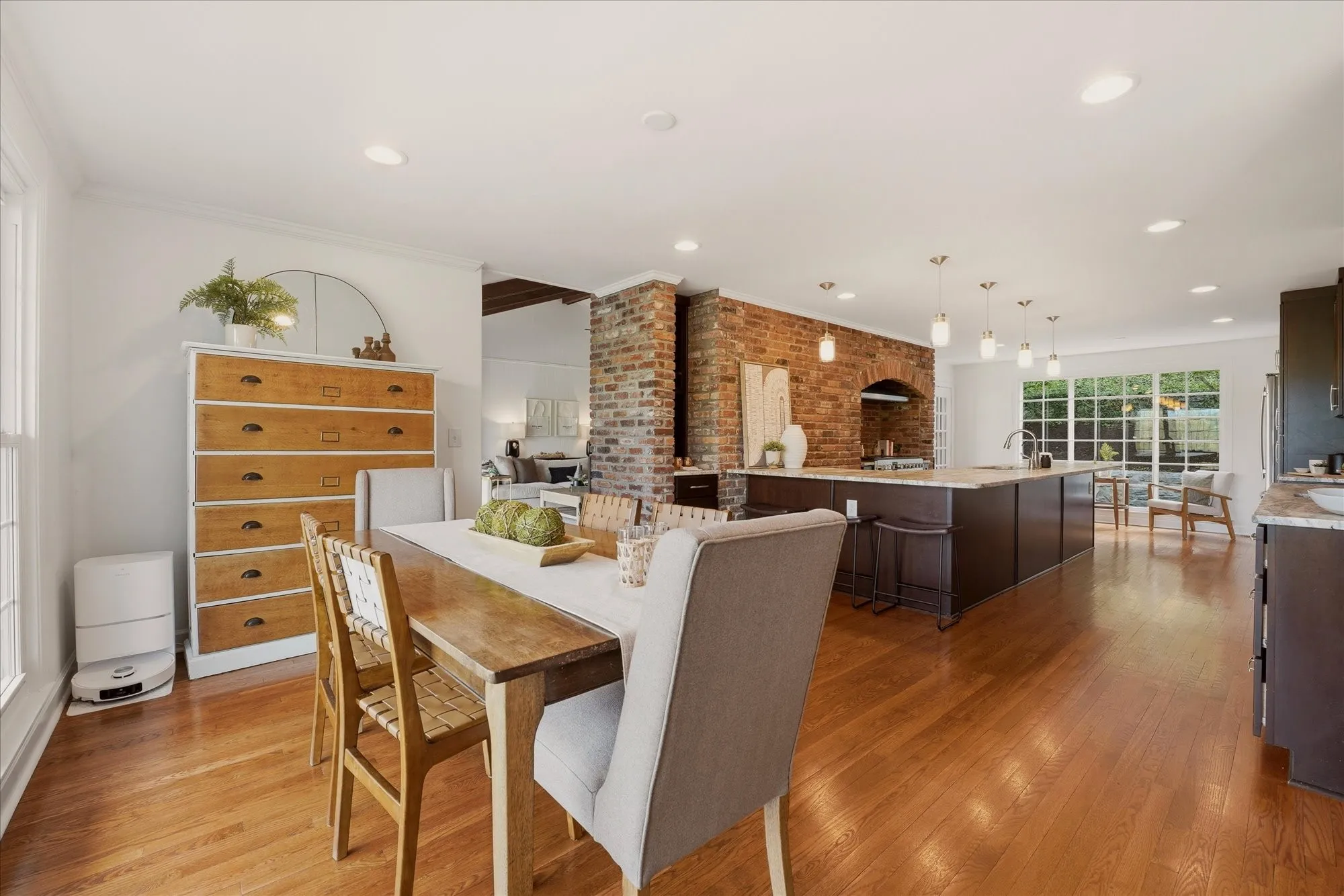 Inside, the home exudes timeless sophistication and warmth, highlighted by exposed brick accents in both the kitchen and living room, a charming wood-burning fireplace insert, and generous living spaces designed for both everyday comfort and elegant entertaining. The sprawling upper-level balcony provides a breathtaking vantage point overlooking the rolling hills of Forest Hills, creating an ideal setting for morning coffee or evening sunsets.
