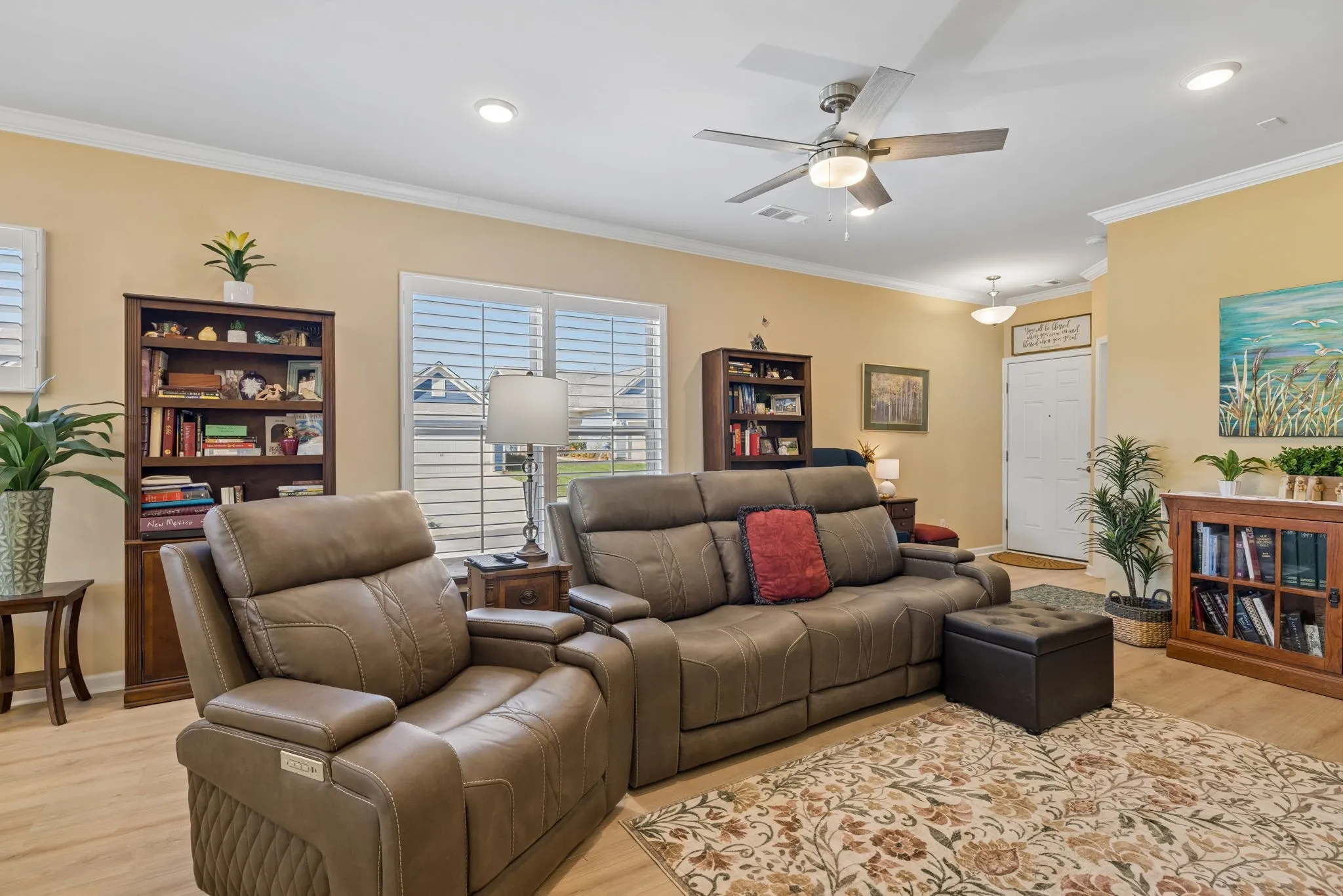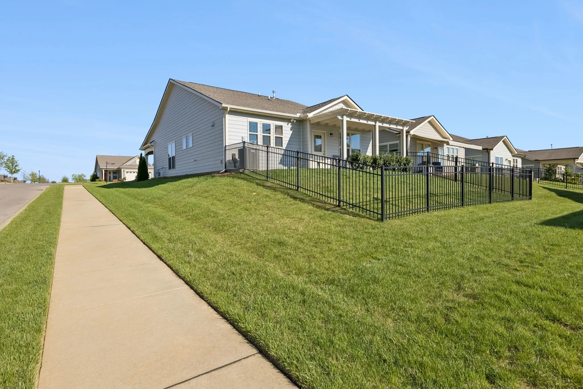 Come see this beautiful home in Southern Springs by Del Webb, a premier 55+ community that feels like the perfect “staycation.” The community includes active wellness featuring a state-of-the-art fitness center, indoor and outdoor pools, and courts for tennis and pickleball. The grand clubhouse features ballrooms, gamerooms, a lending library and a cozy community firepit. There is even a dog park for a safe, off-leash environment where dogs can run and play. In this spacious two-bedroom home, you will be greeted by a charming front porch with stacked stone pillars and a vibrant blue entry door, providing a warm welcome home. Come inside to the great room, a spacious retreat perfect for quiet evenings or hosting friends. Enjoy the light and airy kitchen which includes designer finishes and expansive center island anchored by elegant pendant lighting. This home includes a fully enclosed and climate controlled sunroom perfect for enjoying abundant natural light during a humid Tennessee July or a warm beverage on a chilly January morning. Finally step out of the back door and enjoy your private fenced-in backyard, offering a secure and beautiful place for pets and gardening as well as a great view of the evening sunsets.