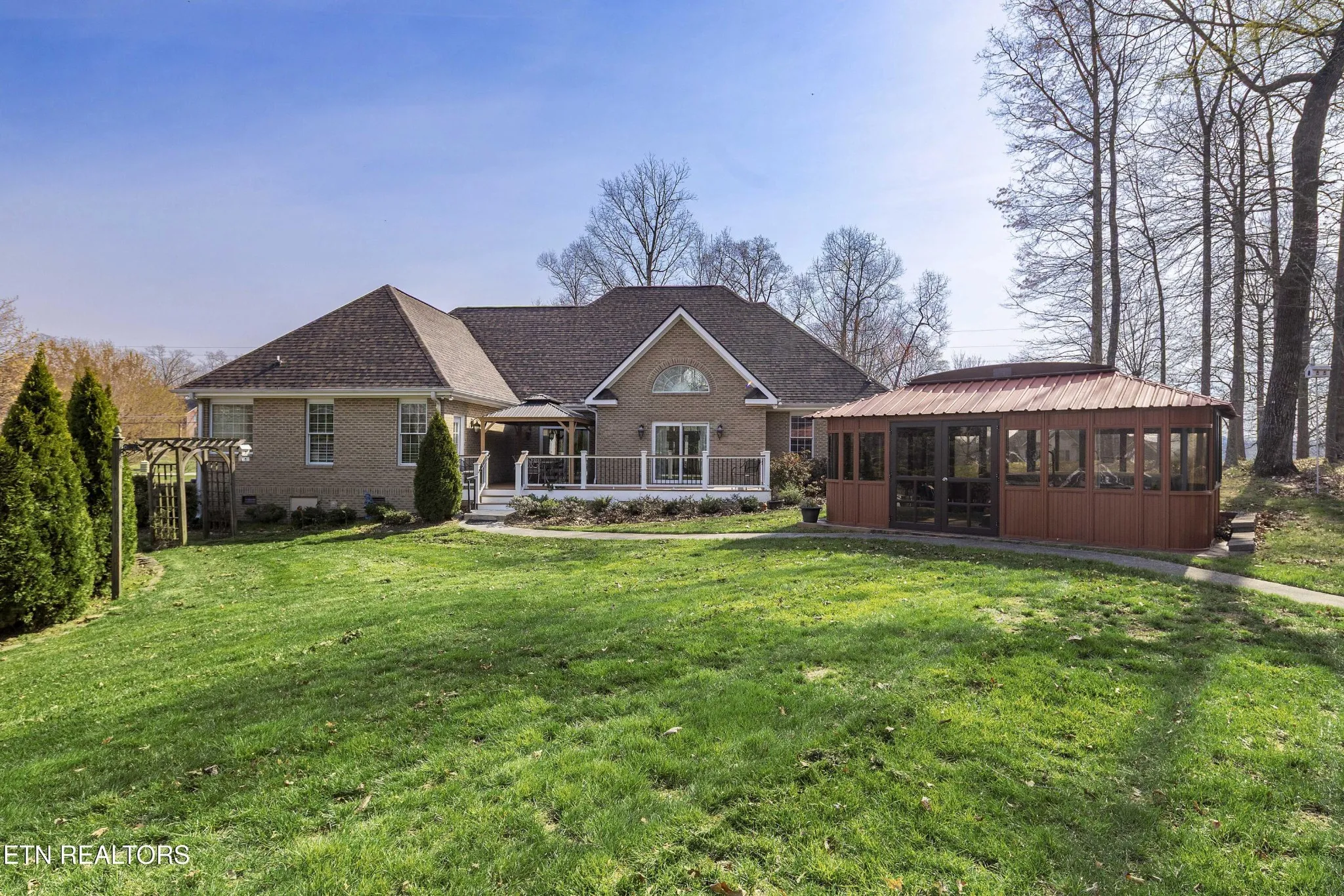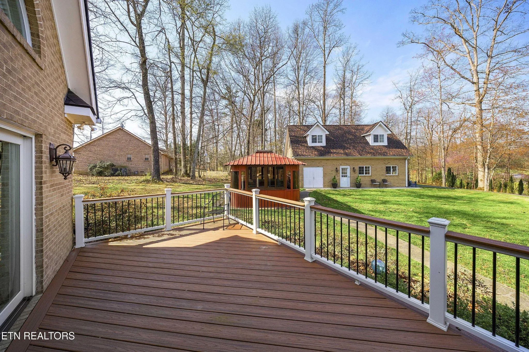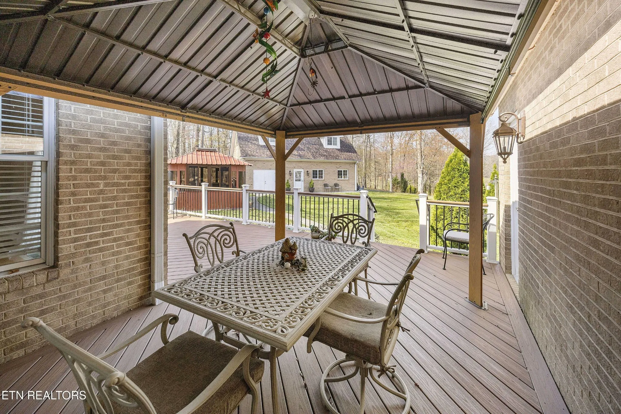 Outdoor features include a composite deck, covered seating area, and a gazebo with a hot tub, creating multiple options for outdoor use.