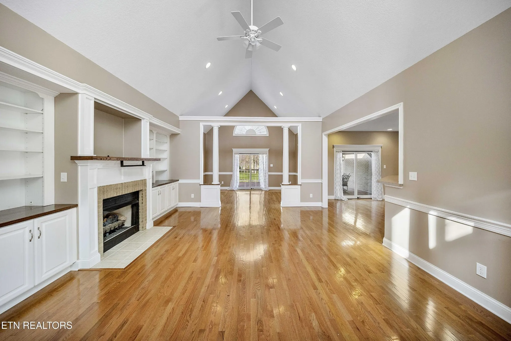 The main living area has hardwood flooring, a gas fireplace, built-in bookcases, and a cathedral ceiling creating an open area that transitions seamlessly into the kitchen. The kitchen is equipped with stainless steel appliances (including the refrigerator), generous cabinetry, and a functional layout that supports both everyday use and entertaining. A dedicated laundry room, including washer & dryer, and additional cabinets for storage enhances the home’s overall efficiency.