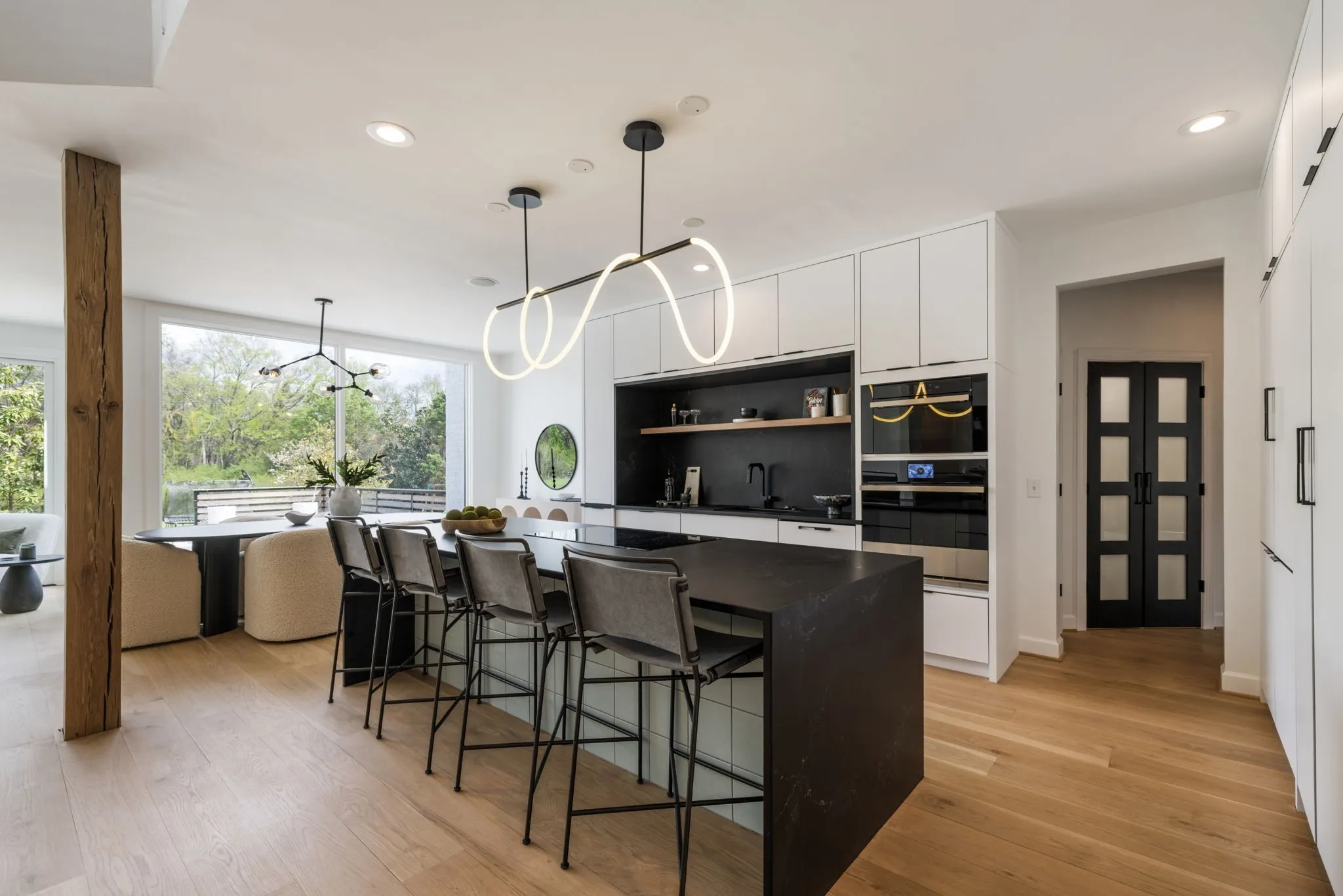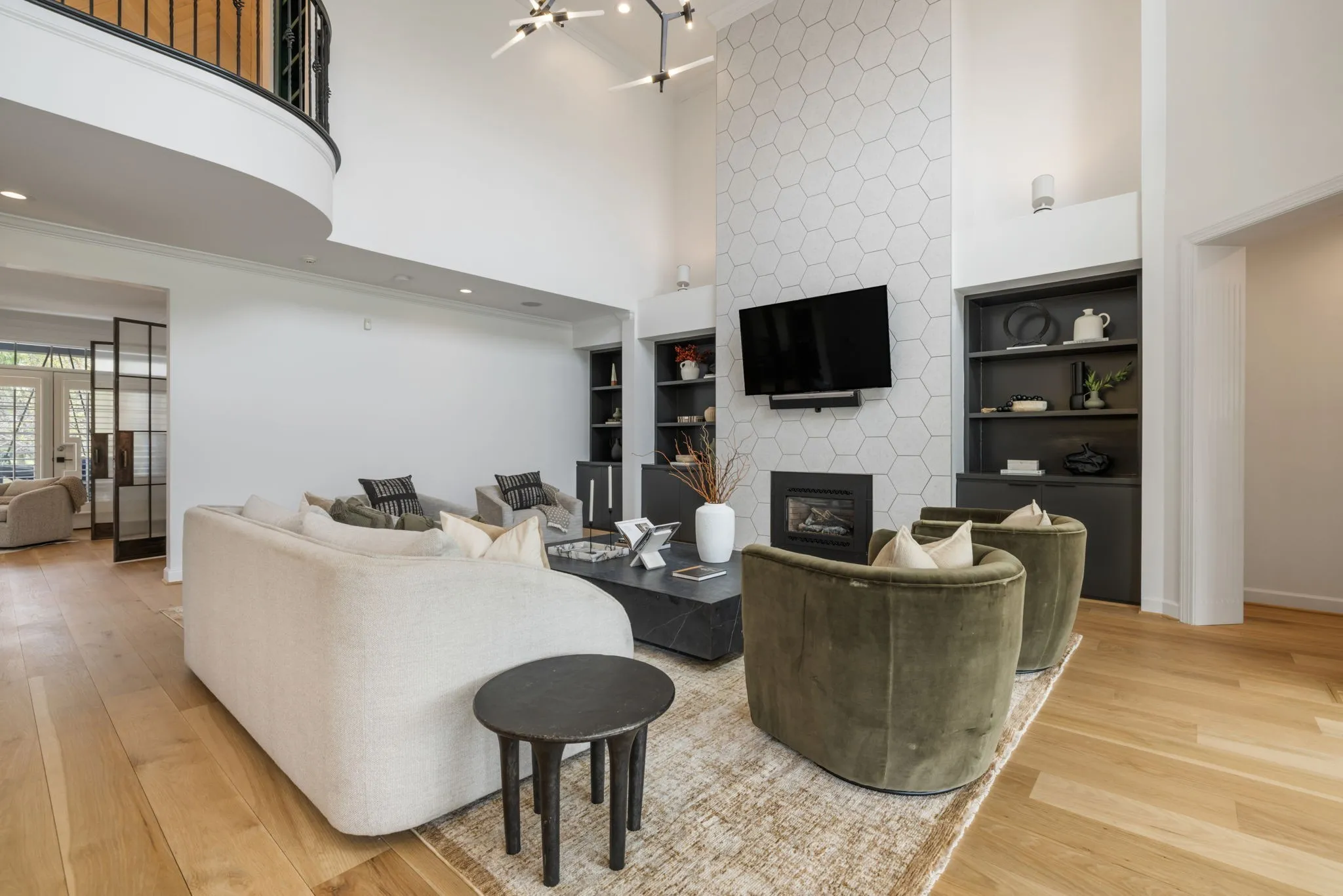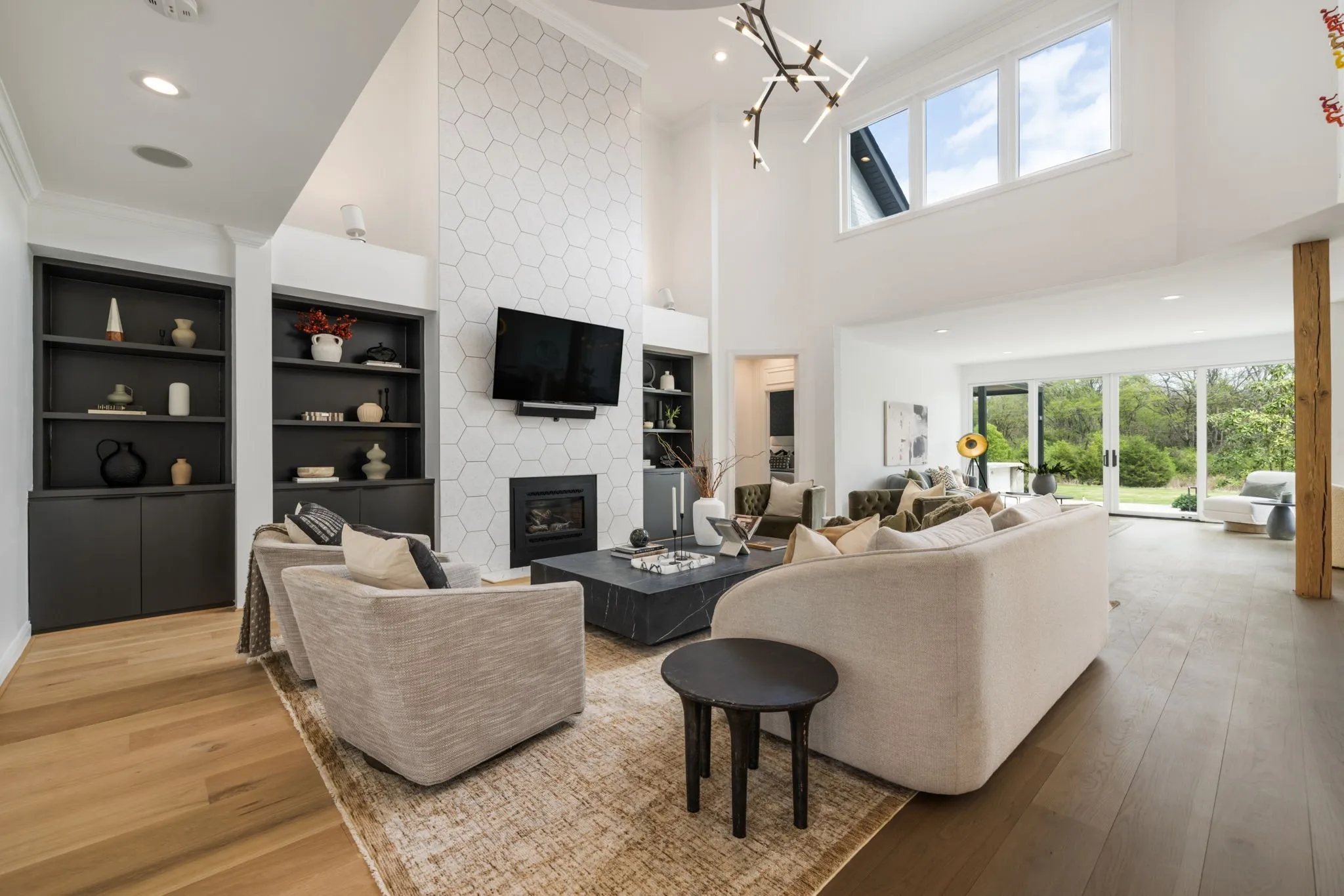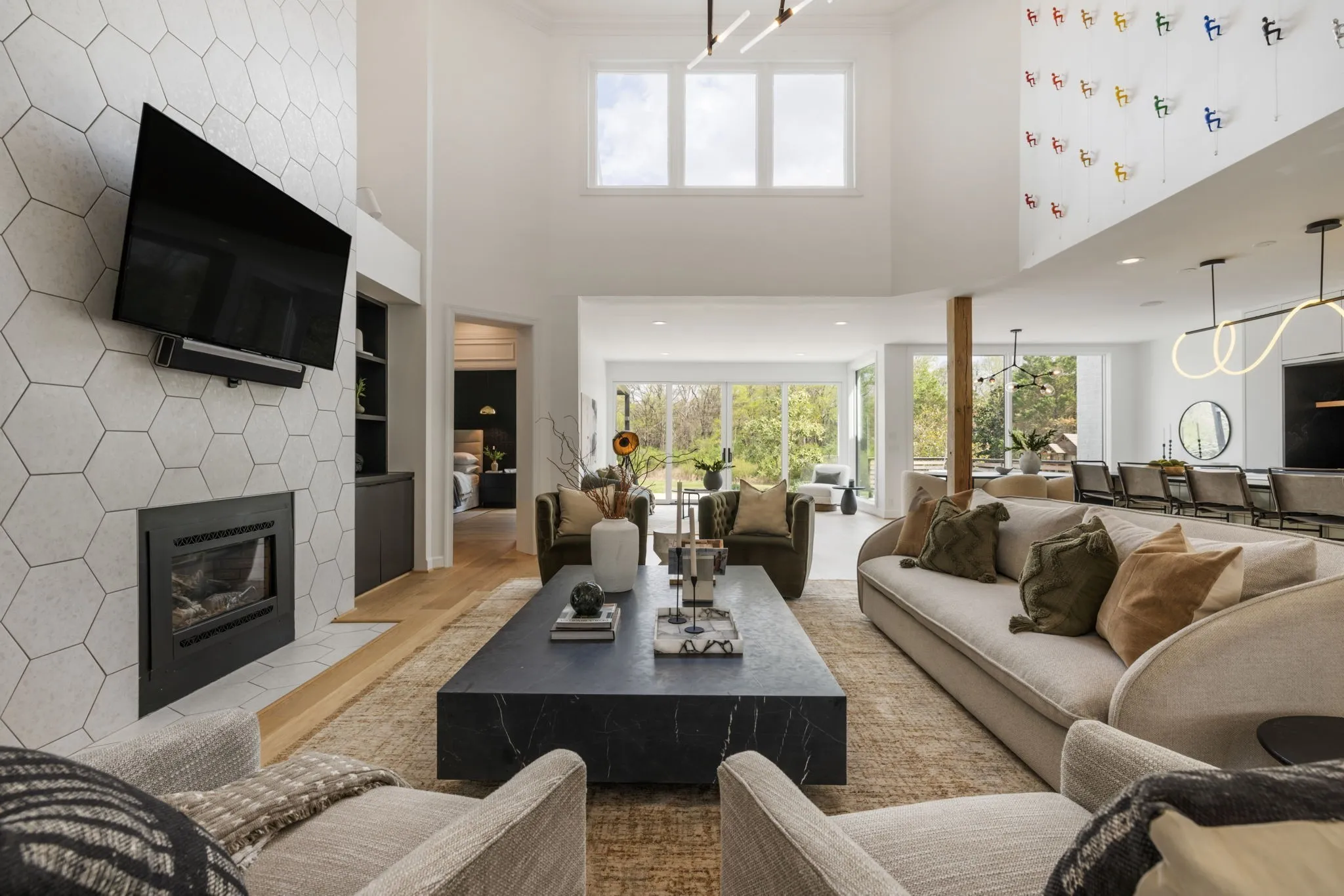 A striking blend of architectural sophistication + livable luxury, this home is a beautifully curated modern residence designed for elevated entertaining + everyday ease. Offering over 5,800sqft, this 5-bed, 7-bath home delivers standout style, thoughtful renovations, + exceptional indoor-outdoor living—tucked into one of Franklin’s most desirable neighborhoods, River Landing.Enter to a dramatic two-story foyer setting the tone w/ clean lines, abundant natural light, + an airy sense of scale. Wide-plank 8” white oak hardwoods run throughout the main level, complemented by designer lighting + a crisp, modern palette that feels both bold + inviting. At the heart of the home, the renovated chef’s kitchen makes an unforgettable statement w/ sleek cabinetry, JennAir appliances, + a grand island. Seamlessly open to the living + dining spaces, it creates a natural flow for hosting.The living room is refined + comfortable, anchored by a gas fireplace w/ an architectural floor-to-ceiling hex tile surround + custom built-ins—an artful focal point elevating the space. Retreat to the expansive primary suite, a true sanctuary featuring its own fireplace + calming, spa-inspired atmosphere. The primary bath continues the luxury experience w/ dramatic design, elevated finishes, + a resort-like feel—complete w/ a soaking tub + walk-in shower wrapped in rich, modern tilework.