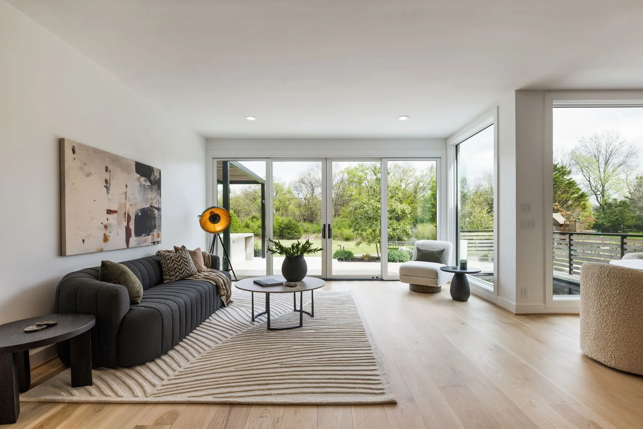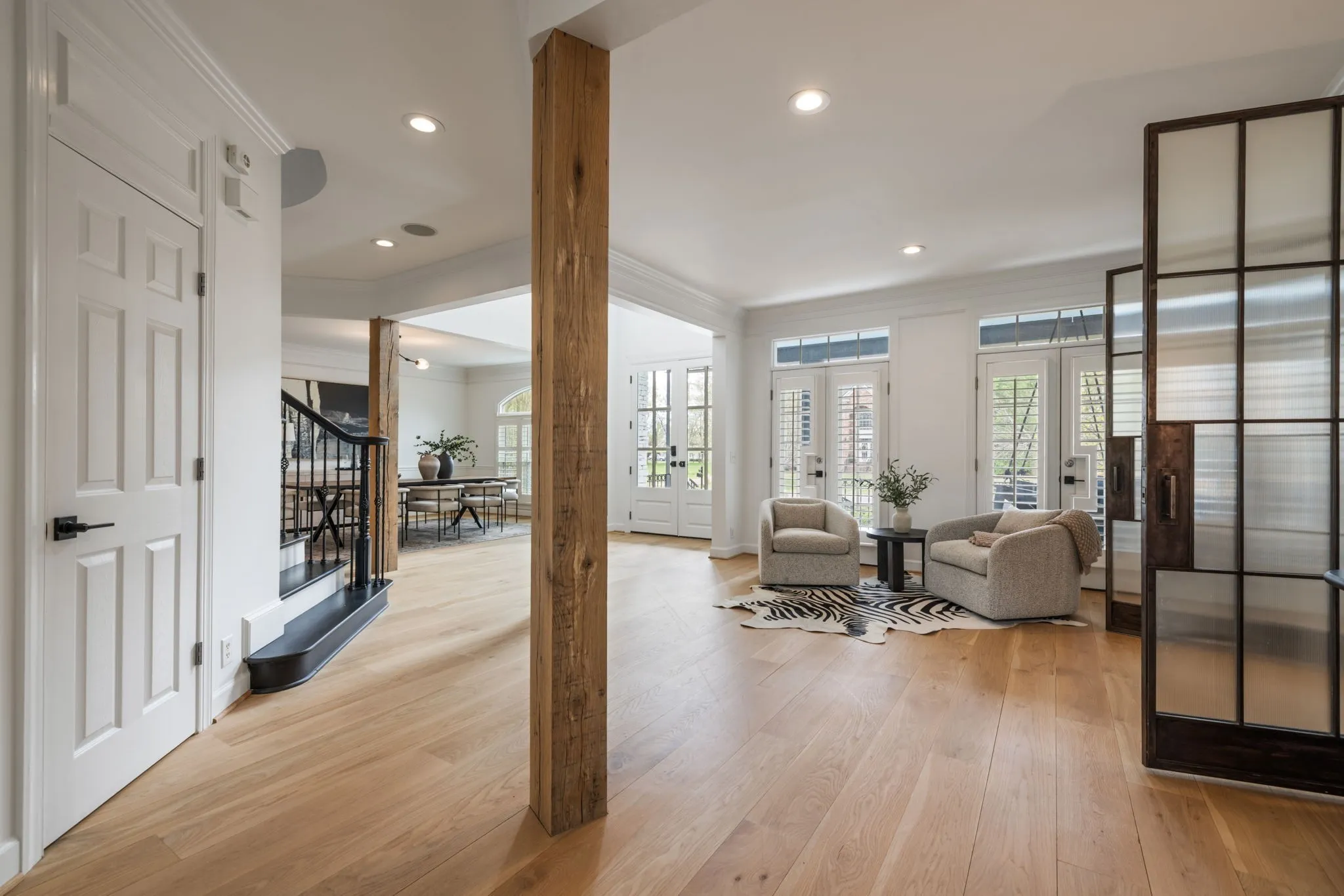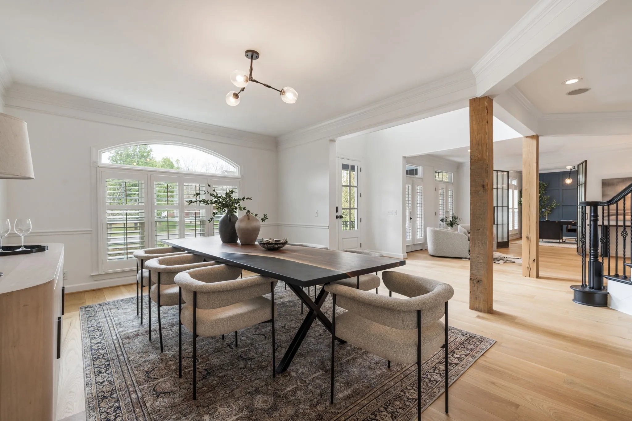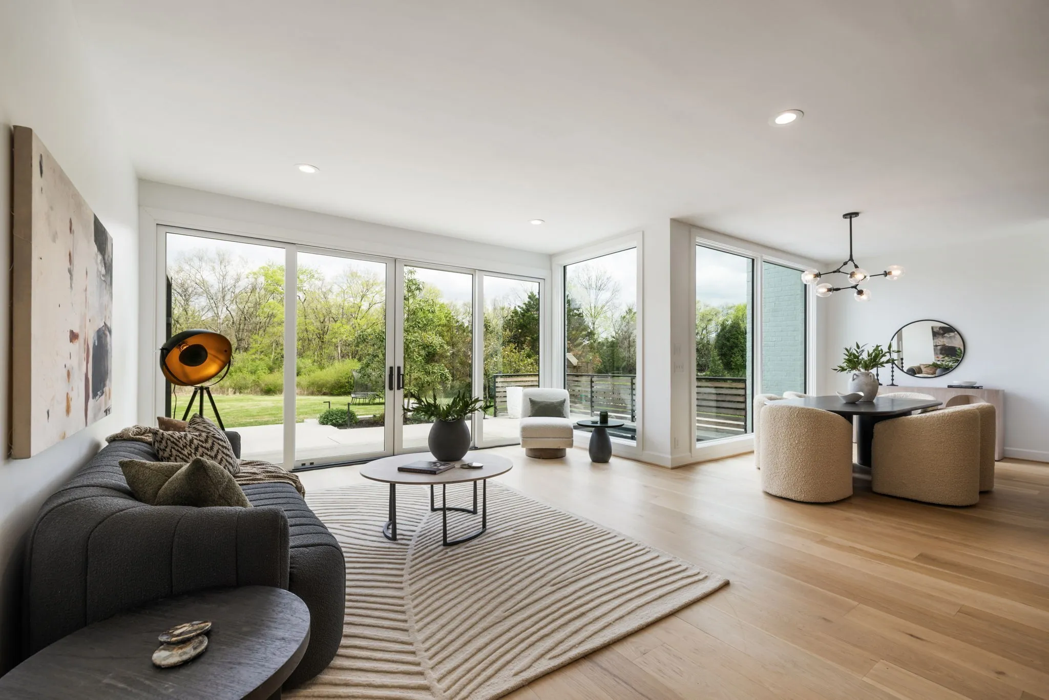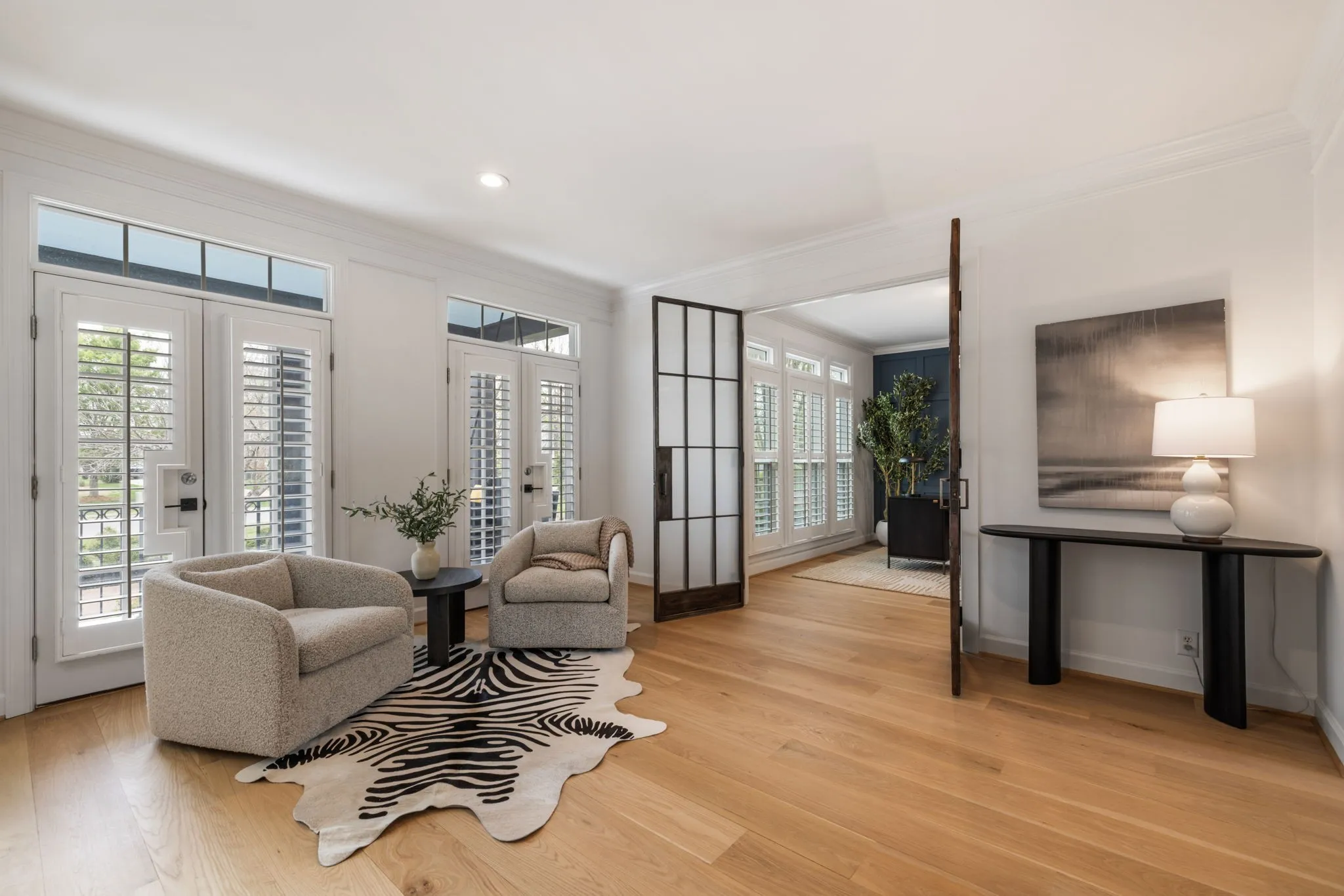 A striking blend of architectural sophistication + livable luxury, this home is a beautifully curated modern residence designed for elevated entertaining + everyday ease. Offering over 5,800sqft, this 5-bed, 7-bath home delivers standout style, thoughtful renovations, + exceptional indoor-outdoor living—tucked into one of Franklin’s most desirable neighborhoods, River Landing.Enter to a dramatic two-story foyer setting the tone w/ clean lines, abundant natural light, + an airy sense of scale. Wide-plank 8” white oak hardwoods run throughout the main level, complemented by designer lighting + a crisp, modern palette that feels both bold + inviting. At the heart of the home, the renovated chef’s kitchen makes an unforgettable statement w/ sleek cabinetry, JennAir appliances, + a grand island. Seamlessly open to the living + dining spaces, it creates a natural flow for hosting.The living room is refined + comfortable, anchored by a gas fireplace w/ an architectural floor-to-ceiling hex tile surround + custom built-ins—an artful focal point elevating the space. Retreat to the expansive primary suite, a true sanctuary featuring its own fireplace + calming, spa-inspired atmosphere. The primary bath continues the luxury experience w/ dramatic design, elevated finishes, + a resort-like feel—complete w/ a soaking tub + walk-in shower wrapped in rich, modern tilework.