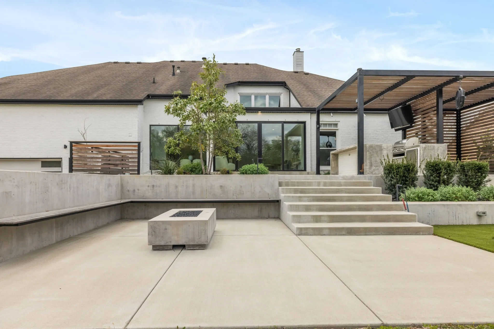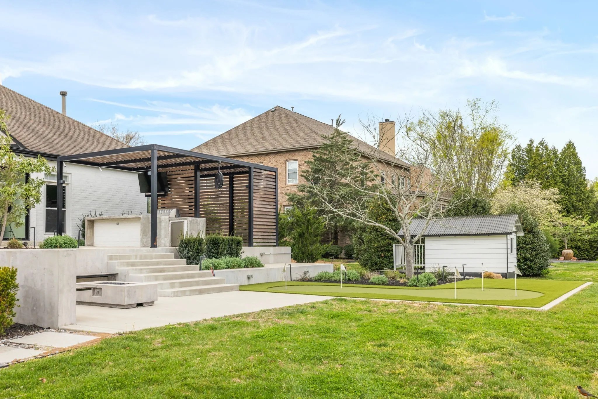 Step outside to your private backyard oasis designed to impress featuring a pool, expansive patio space, an outdoor kitchen, gas fireplace, + a custom putting green, all surrounded by mature landscaping that creates a sense of privacy + retreat.