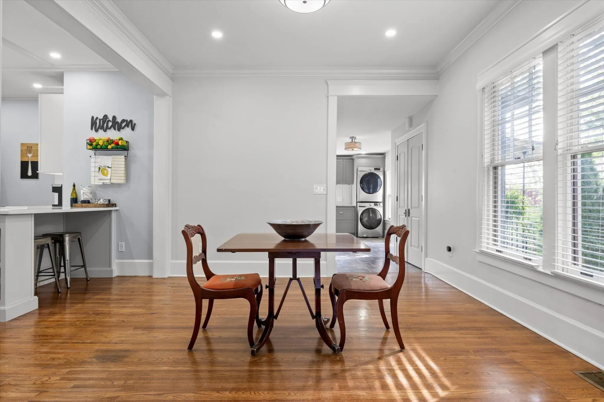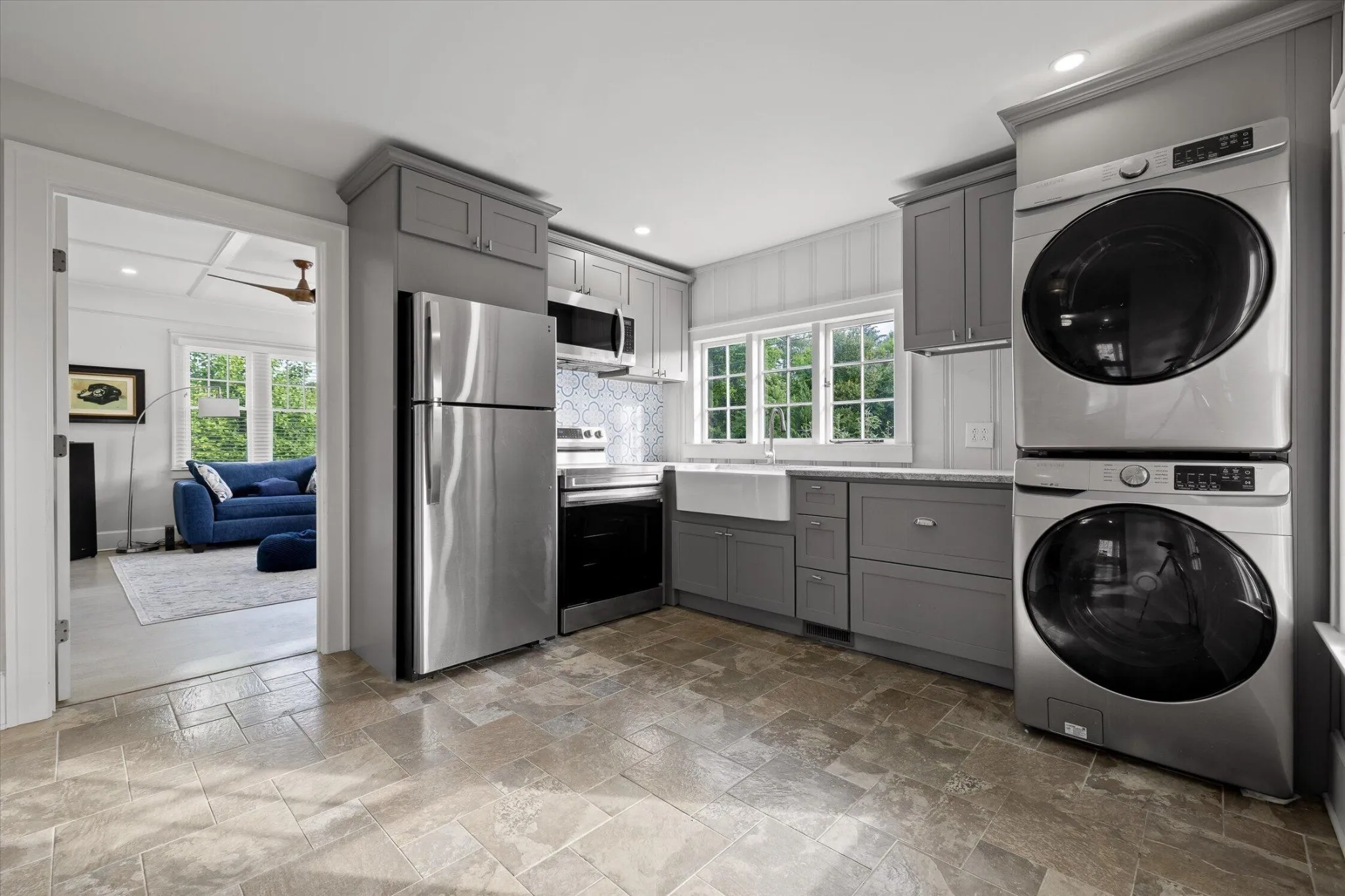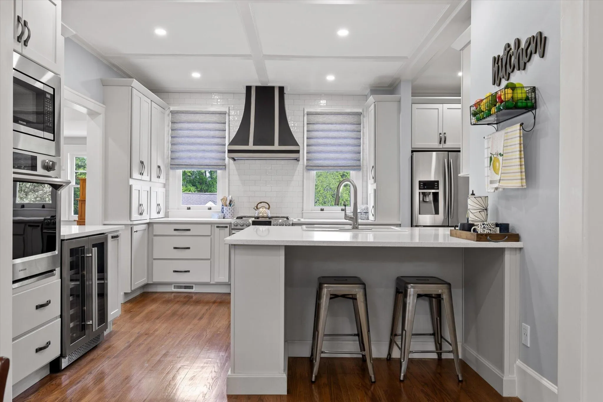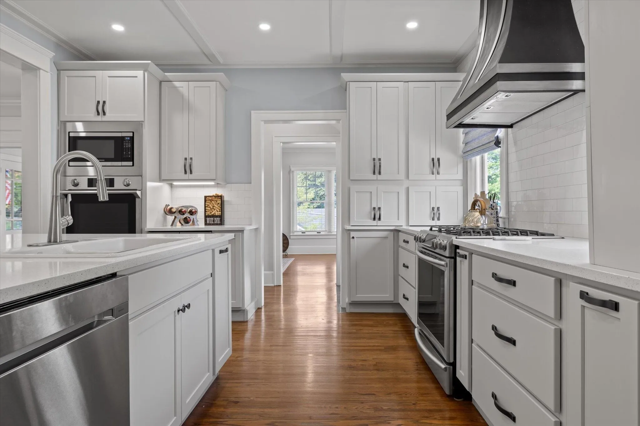 The main level offers a formal living room with a direct-vent gas log fireplace, pantry, and a kitchen that is spacious, bright, and designed with function in mind–featuring a second wall oven and microwave, wine and beverage center, deep counters, custom metal range hood, light cabinetry, quartz countertops, and a crackle-glaze tile backsplash. The breakfast bar seats two, anchored by a classic porcelain cast-iron sink.