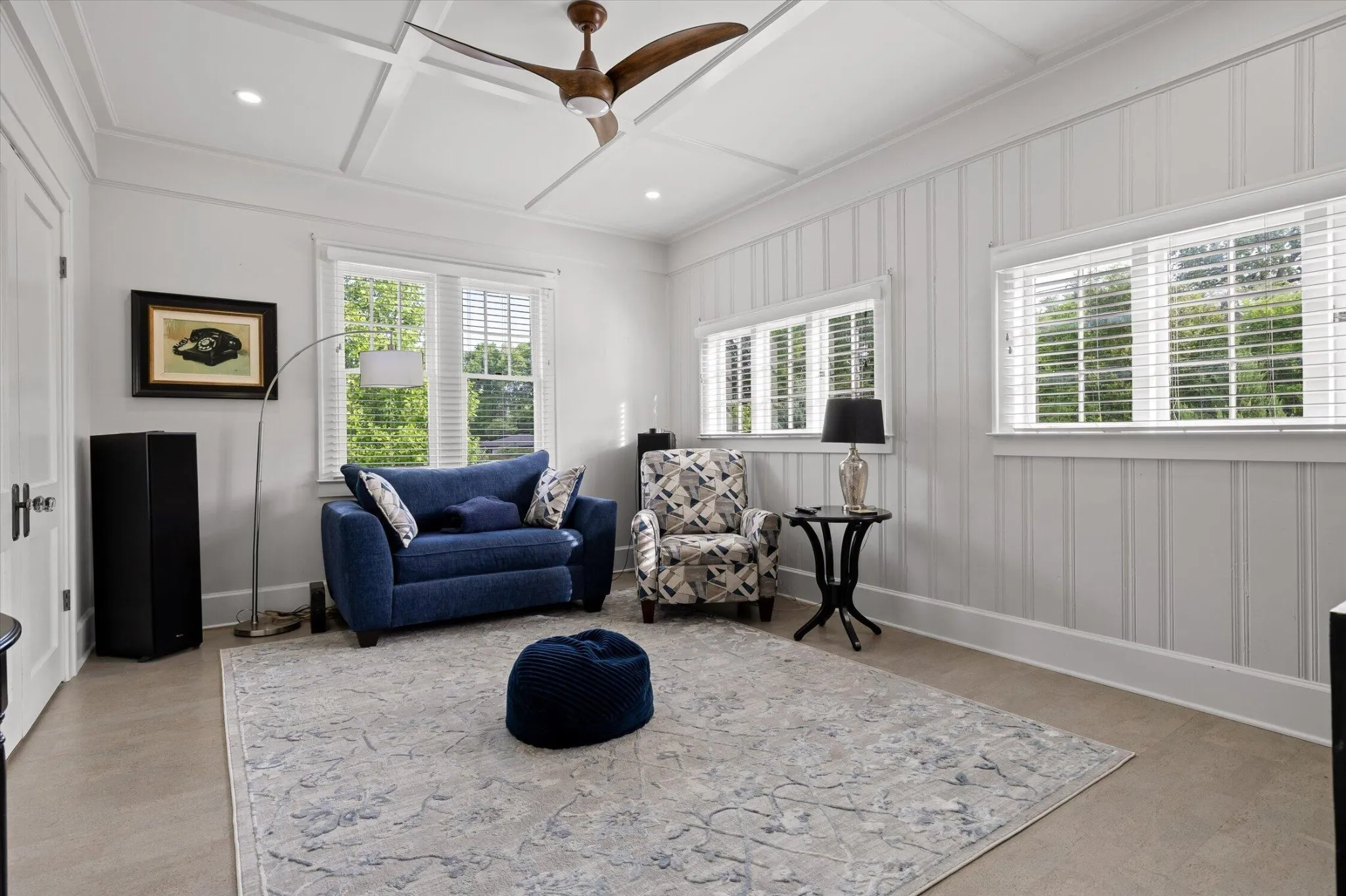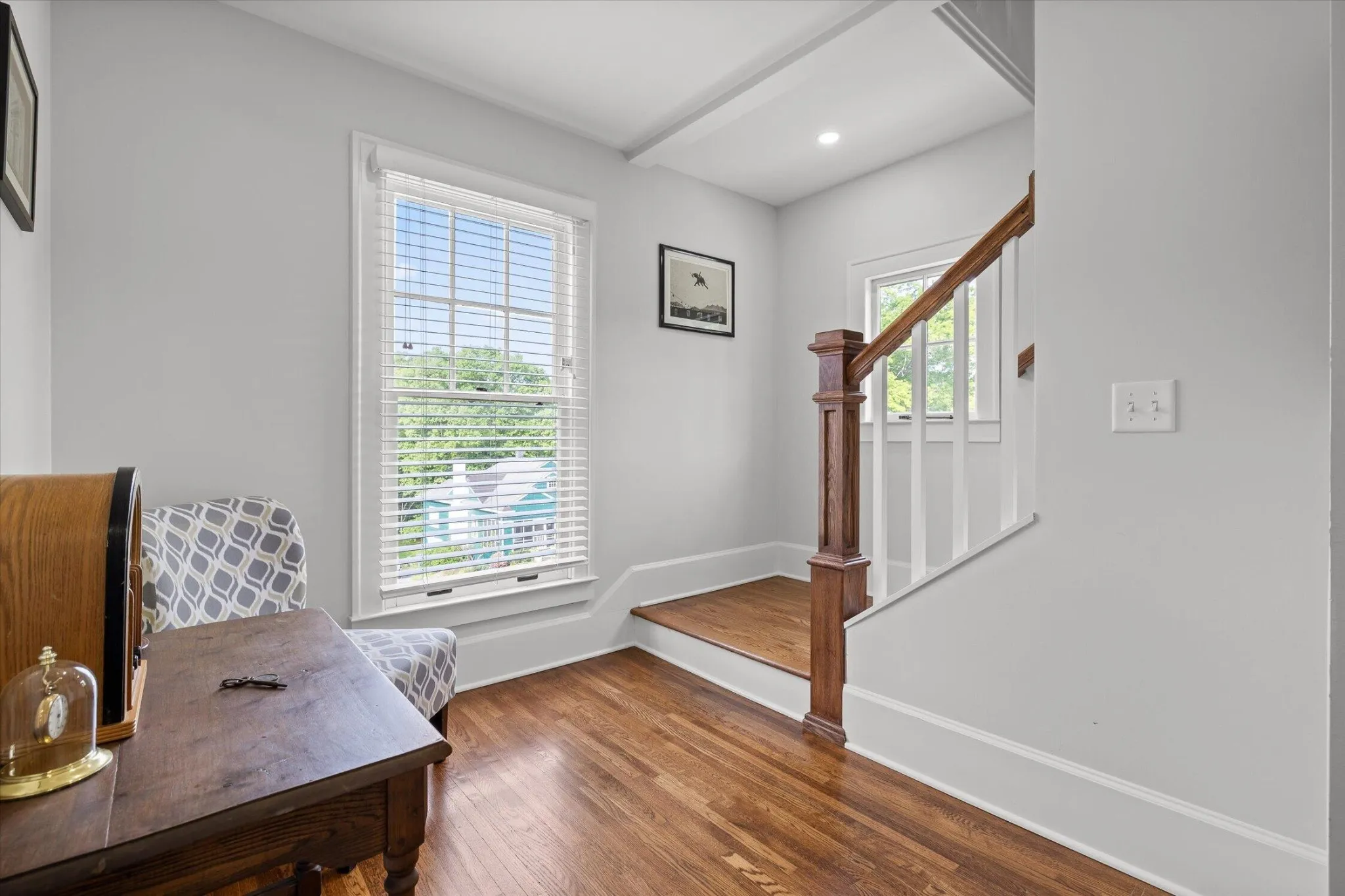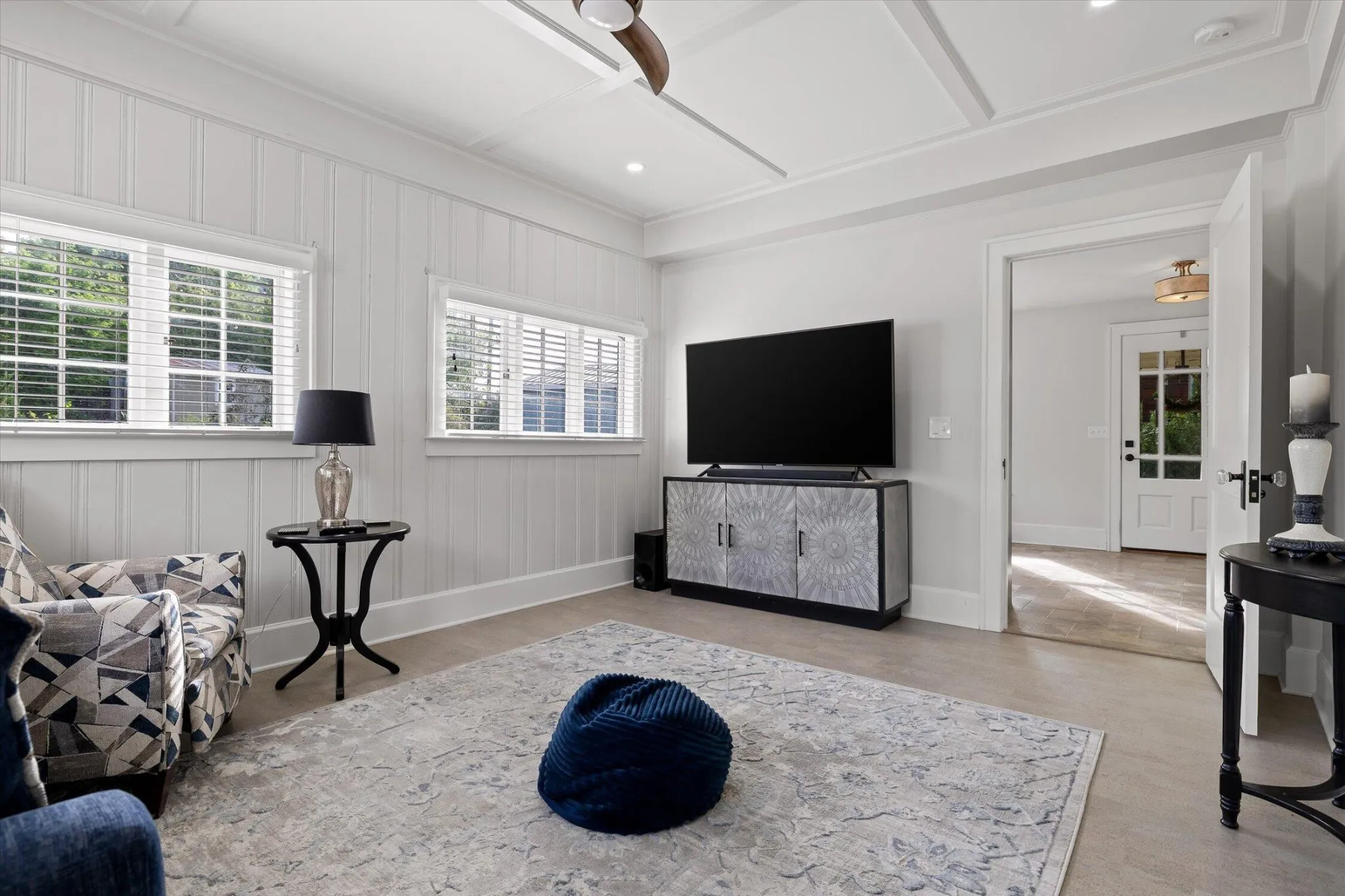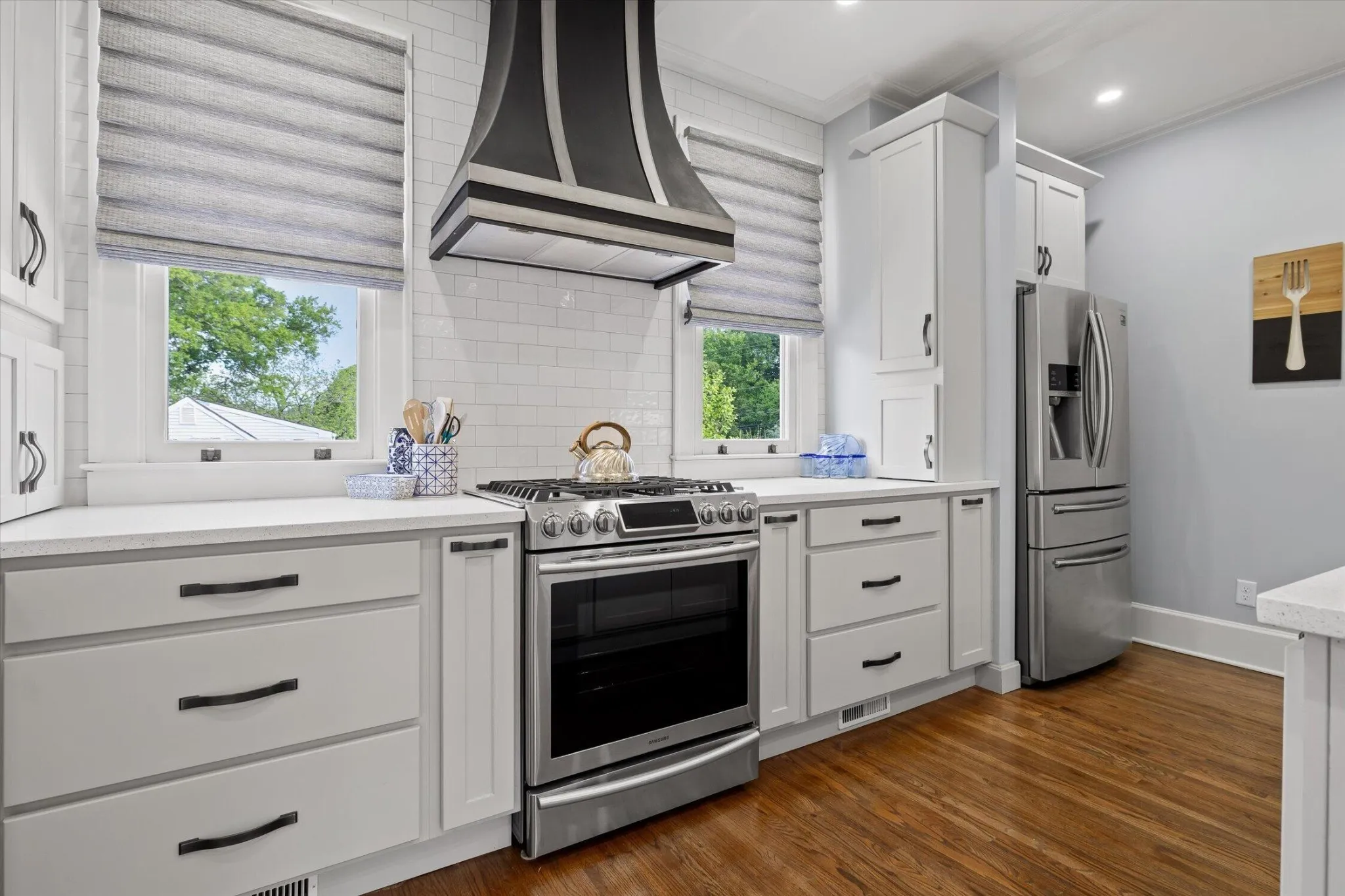 The main level offers a formal living room with a direct-vent gas log fireplace, pantry, and a kitchen that is spacious, bright, and designed with function in mind–featuring a second wall oven and microwave, wine and beverage center, deep counters, custom metal range hood, light cabinetry, quartz countertops, and a crackle-glaze tile backsplash. The breakfast bar seats two, anchored by a classic porcelain cast-iron sink.