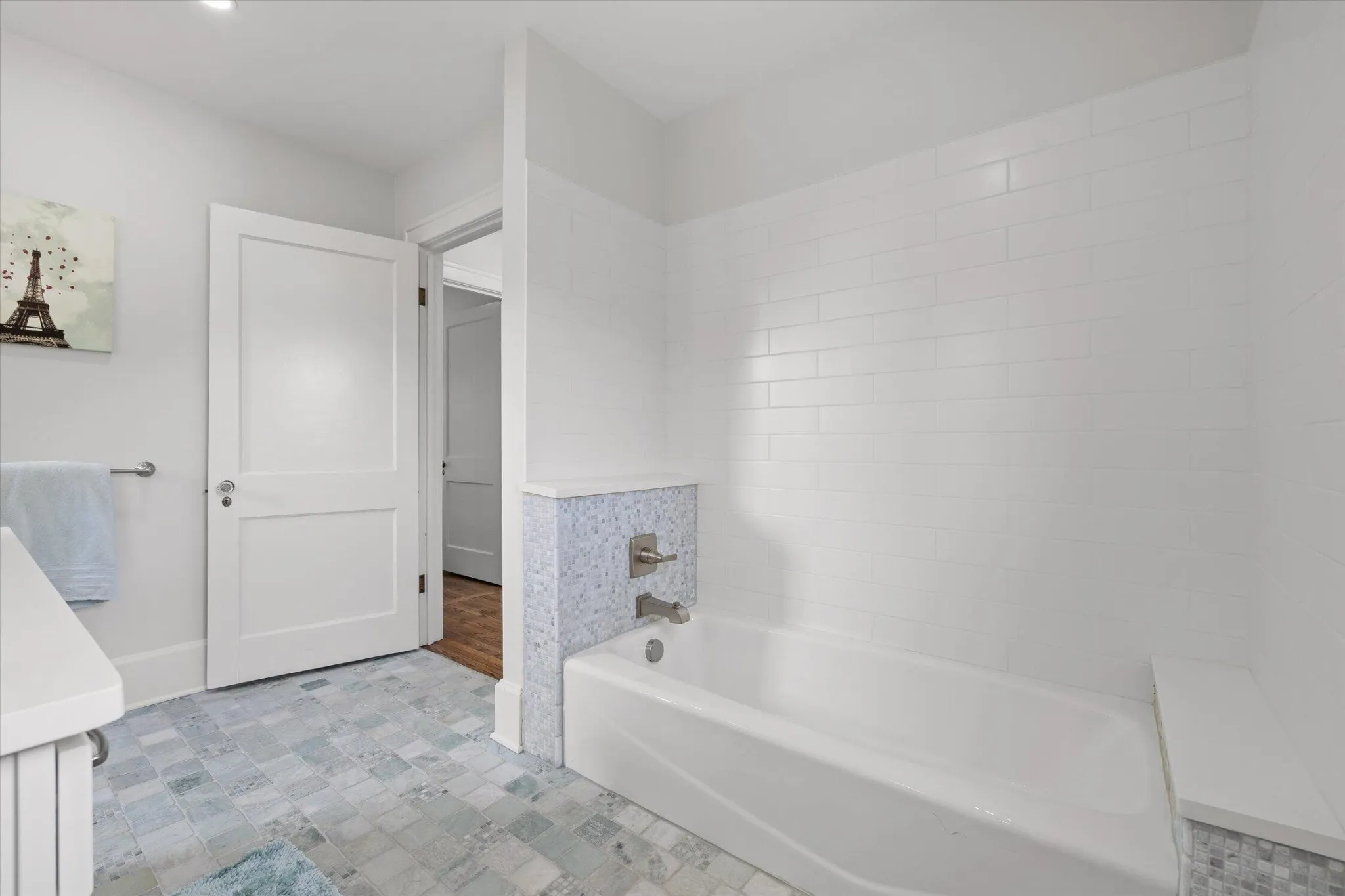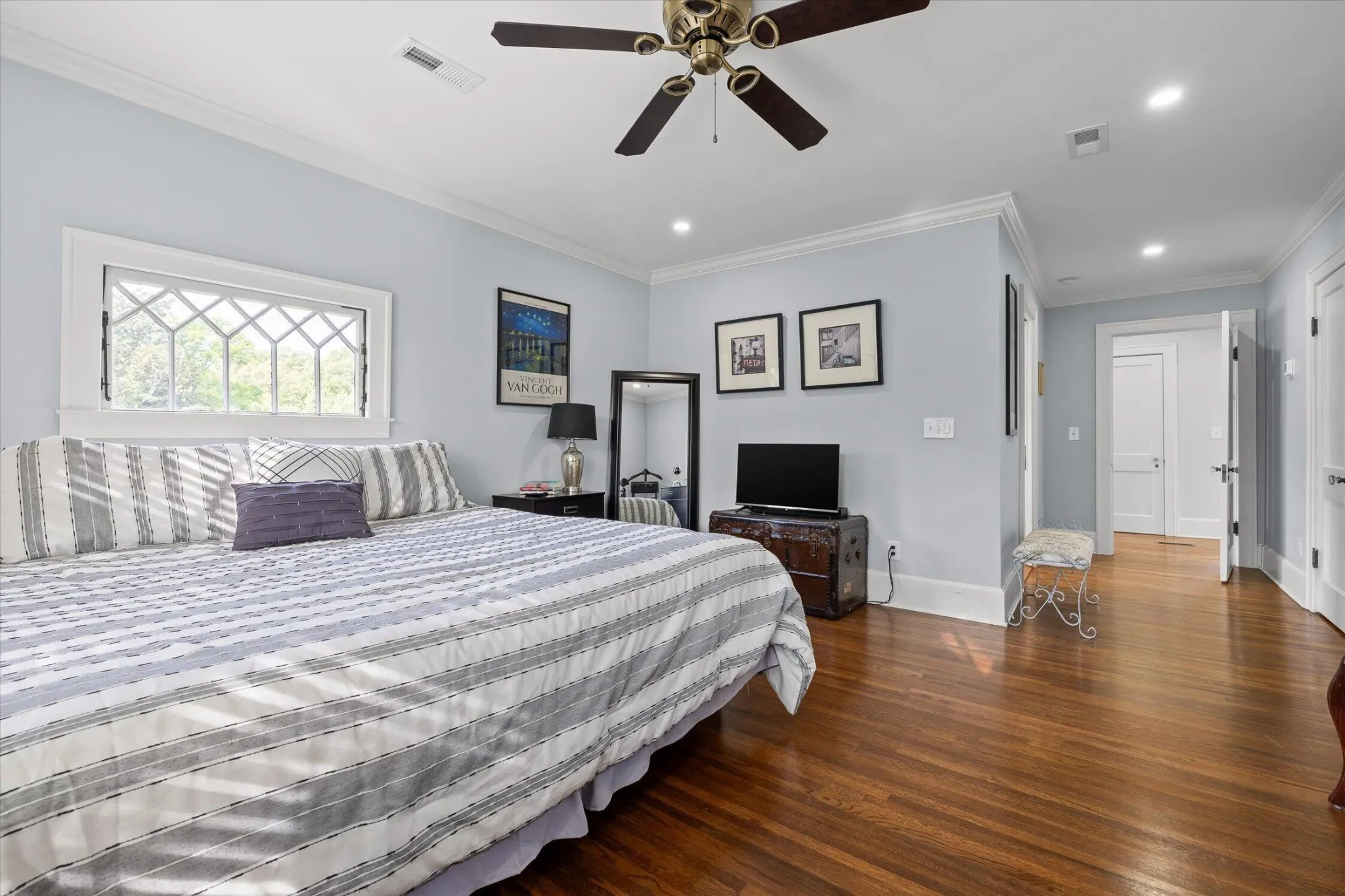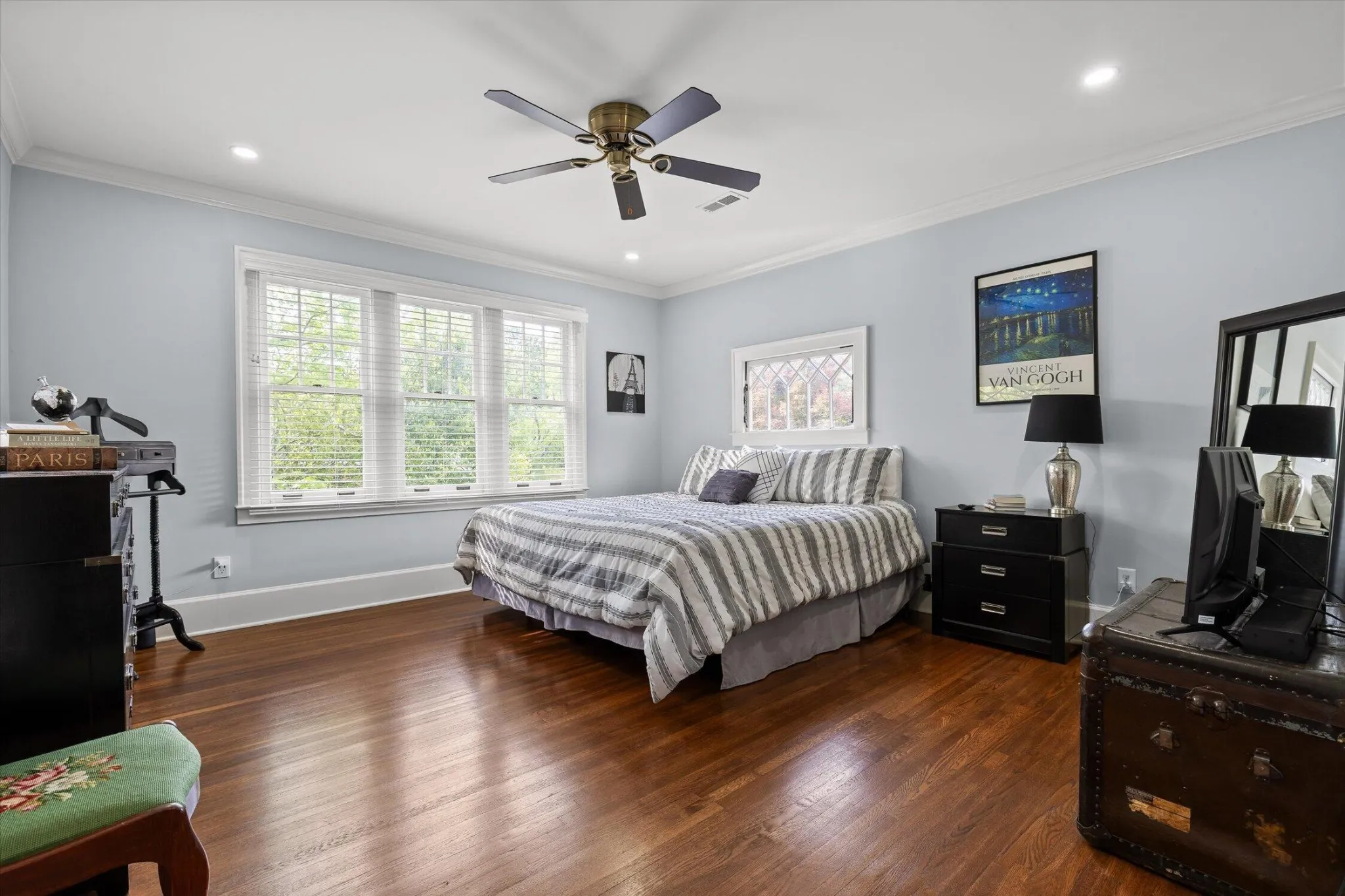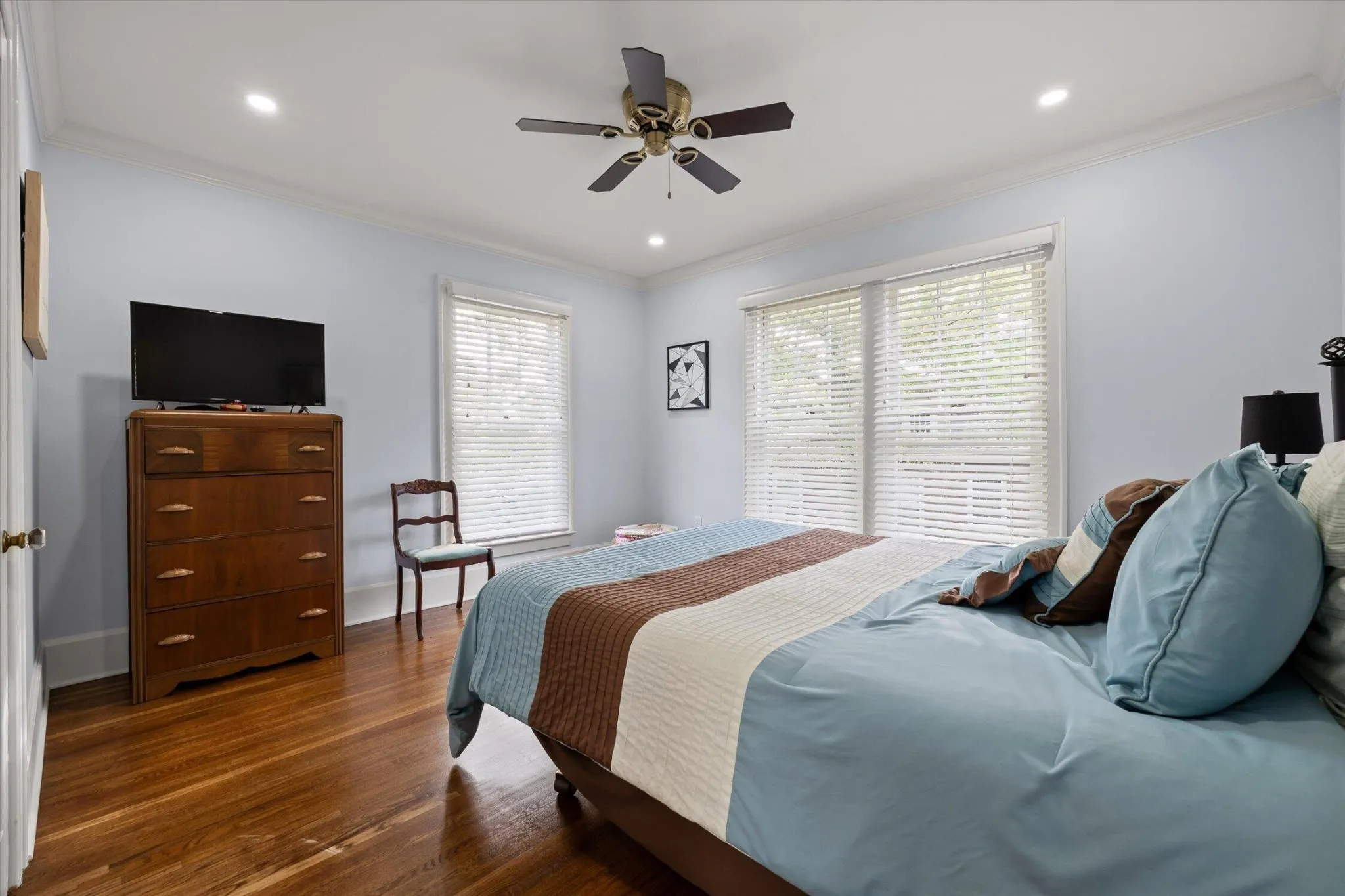 The main level offers a formal living room with a direct-vent gas log fireplace, pantry, and a kitchen that is spacious, bright, and designed with function in mind–featuring a second wall oven and microwave, wine and beverage center, deep counters, custom metal range hood, light cabinetry, quartz countertops, and a crackle-glaze tile backsplash. The breakfast bar seats two, anchored by a classic porcelain cast-iron sink.