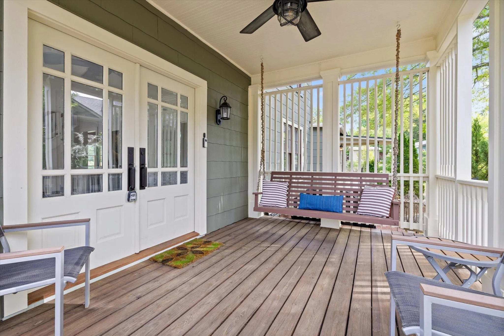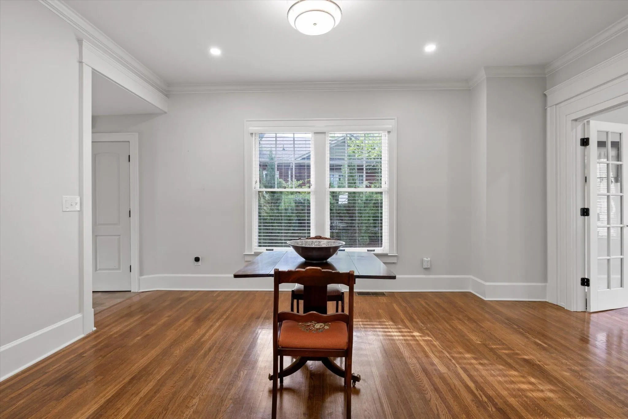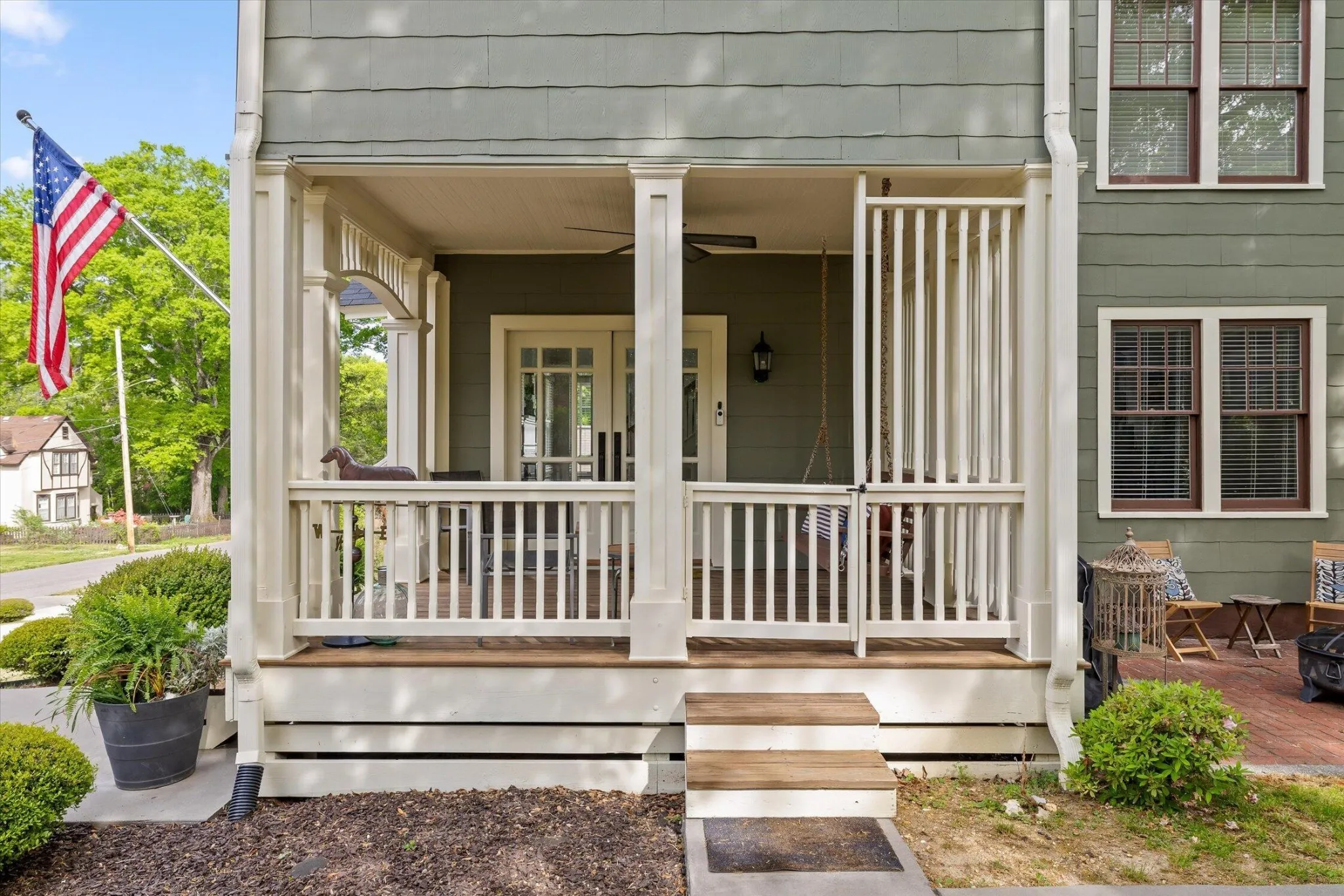 From the street, the home has a presence you can feel. The architecture pairs perfectly with a professionally designed outdoor space featuring outdoor dining areas and a brick courtyard that gives the property an almost storybook feel. Step inside and you’ll immediately notice the tall ceilings and custom-milled oak flooring that runs throughout.