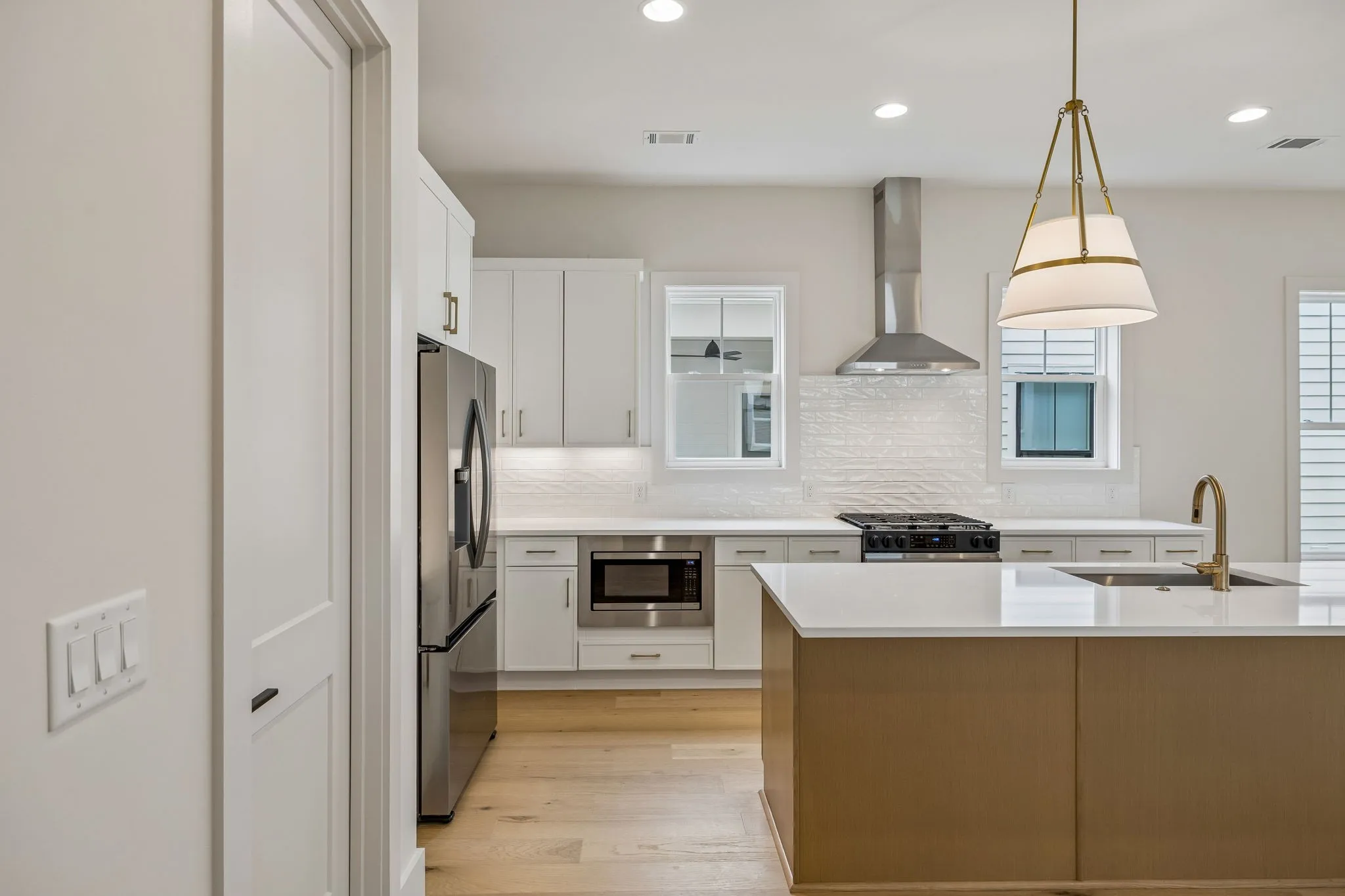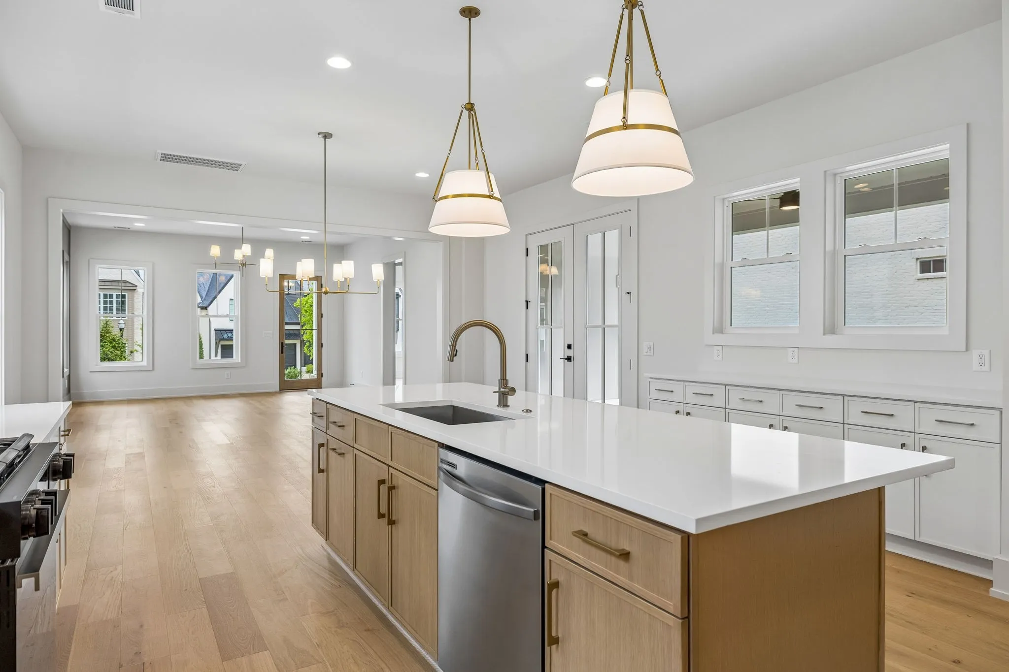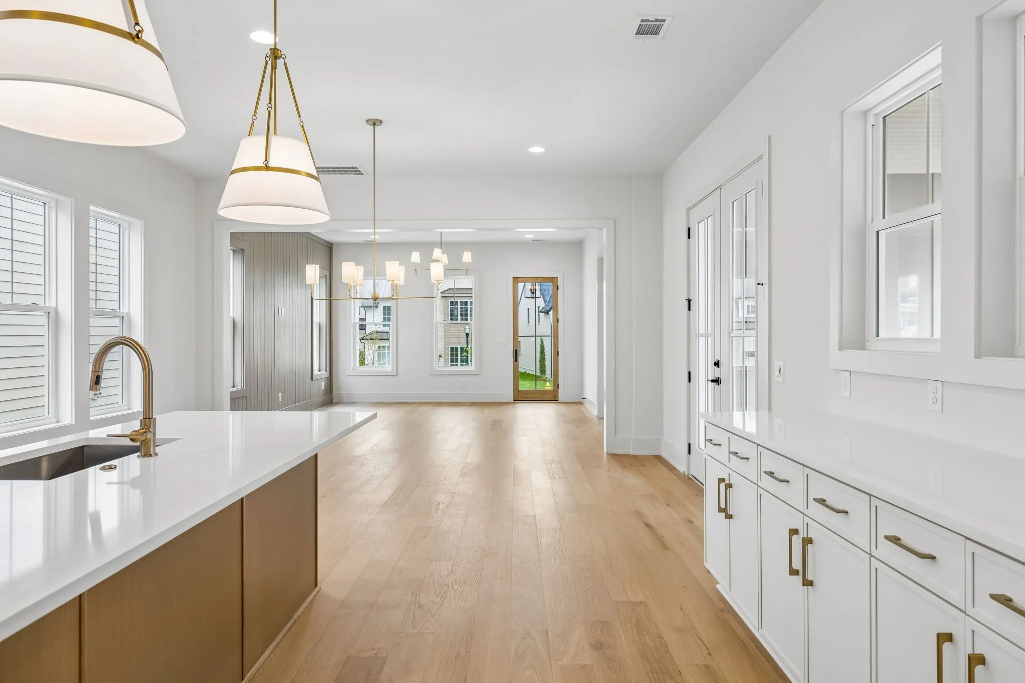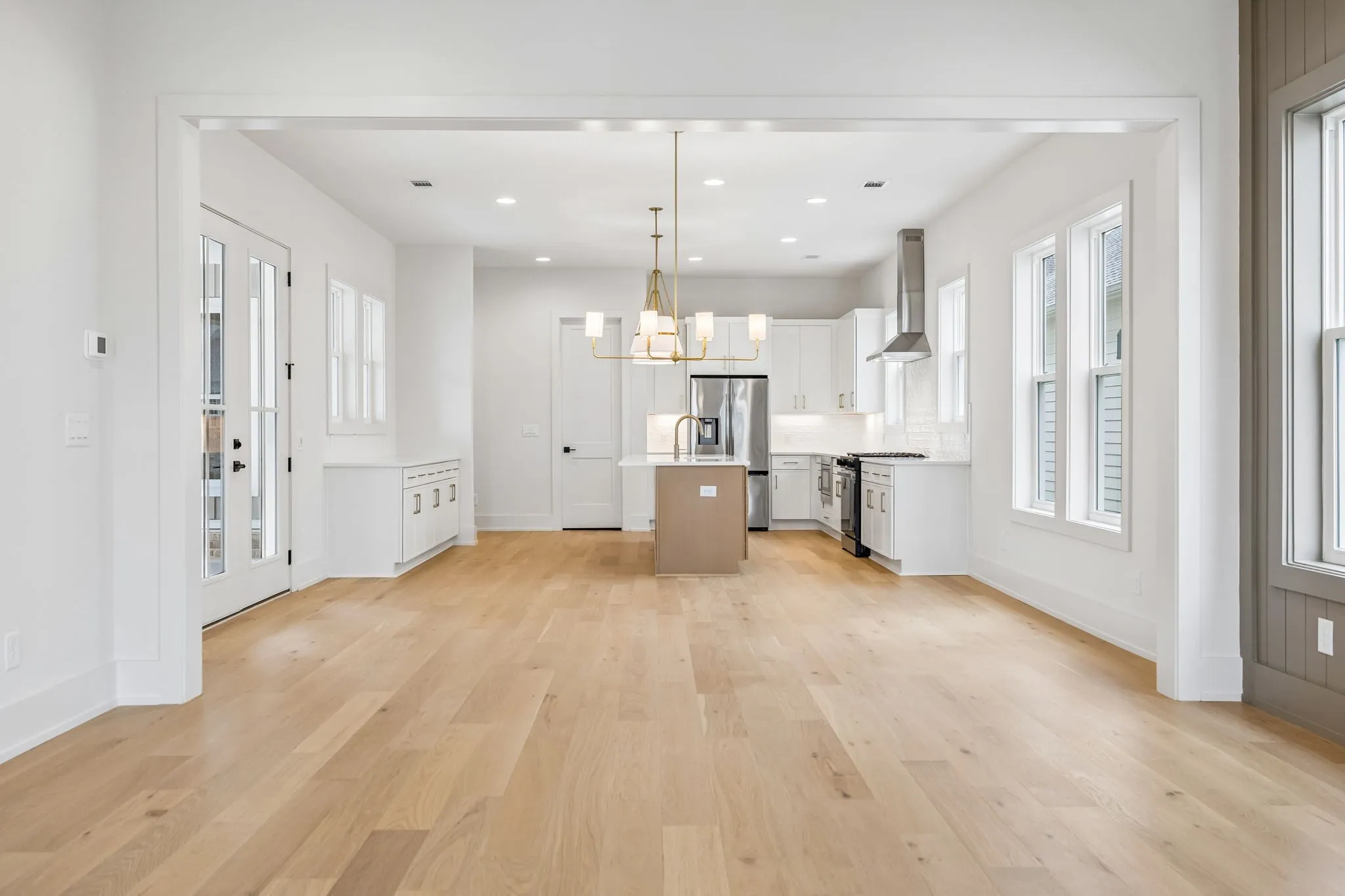 The main living areas are open yet intentional, creating a natural flow between the kitchen, dining, and living spaces while maintaining a sense of structure and design. The kitchen is both elevated and highly functional, featuring high-end appliances, elevated finishes, abundant cabinetry, and a walk-in pantry—supporting both everyday living and effortless entertaining.