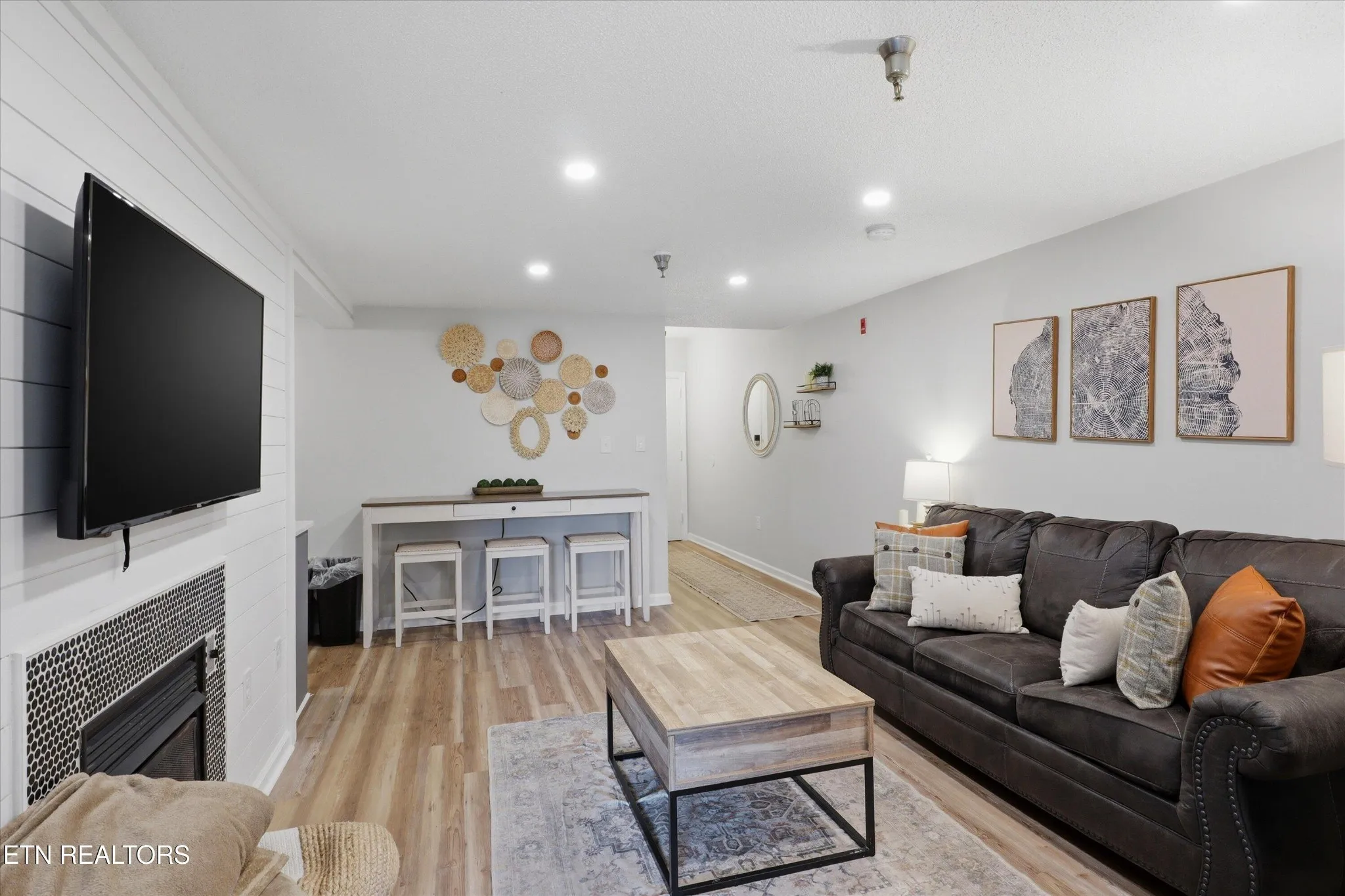 The interior is thoughtfully updated with light wood-look LVP flooring throughout, providing a sleek, durable surface that’s ideal for high guest turnover. The living room serves as a cozy mountain retreat featuring a gas fireplace, while the kitchen is sure to impress with stainless steel appliances and chic open shelving.
