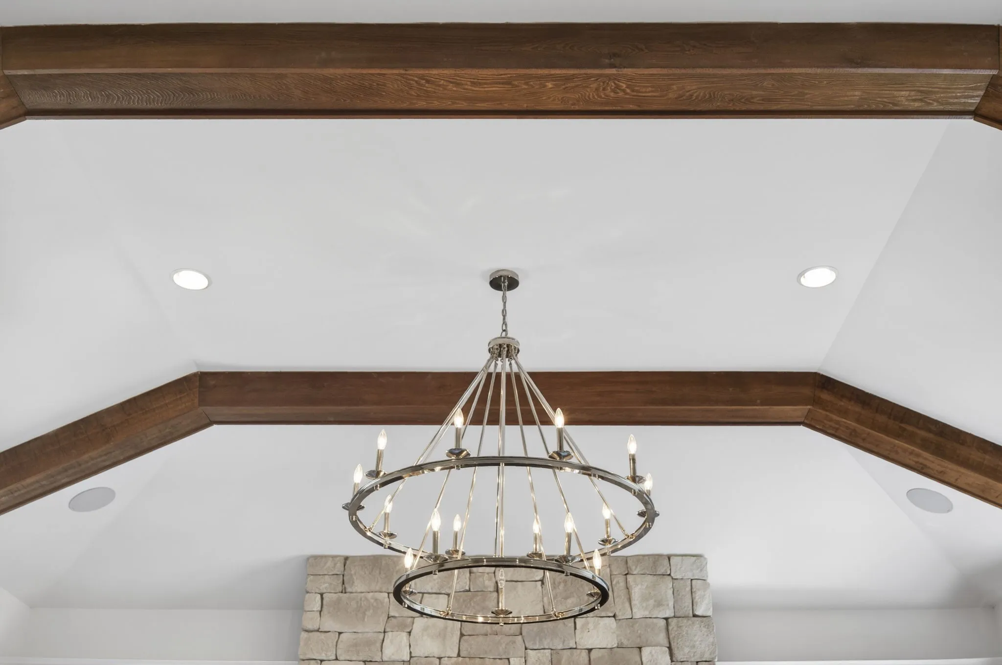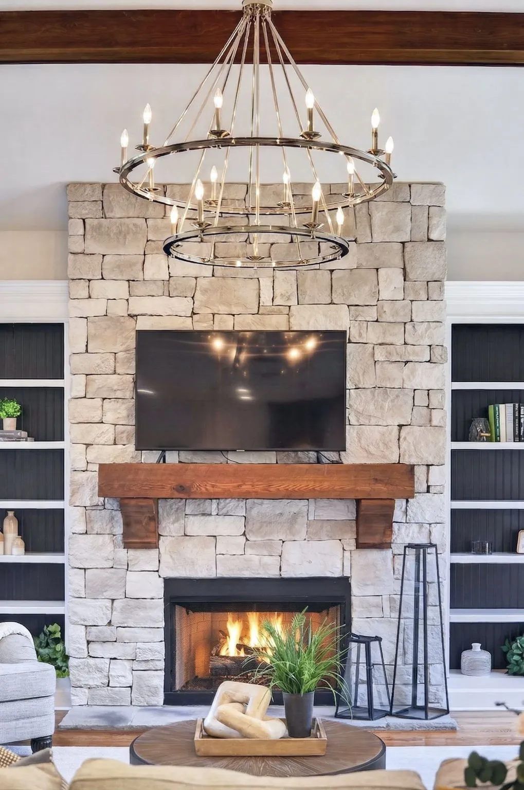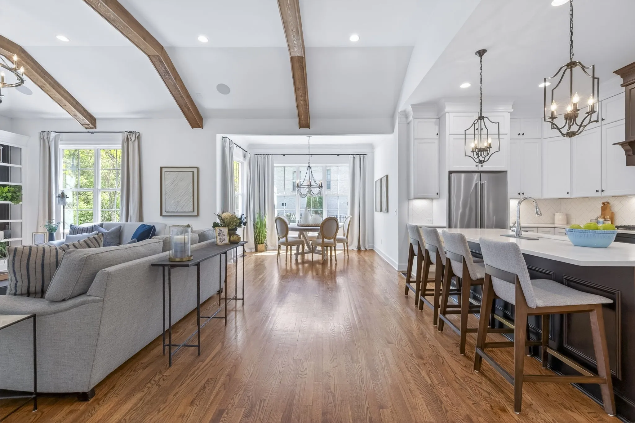 Inside, soaring ceilings w/rich wooden beams anchor the light-filled great room which features built ins & stacked stone fireplace, just steps from the chef’s kitchen, both beautiful & functional…featuring luxury appliances, generous prep space, huge entertaining island, double ovens, gas cooktop & coffee/butler bar that connects to the stunning formal dining room.