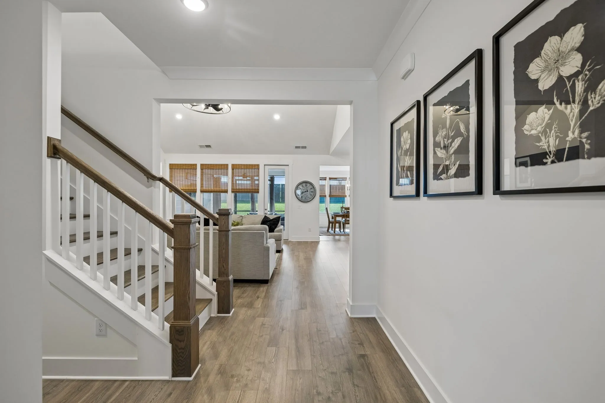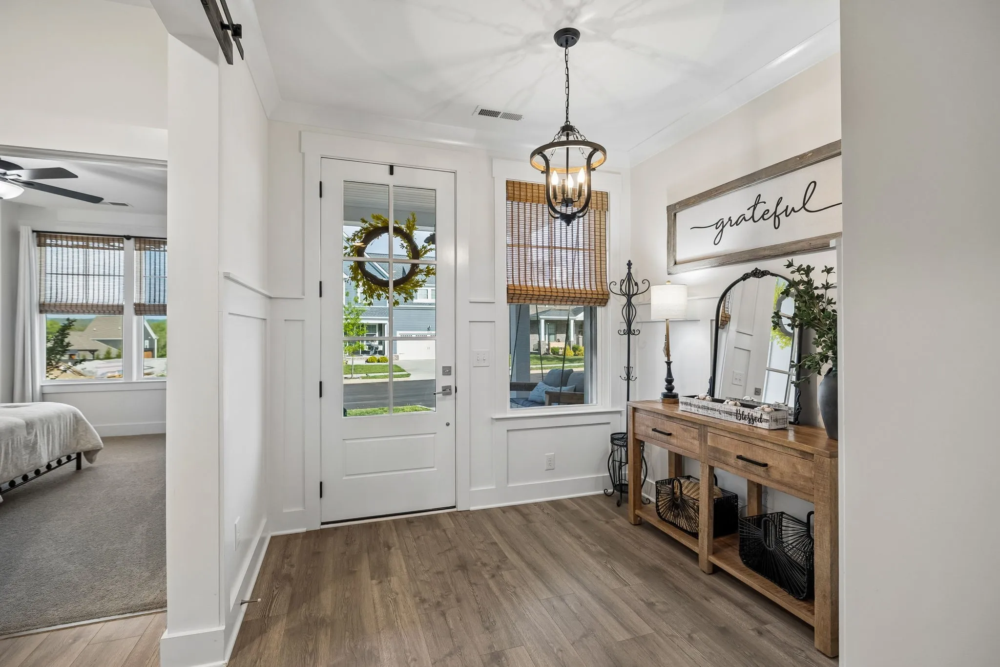 Main Street USA! Sidewalks line both sides of the street. The best of Amenities: Pool, Clubhouse, Dog Park, Walking Trails, Community Garden, Green Space with Events like Arts and Craft Festivals, Food Trucks once or twice a week, etc. Shops, Salons and other Businesses inside of the Community.This Charming Home stands out with it’s large Covered Front Porch made for sitting and chatting with your neighbors as they walk by. The front door opens to a spacious welcoming Foyer. 2 sizable Secondary Bedrooms are located off the hallway and between them is a well appointed Bathroom with a Shower and a Tub. Continuing down the Hallway you will find yourself in the generous Great Room. The Living Room is anchored by a cozy gas Fireplace. The Chef’s Kitchen is at the heart of the space with an abundance of cabinetry, oversized Island, Double Oven, and a walk in Pantry. The Dining Room is a perfect gathering space for large Holiday dinners or intimate weekday meals. A door nestled amongst wall to wall windows takes you to the Screened in Patio with a very private fenced back yard where you can relax and watch the game or read a book in peace as nothing will ever be built behind you. The Primary Suite features a spa like Bathroom with separate Vanities, a walk in glass Shower, standalone Tub and Water Closet, There are 2 walk in Closets off the Bathroom with the largest one connecting to the Laundry room that boasts Custom Cabinetry for additional storage. Upstairs is a flex space that could be used as an additional Bedroom or Bonus Room with a Half Bath. Don’t miss the built in Drop Zone as you walk in from the roomy 2 car Garage. This home is better than new with all of the upgrades including all windows tinted for privacy and energy efficiency, Professionally installed Govee lights that can change colors, Cordless Blinds, Custom California Closets and Laundry Room, Privacy Fence, Screened In Porch, Storage Shelves in the Garage, and Owners had the Driveway widened.