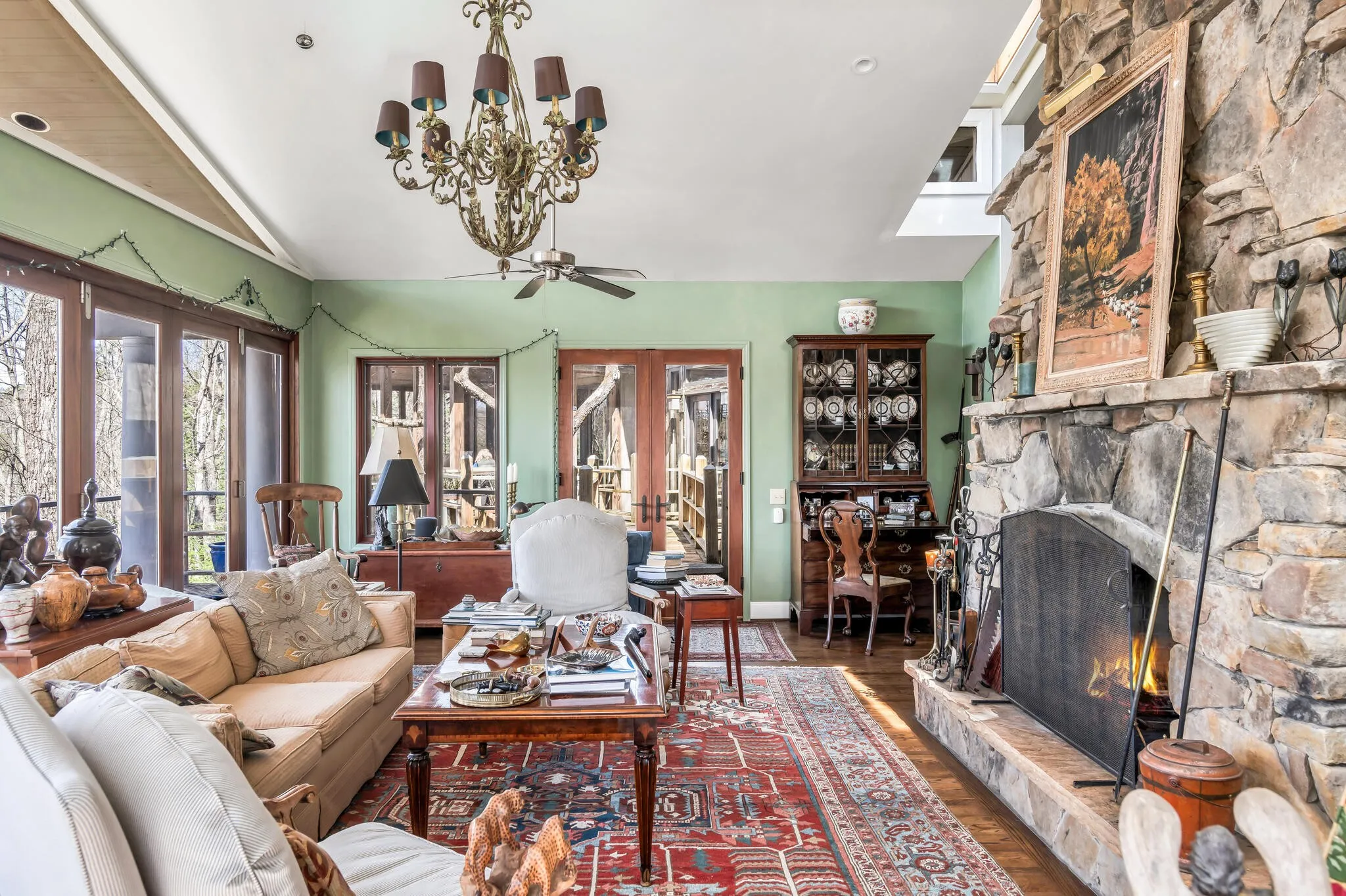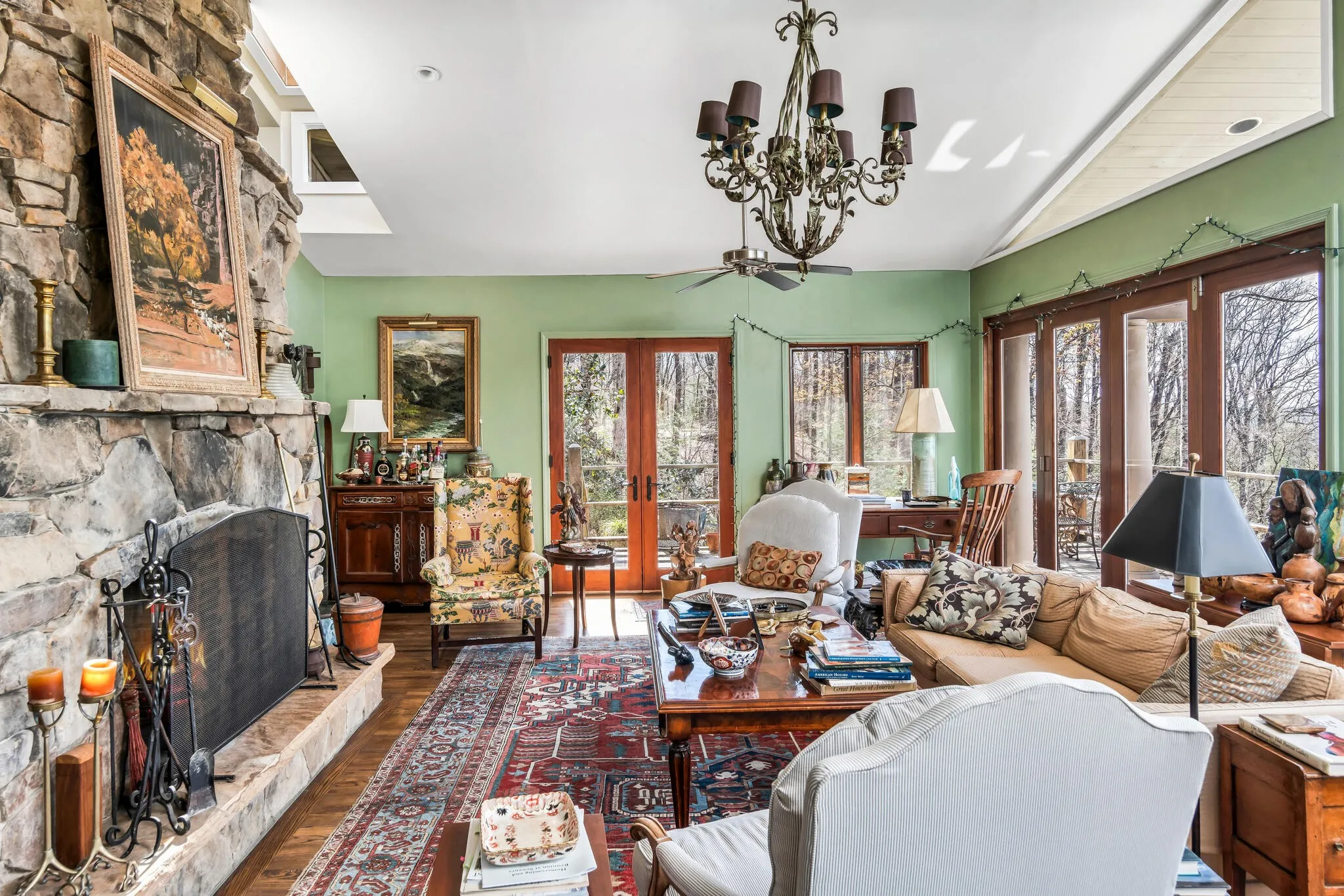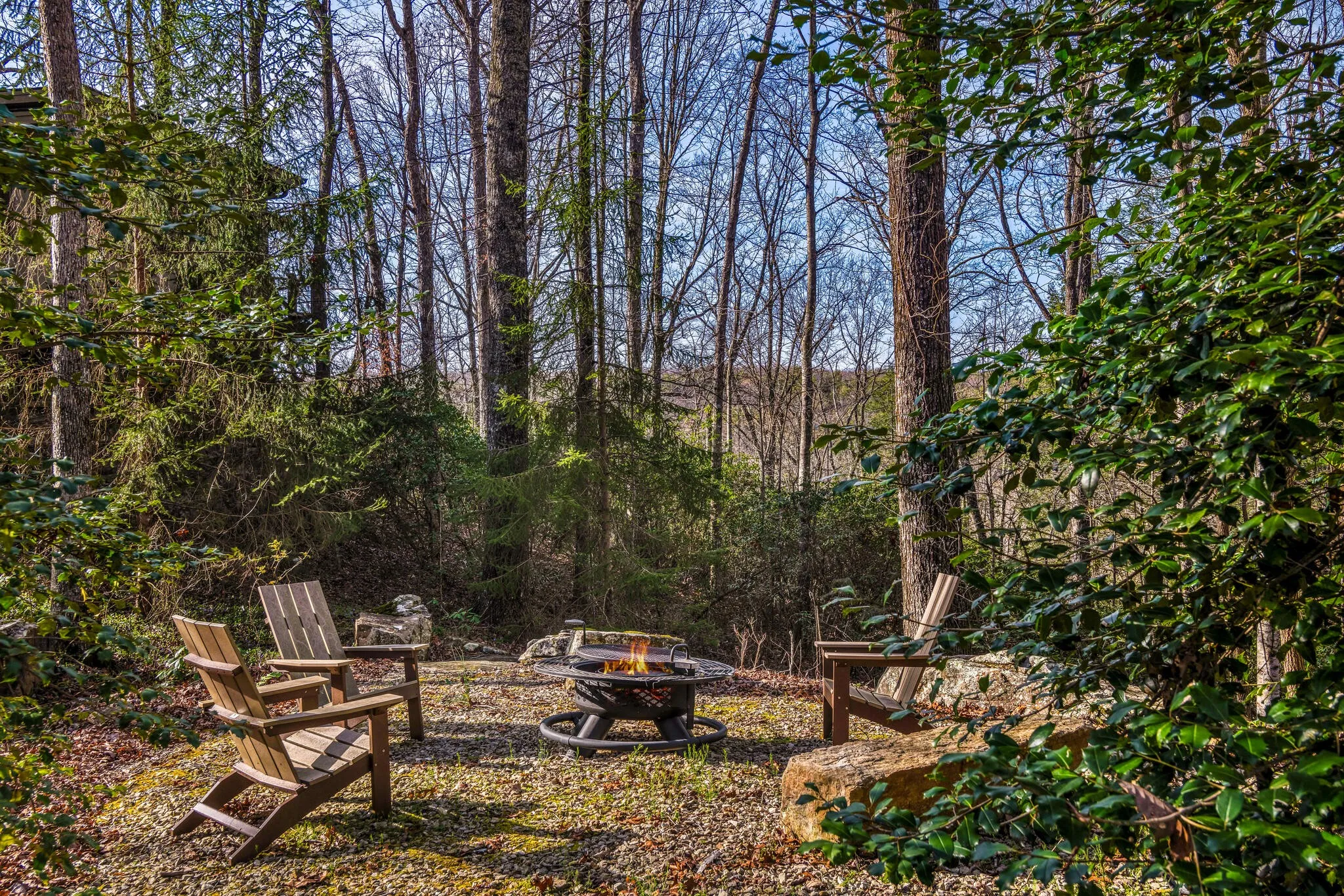 Discover this rare 7-acre secluded property on Monteagle Mountain! Purchased in 2001 by the current owner, a small home was lovingly expanded and renovated into an extraordinary family retreat. Lovely stone steps create a curved path to the unique glass tower entry where one immediately sees the breathtaking views that expand the width of the home. The Family room has Kolbe glass doors opening to your choice of decks and a central stone fireplace with a two sided opening which is shared with the Kitchen and Dining areas and an additional Sitting room. The primary bedroom suite has NanaWall glass folding doors which open to a screened porch. Three additional bedrooms and two sleeping lofts work well for large families and guests. One of the bedrooms includes a separate entrance and is plumbed for a kitchenette. Many lovely architectural antiques, such as old doors and gates are featured throughout. In addition to the decks, nature lovers will enjoy the outdoor firepit which is located at the entrance to a trail that leads down to the stream. Beautiful shrubs, plants and mountain laurel surround this home. Hikers will enjoy the South Cumberland State Park, Fiery Gizzard Trail, Mountain Goat Trail and more. Nearby is the University of the South campus at Sewanee, dining, bookstores and shops, as well as many more scenic views!