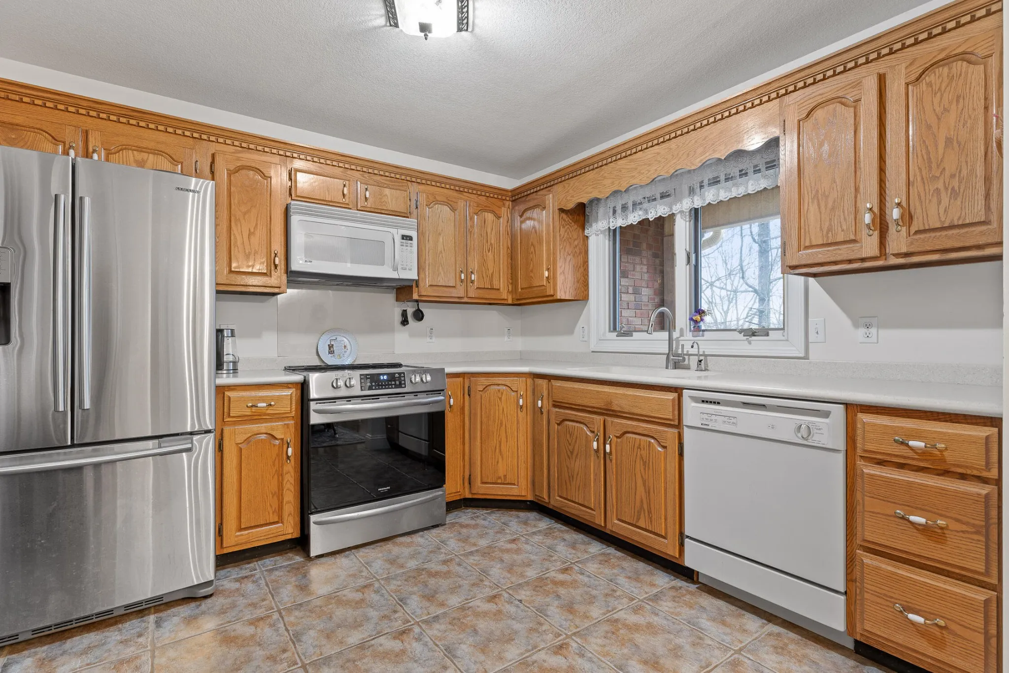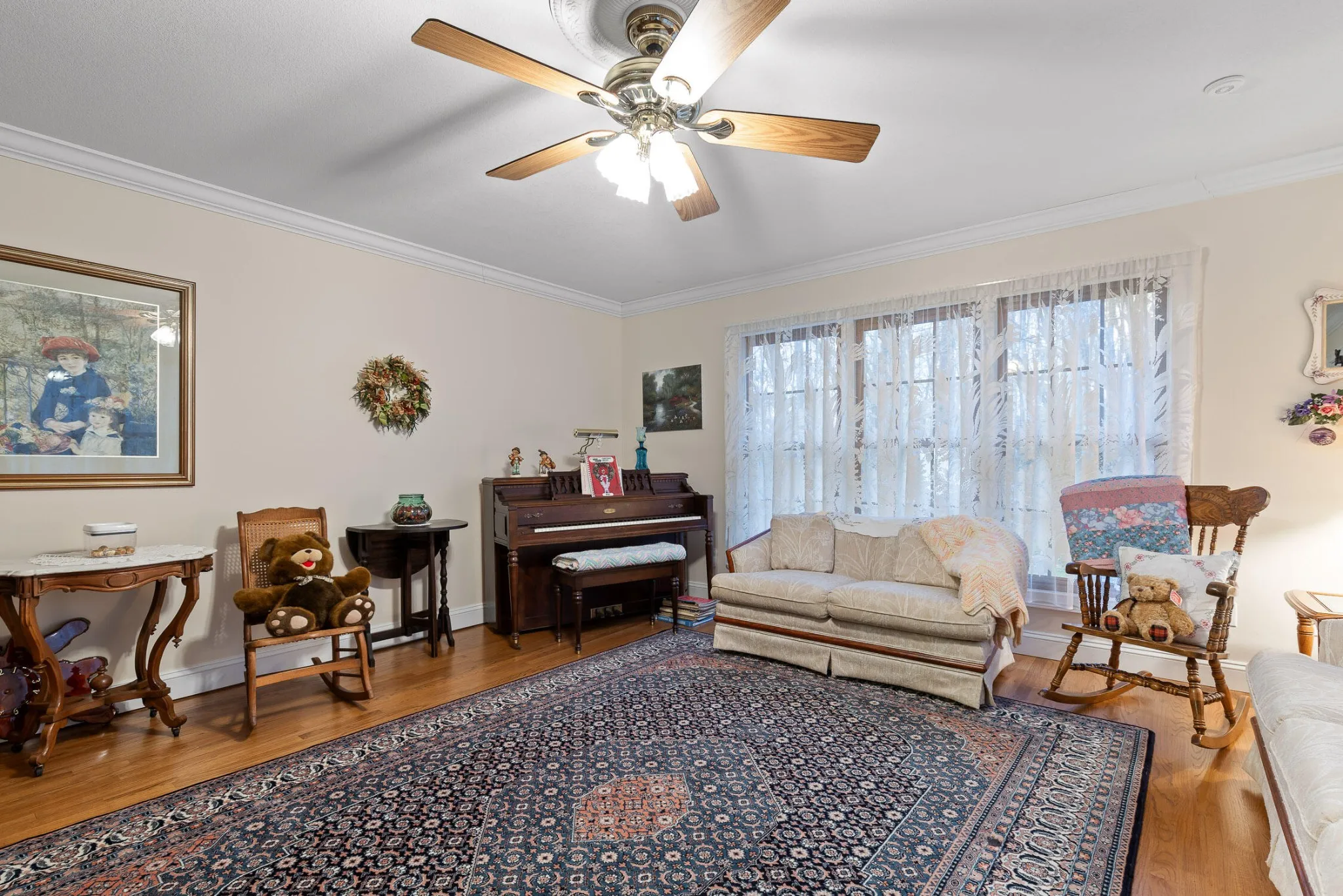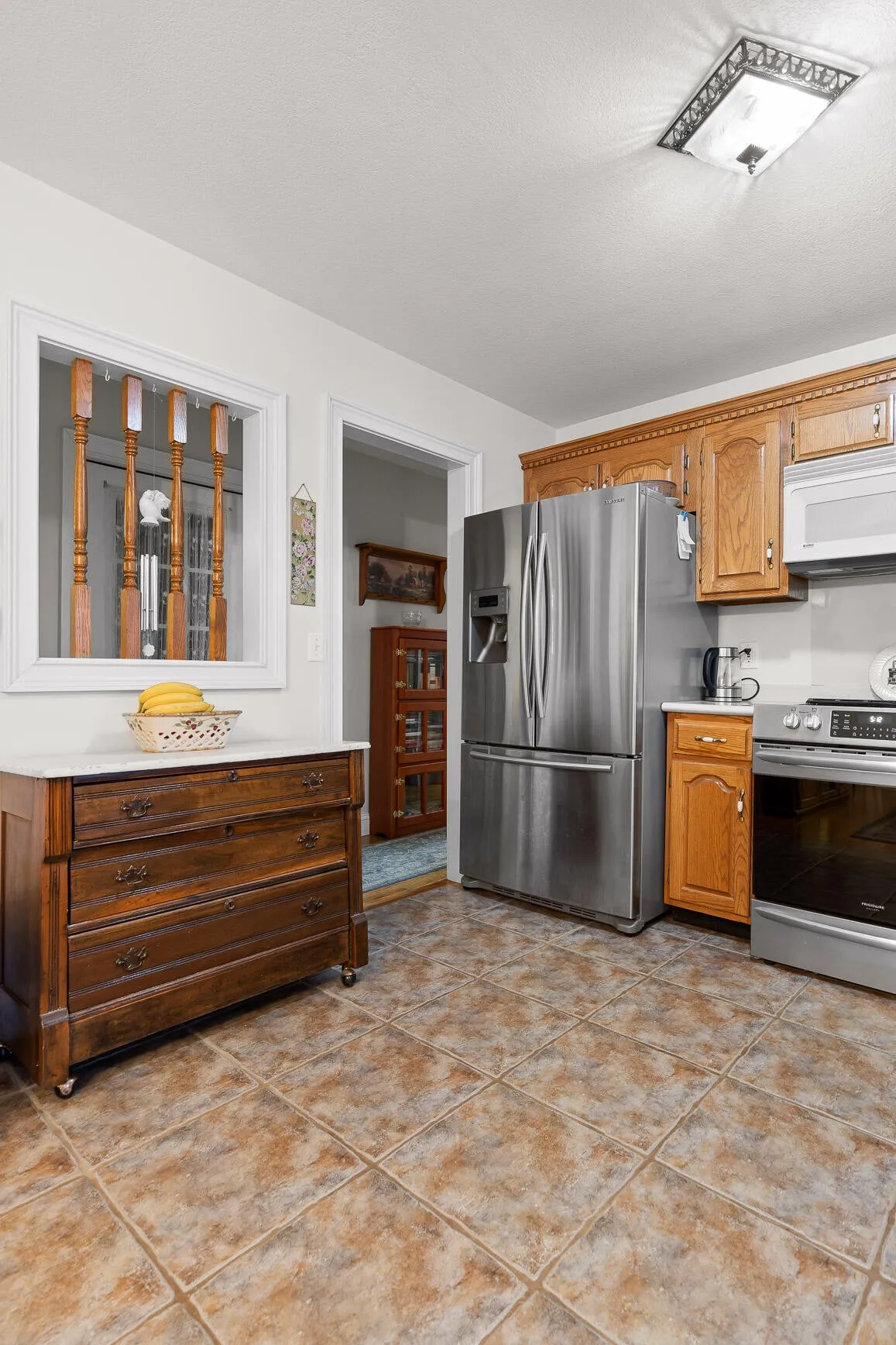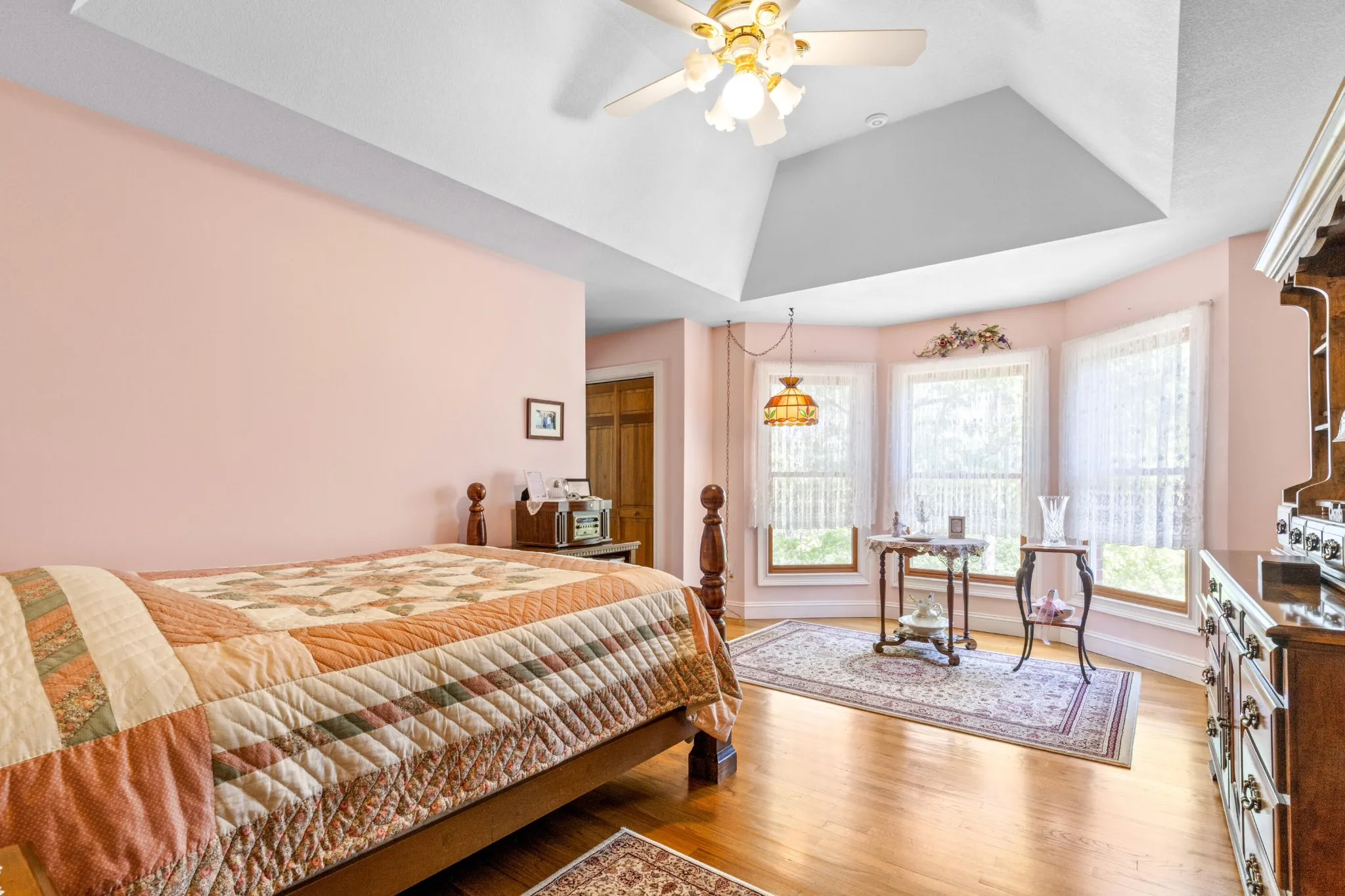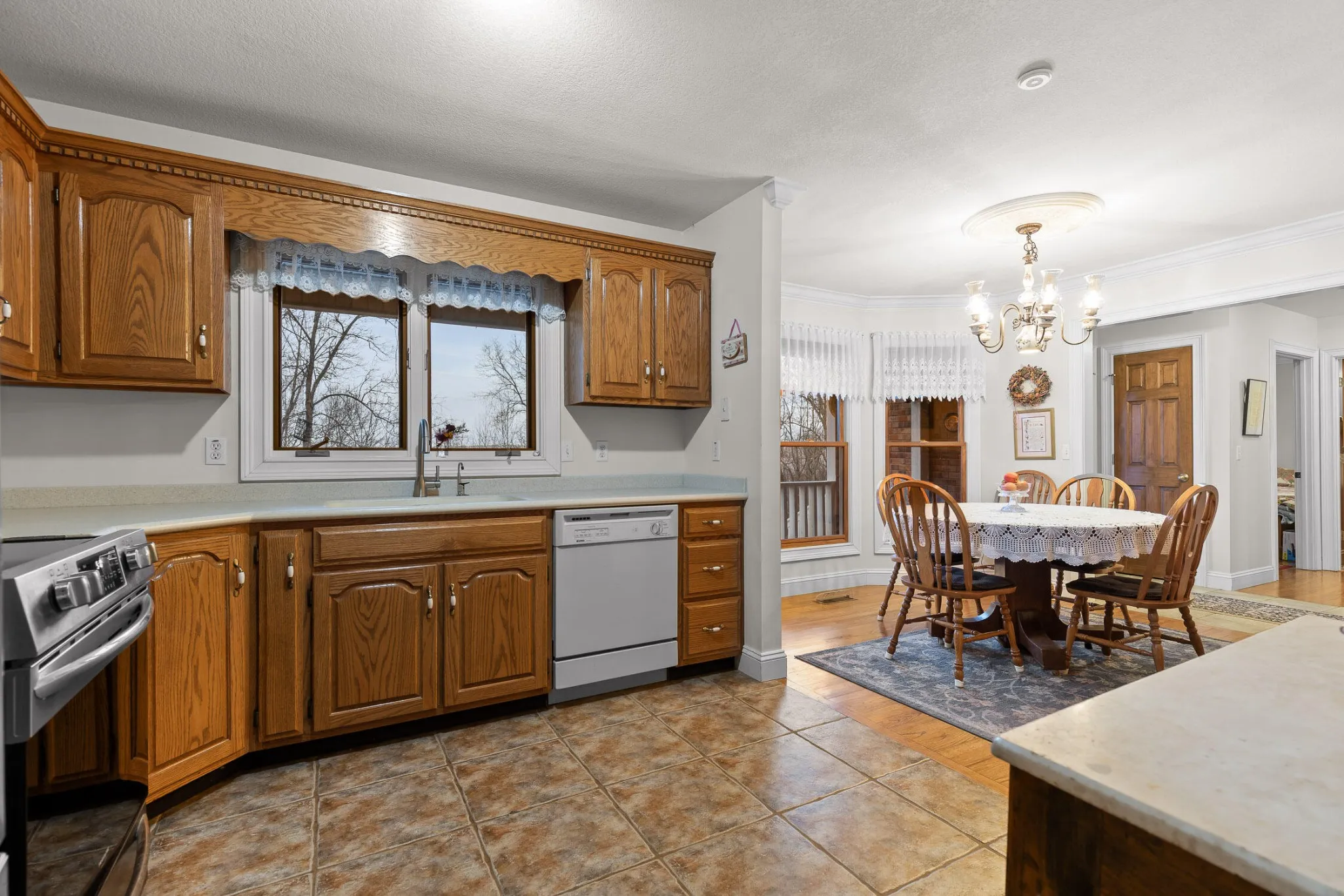 The kitchen is both functional and timeless, featuring custom oak cabinetry, generous prep space, and Corian countertops. The private primary suite offers a sitting area, bay window views, oversized walk-in closet, and a spa-like en-suite with whirlpool tub, separate shower, and dual vanities.