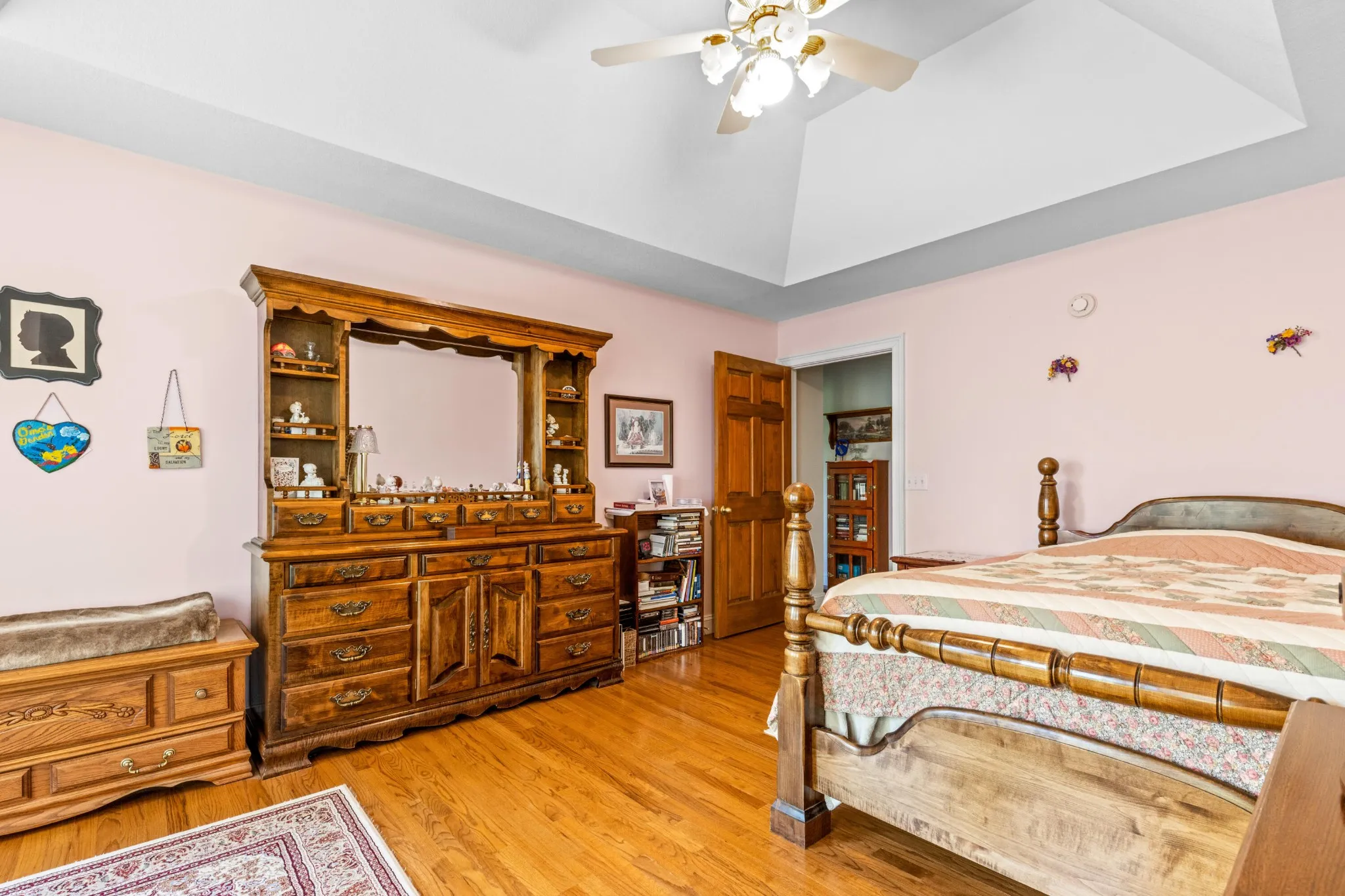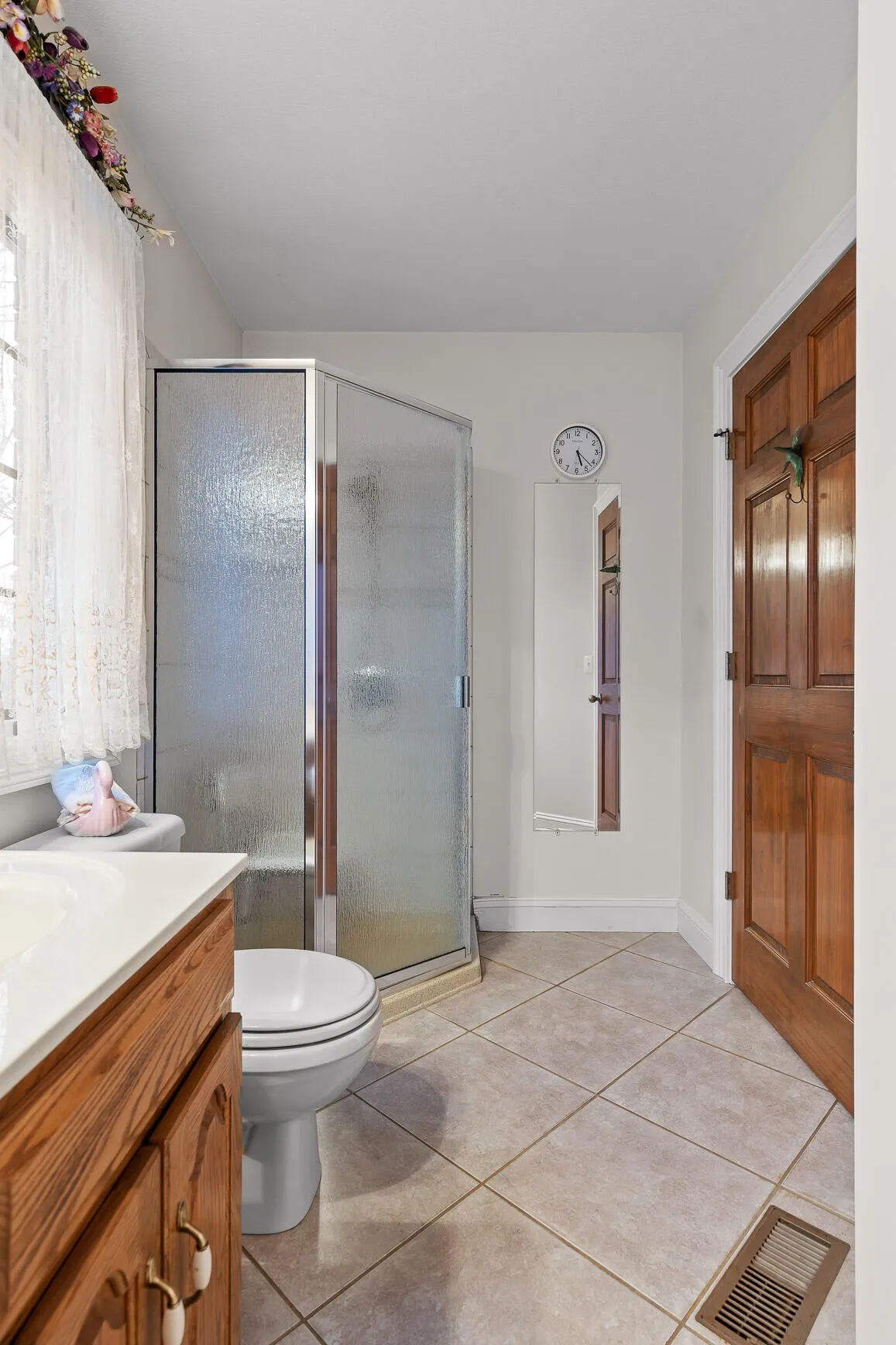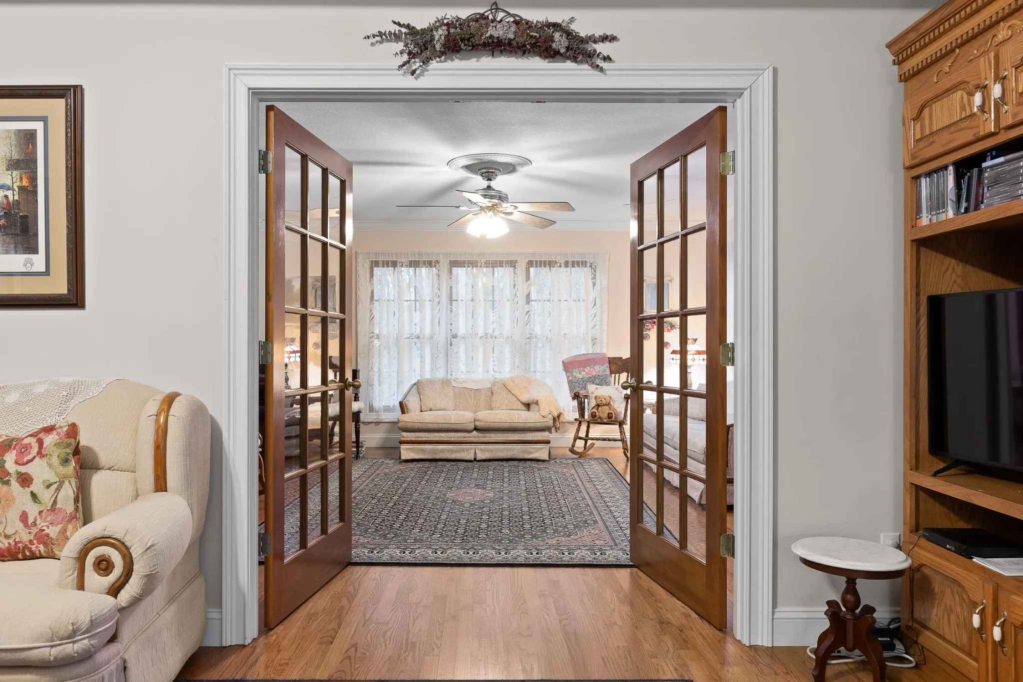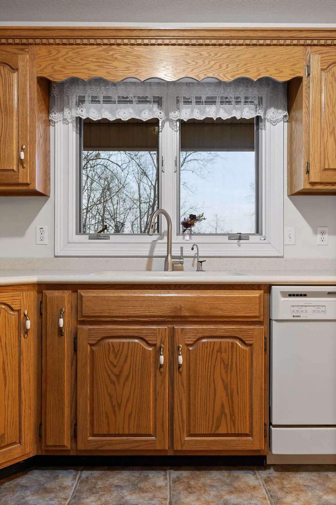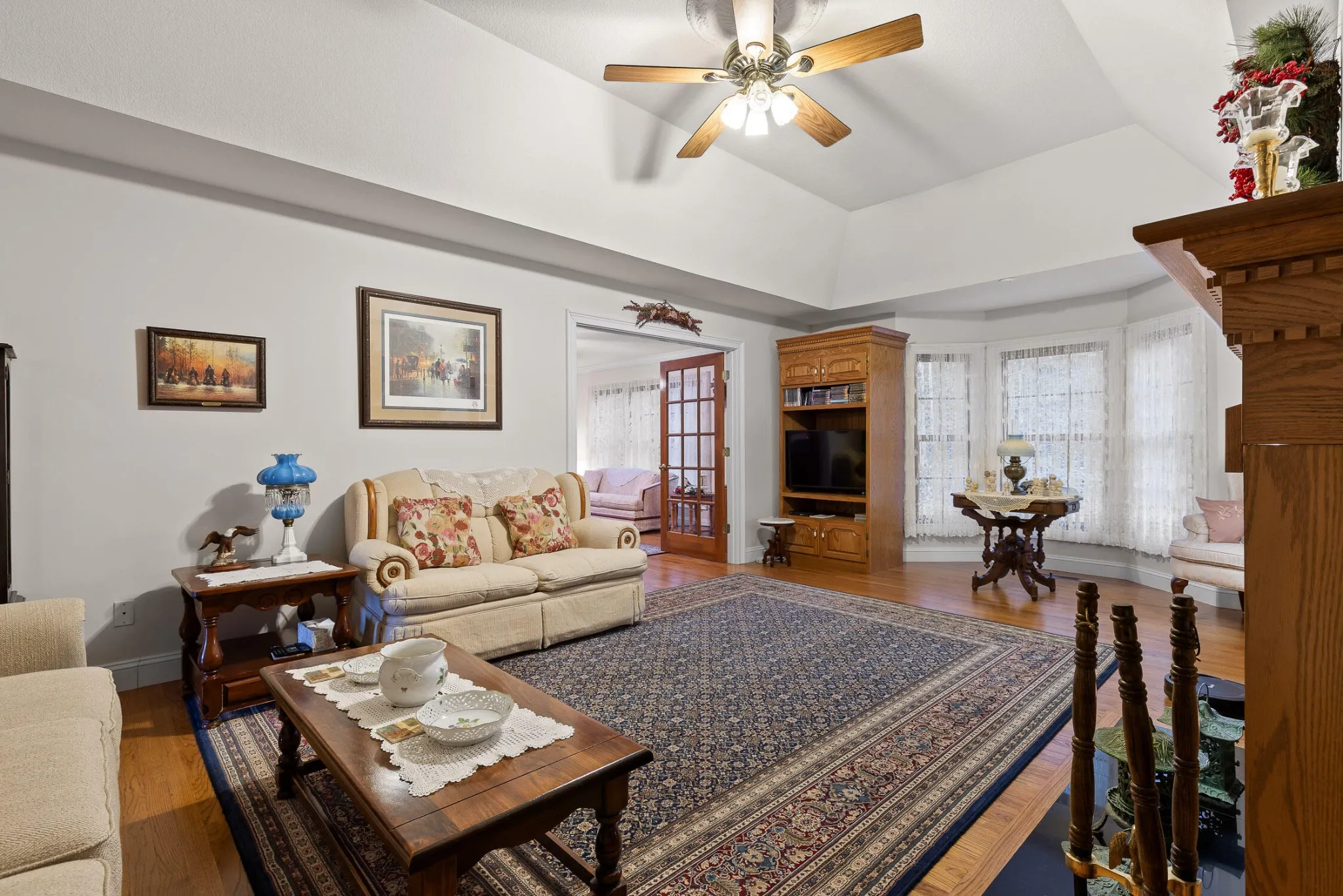 The kitchen is both functional and timeless, featuring custom oak cabinetry, generous prep space, and Corian countertops. The private primary suite offers a sitting area, bay window views, oversized walk-in closet, and a spa-like en-suite with whirlpool tub, separate shower, and dual vanities.
